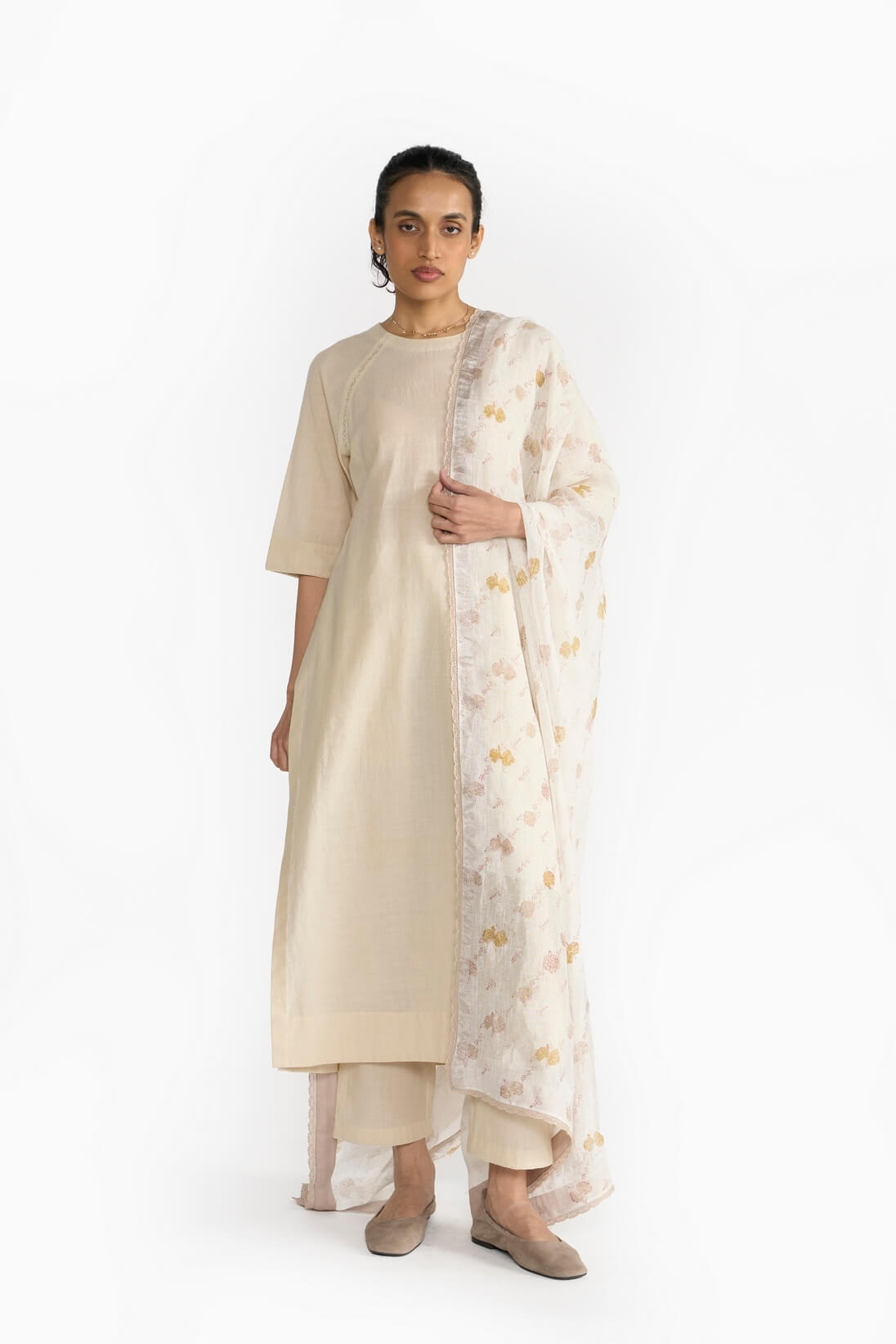 This Dupatta is an easy summer accessory made in handwoven linen featuring hand block printed “”Shadow rose”” pattern.”