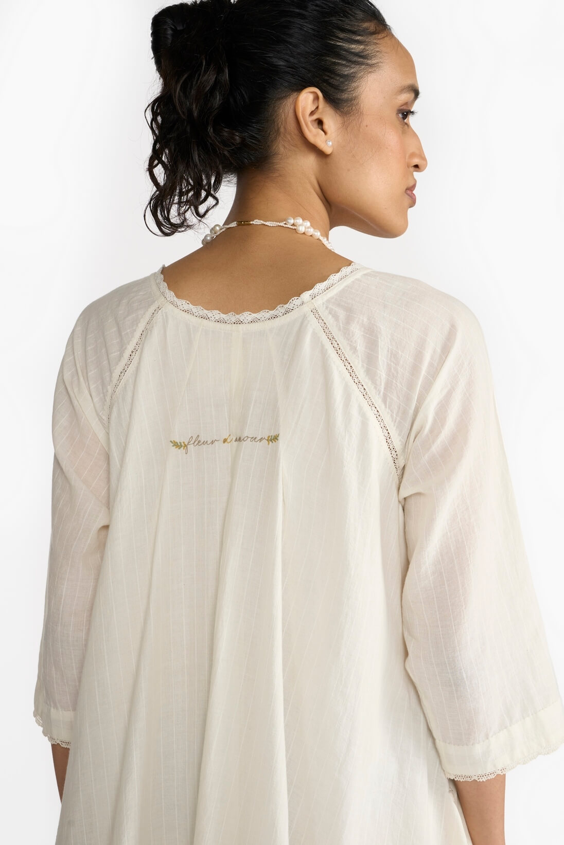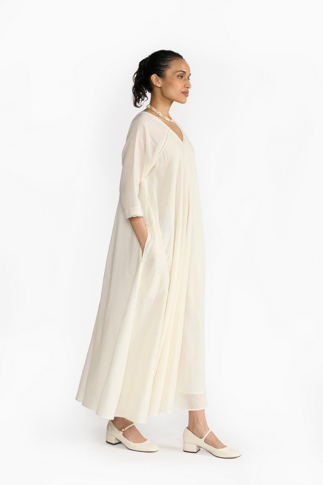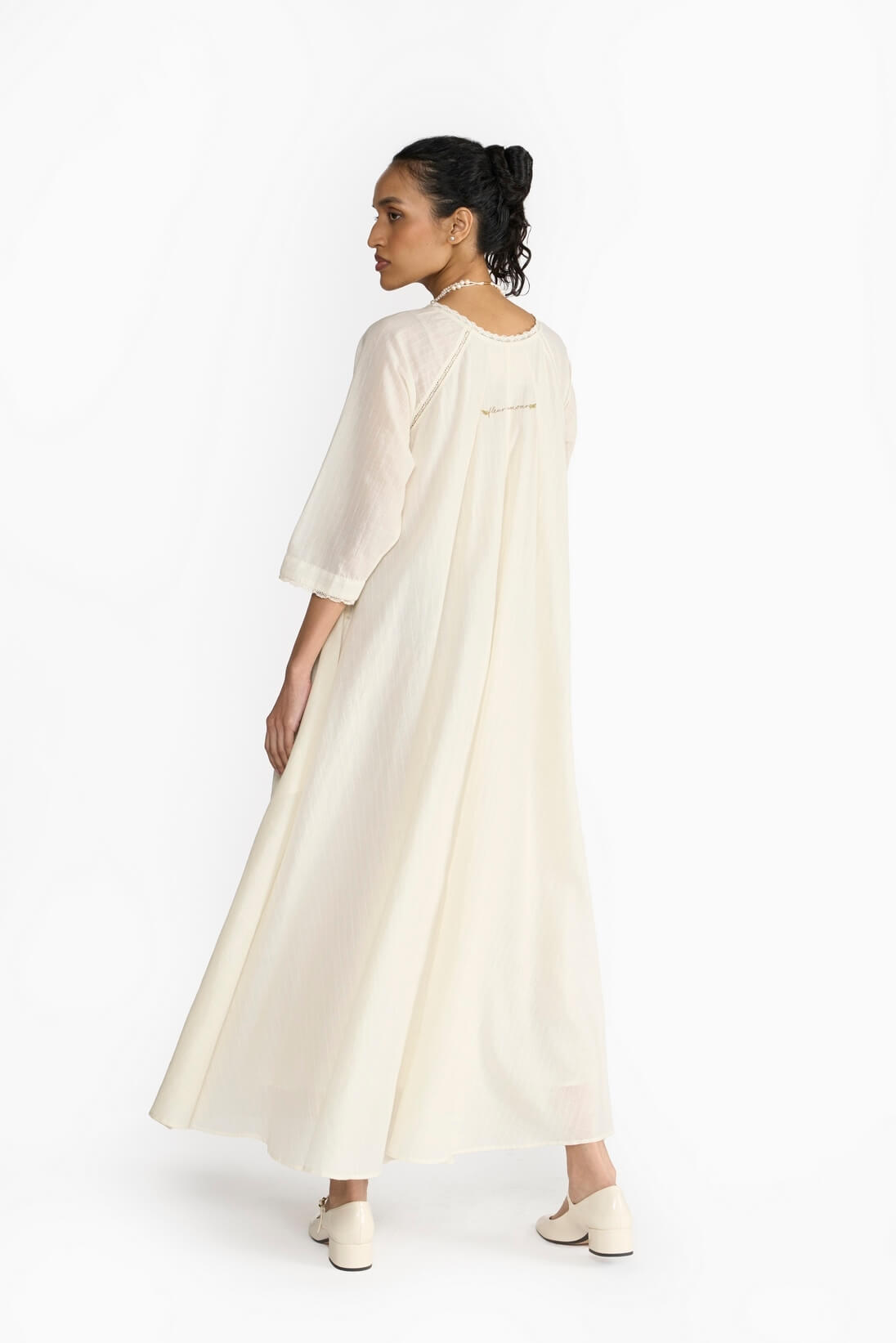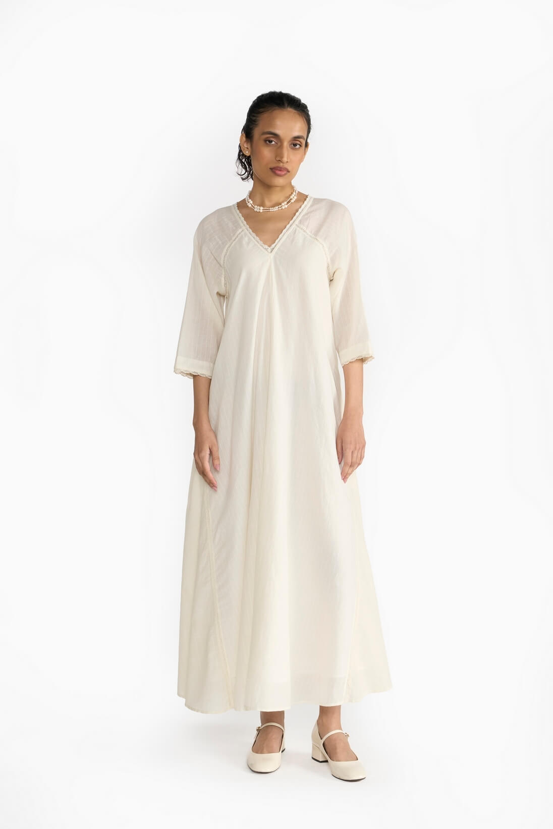 The “Sand Été Dress” features a flowing silhouette that is both flattering and relaxed with its refined fit. Crafted from the finest Khadi fabric, its earthy sand hue captures the essence of sun-kissed shores, while lace details add a touch of bohemian allure.