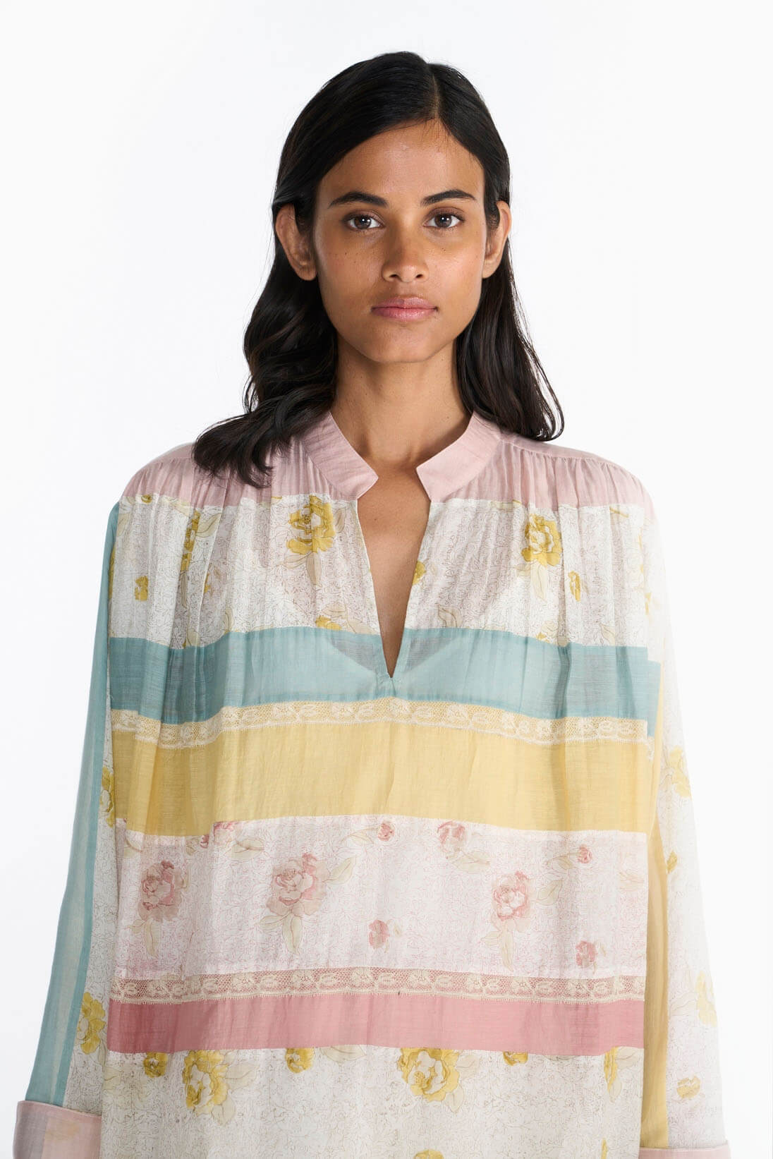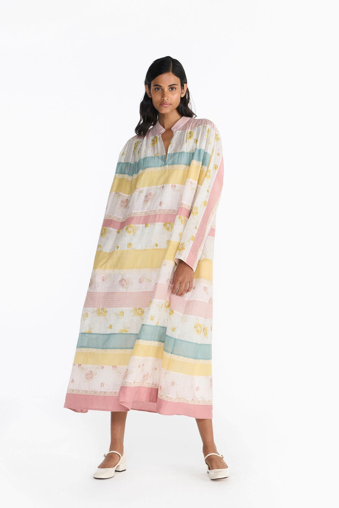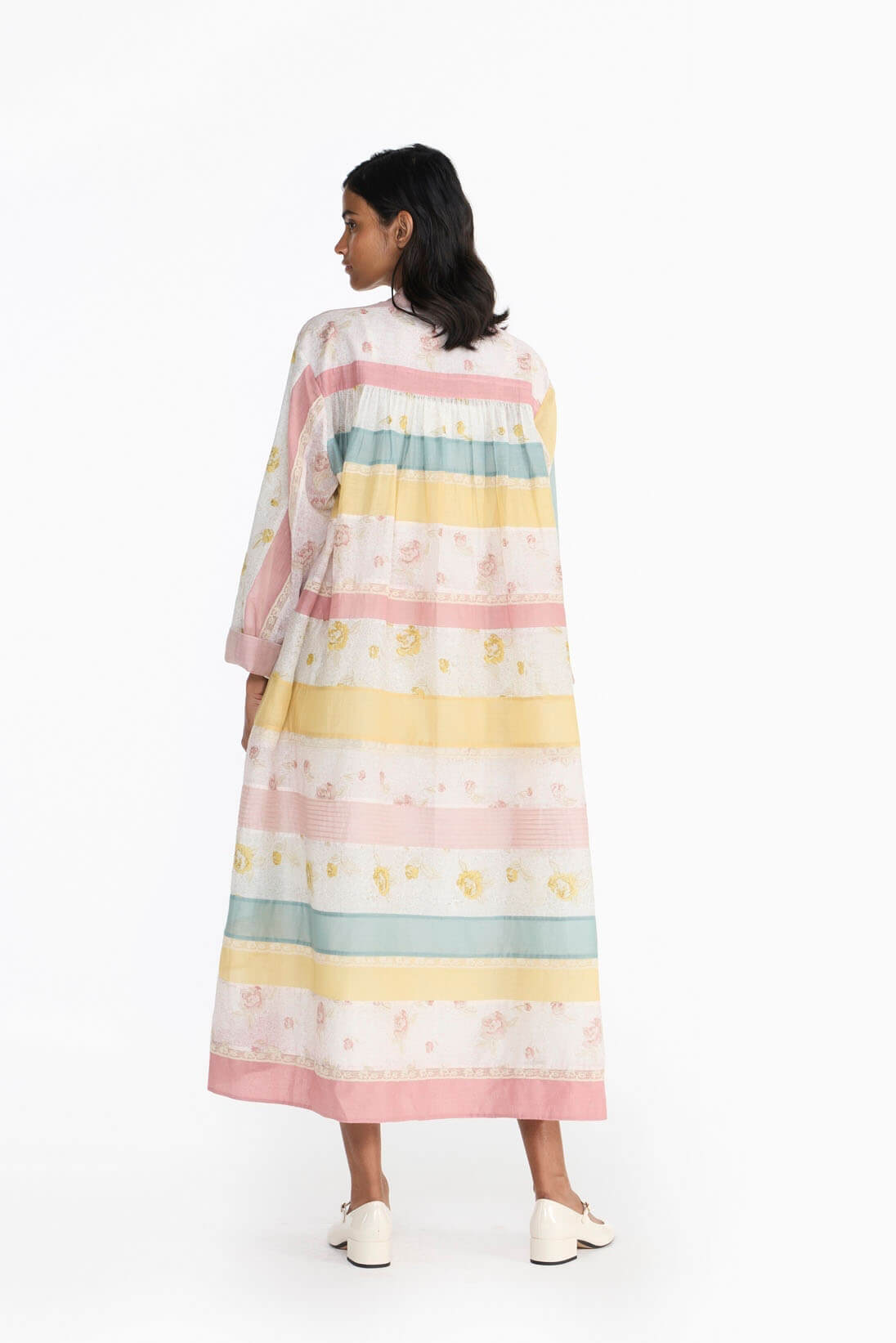 Zoé is a breezy summer dress which features fine block printed codron pattern on translucent khadi silk. Showcasing the art of tailoring by creating a unique textile through smooth joineries, fine pin tucks and delicate lace insertions.