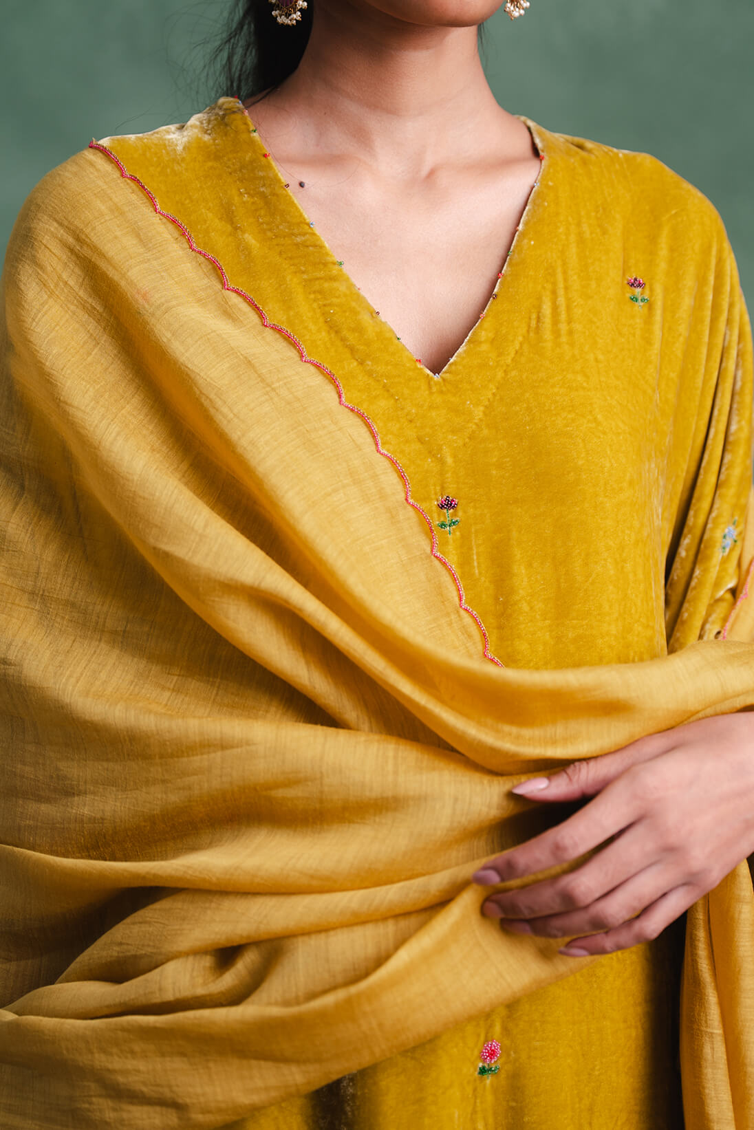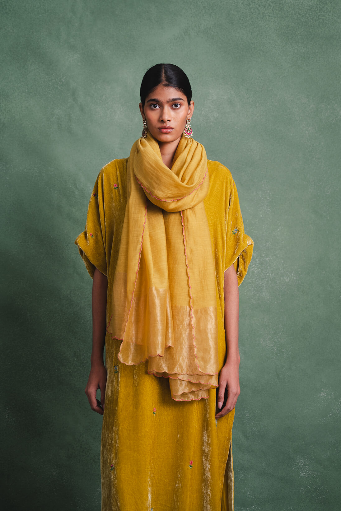 Soft handspun handwoven khadi silk dupatta in bright ceylon yellow color finished with compliemntary colored beads and zari scallops