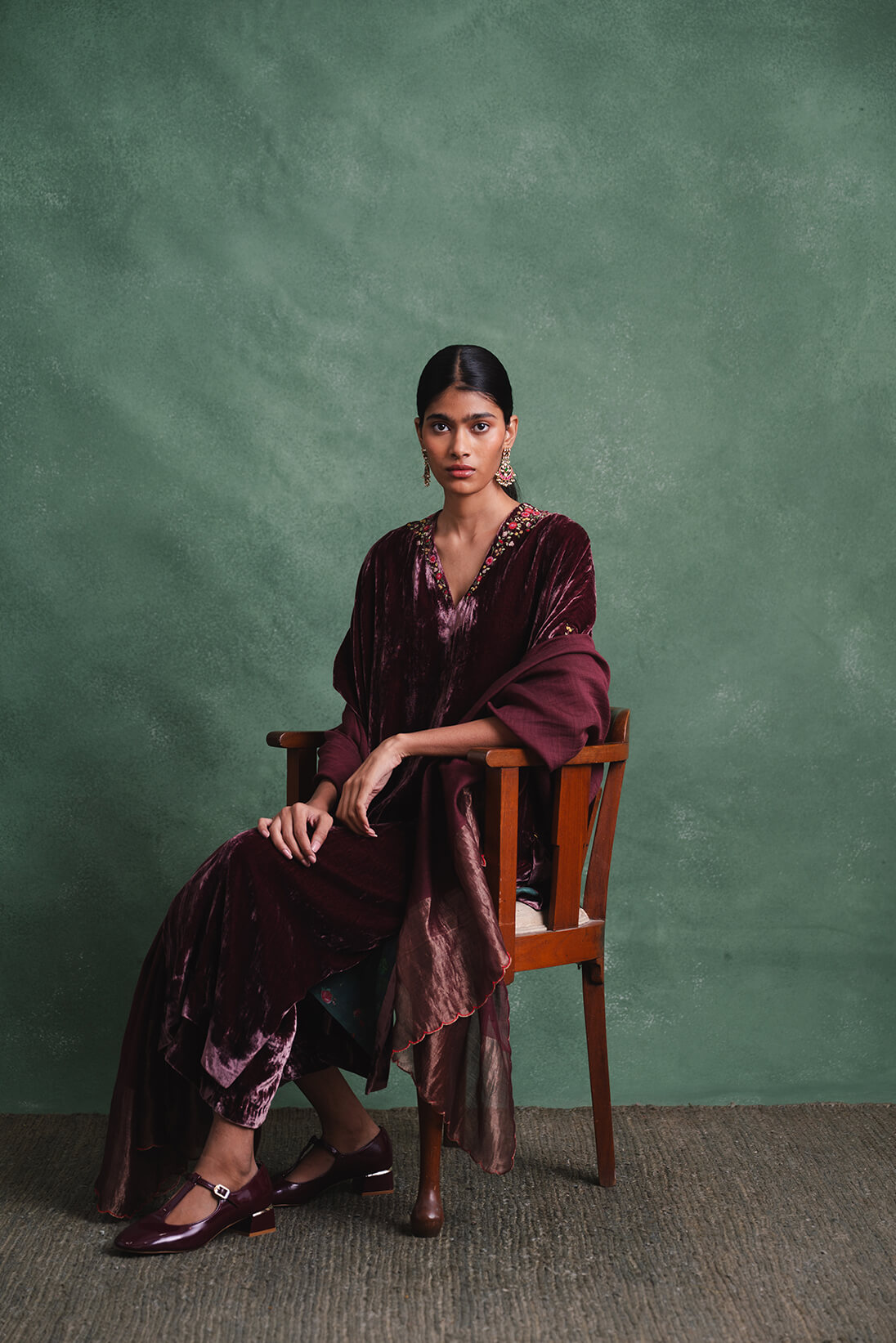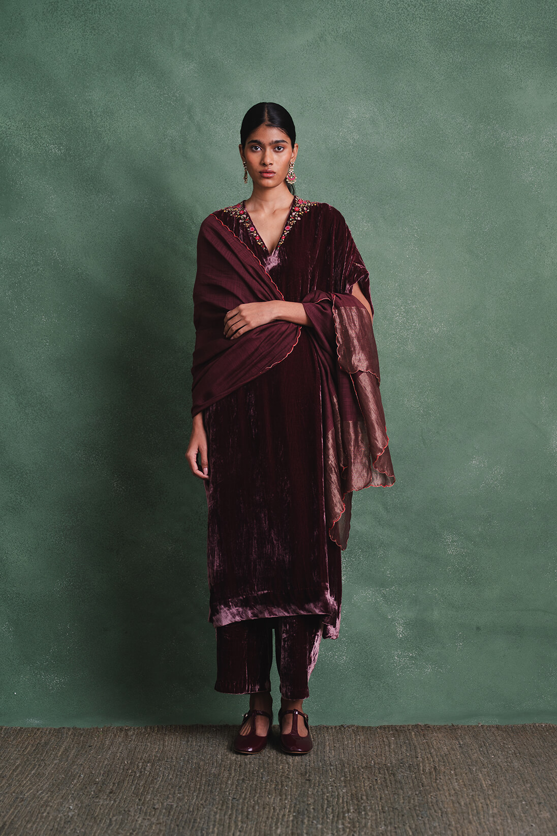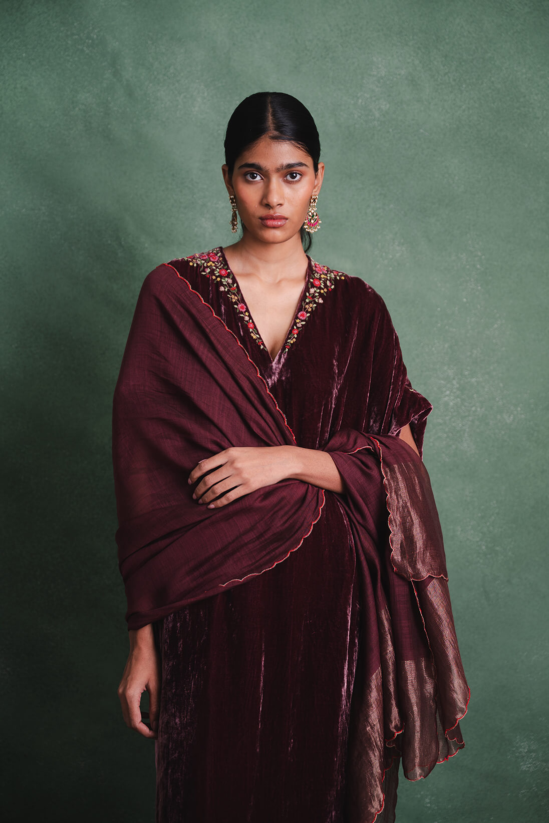 | Disclaimer | Soft handspun handwoven khadi silk dupatta in deep pecan color finished with compliemntary colored beads and zari scallops |