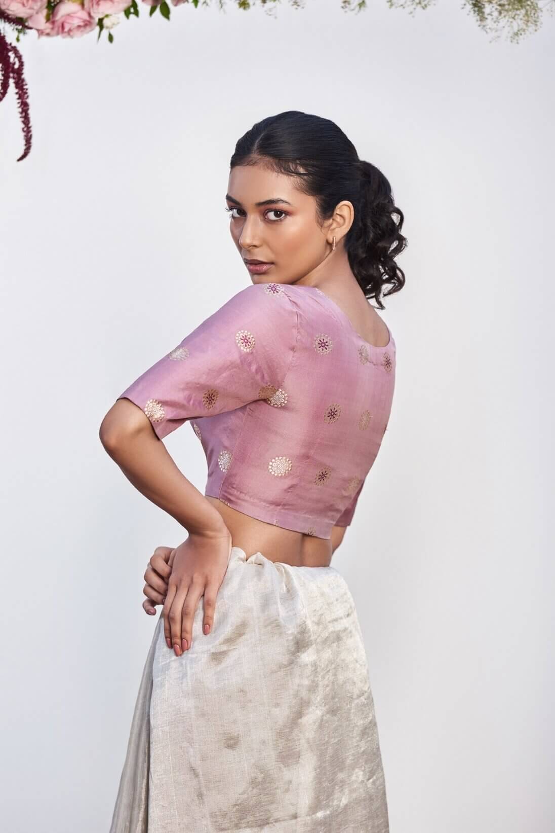 detailed khadwa work from varanasi makes this handwoven satin blouse a classic.