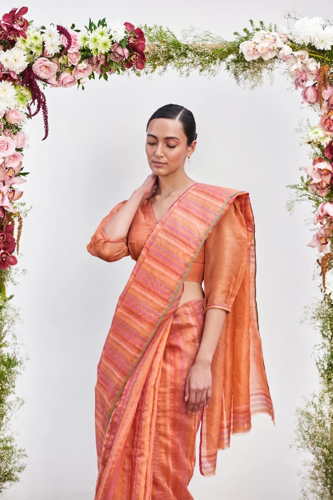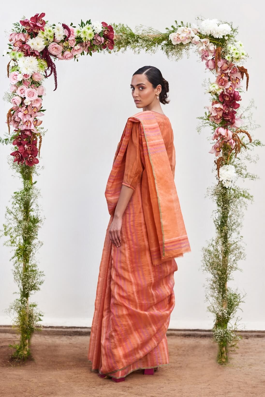 - Dew Flower Organza Stripe Sari