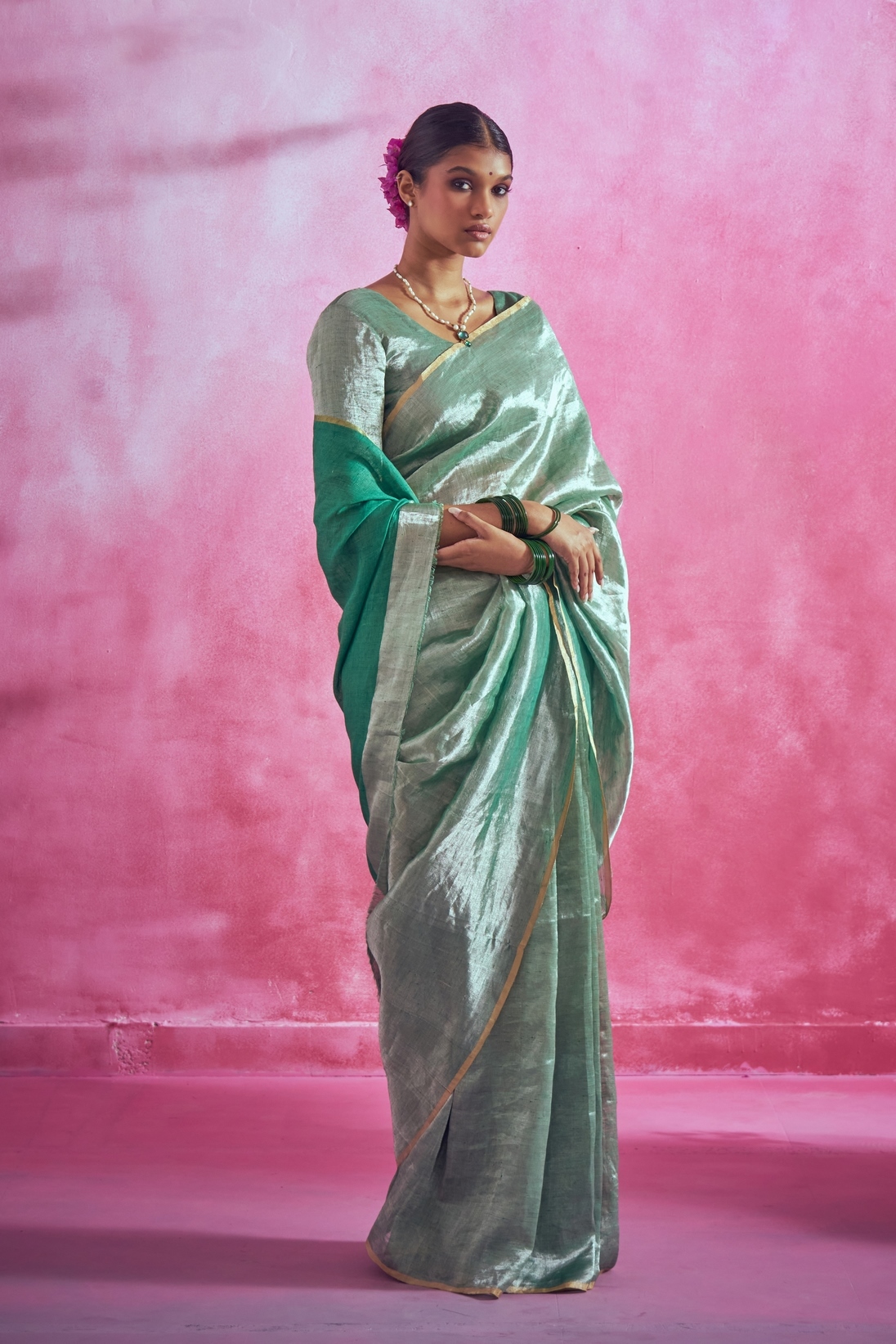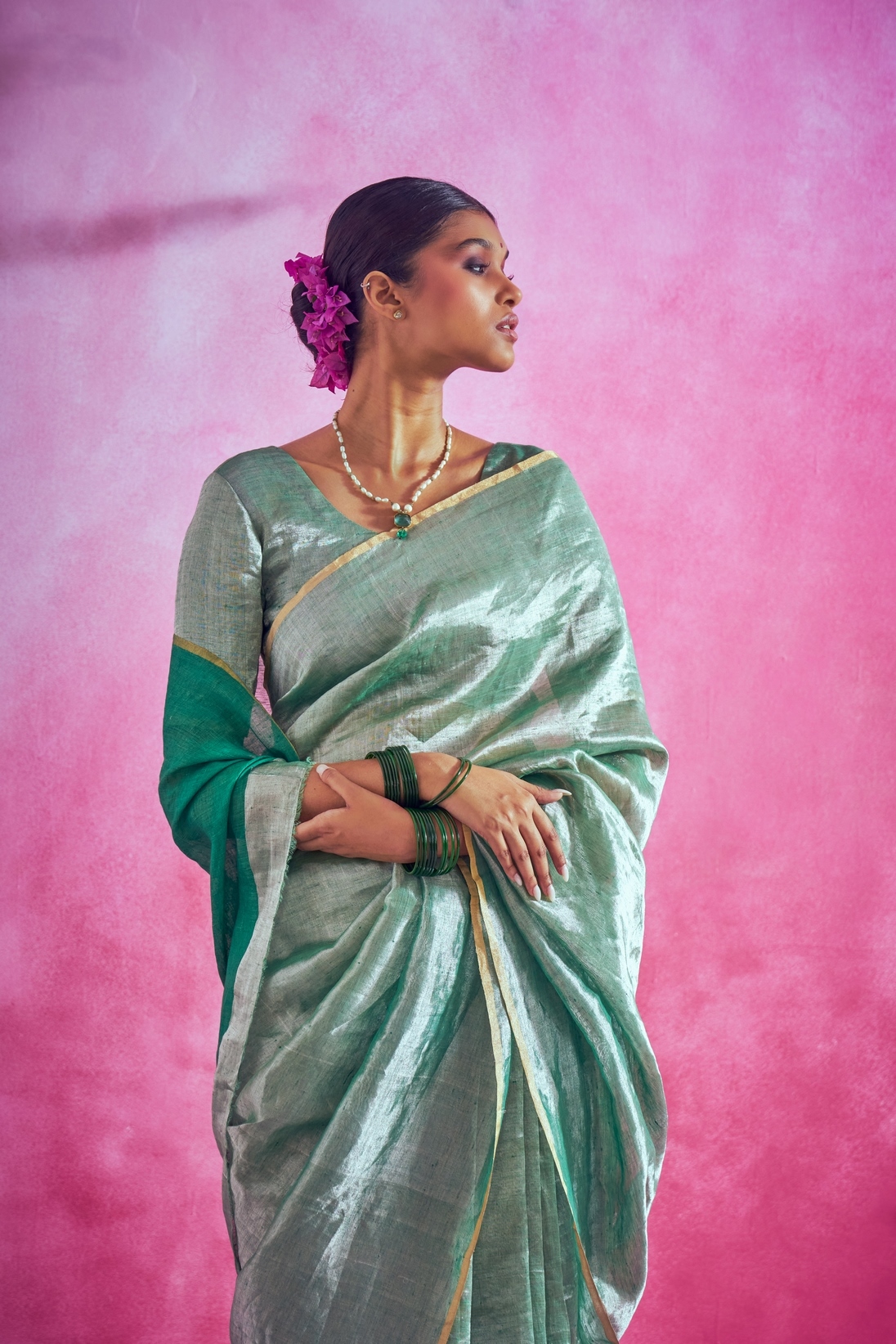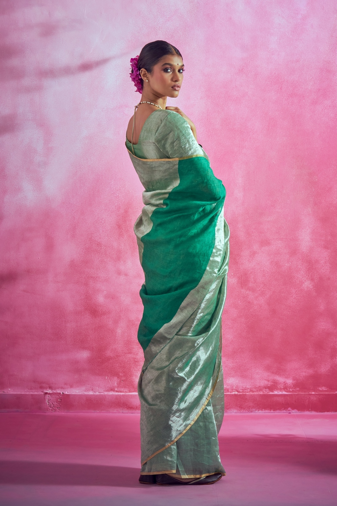 A beautiful interplay of zari and linen makes this classic sari a must have festive attire.
