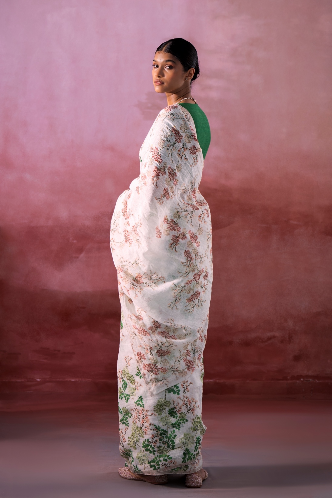 Soft floral prints on ivory linen makes this sari versatile and desirable.