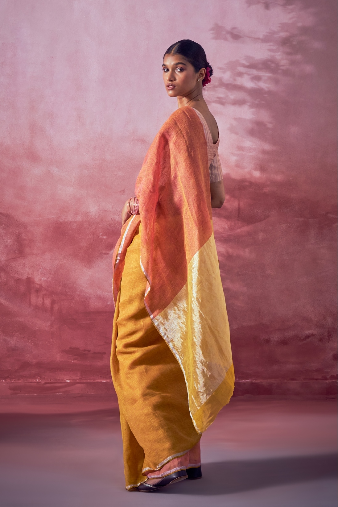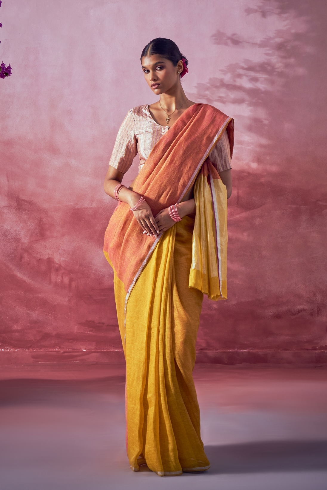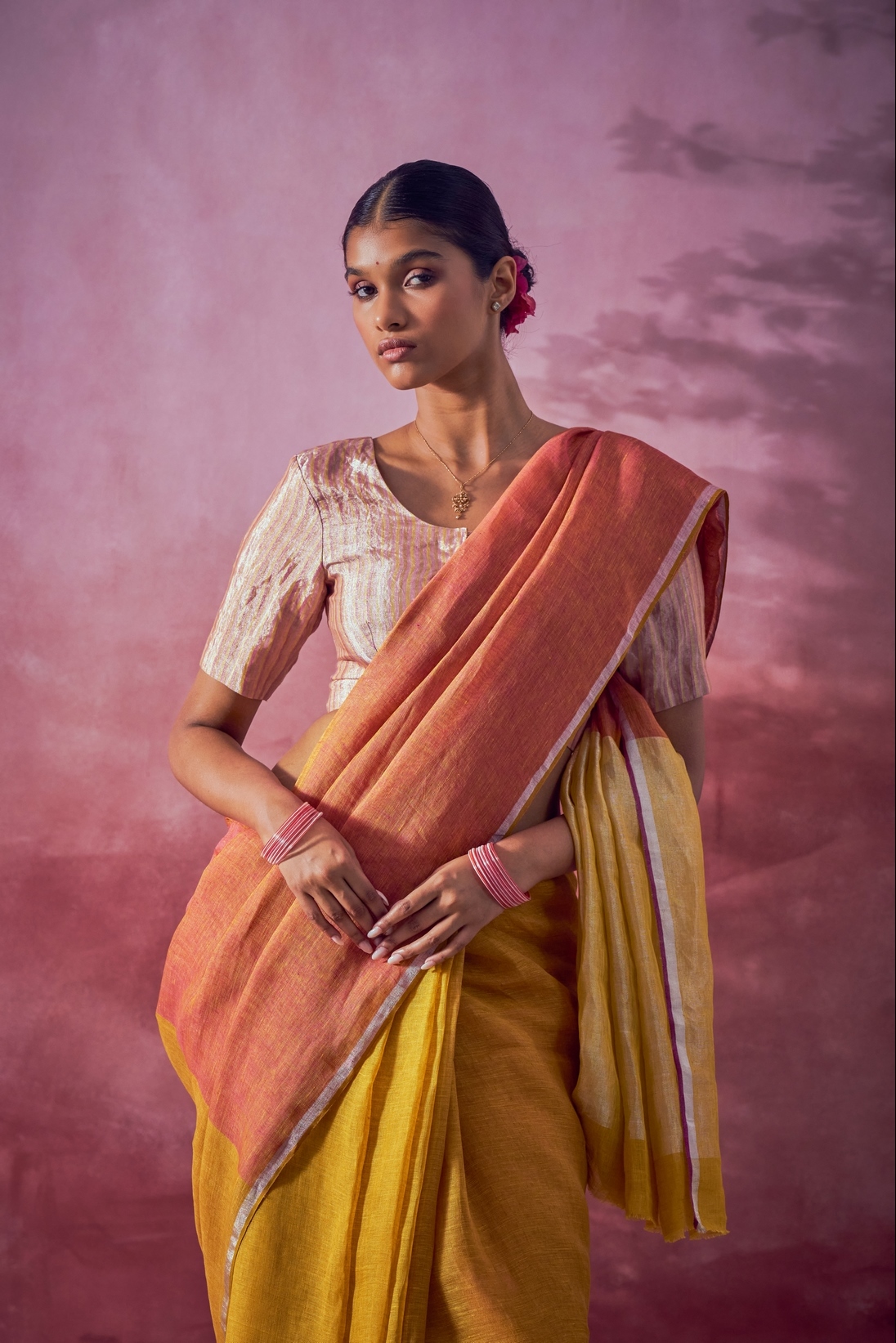 The graded linen sari comes with separate one meter striped zari blouse fabric as shown in the picture. Sari Length – 5.5 meter
