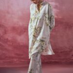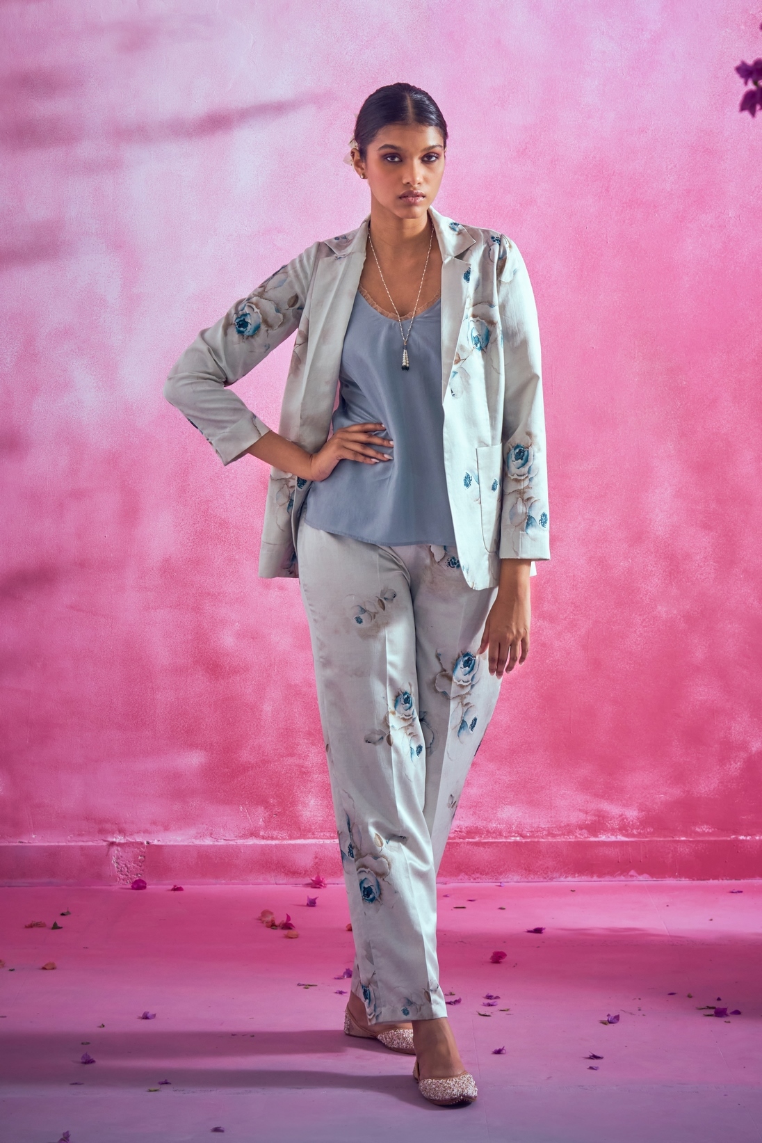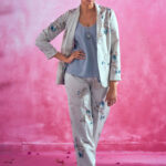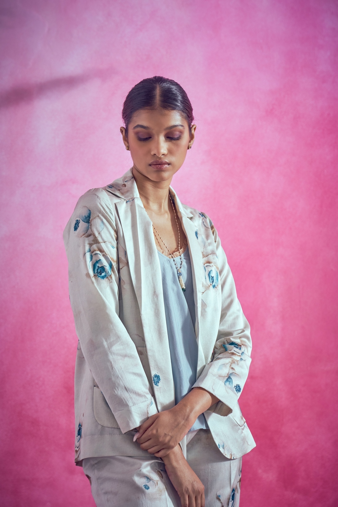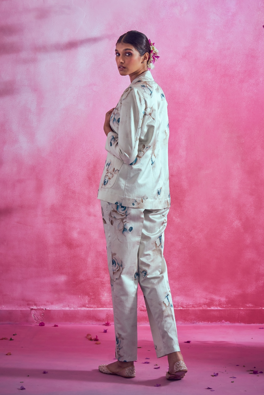 This short jacket in handwoven satin can be worn with a sari and a trouser alike.