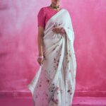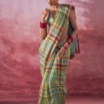 The plaid linen sari comes with separate one meter striped zari blouse fabric as shown in the picture. Sari Length – 5.5 meter