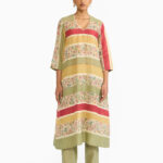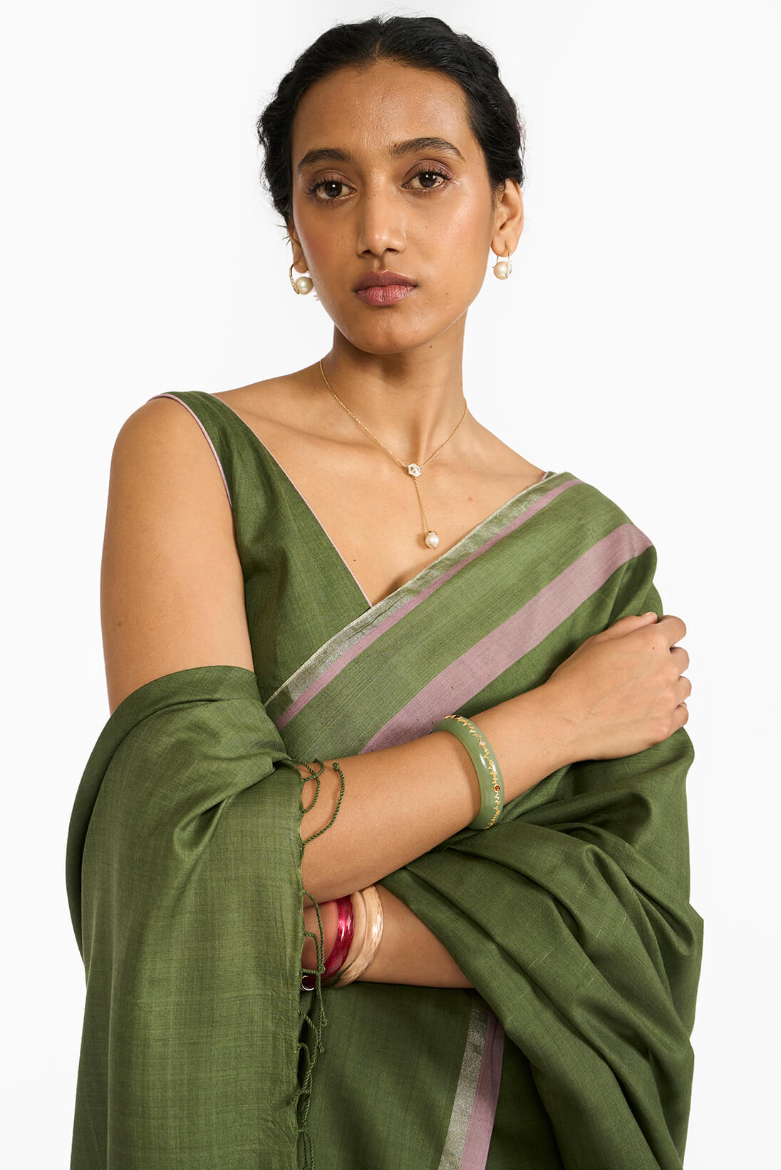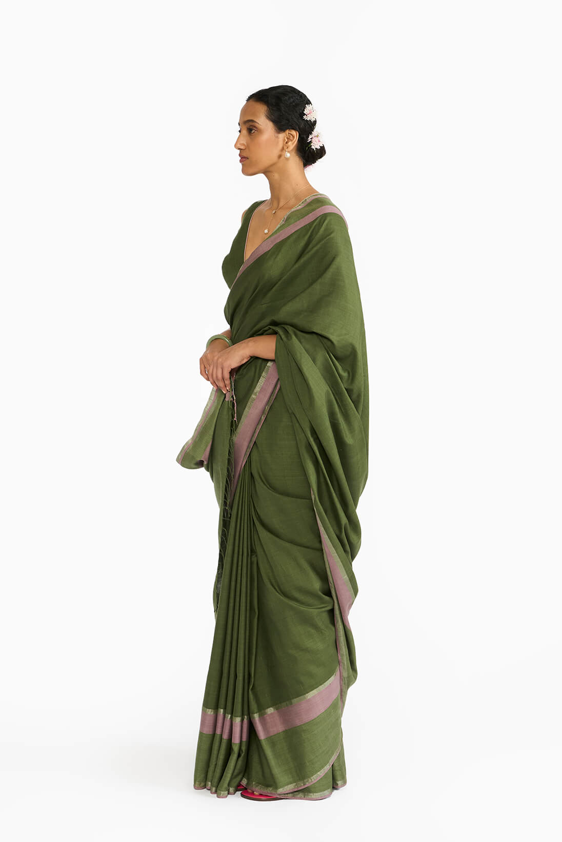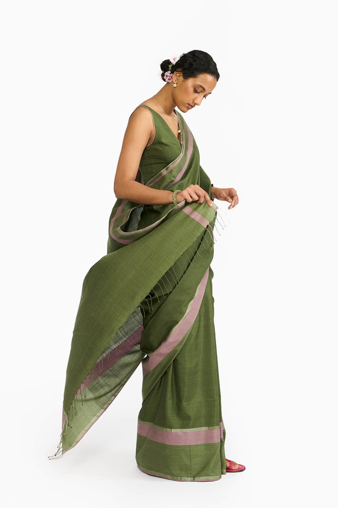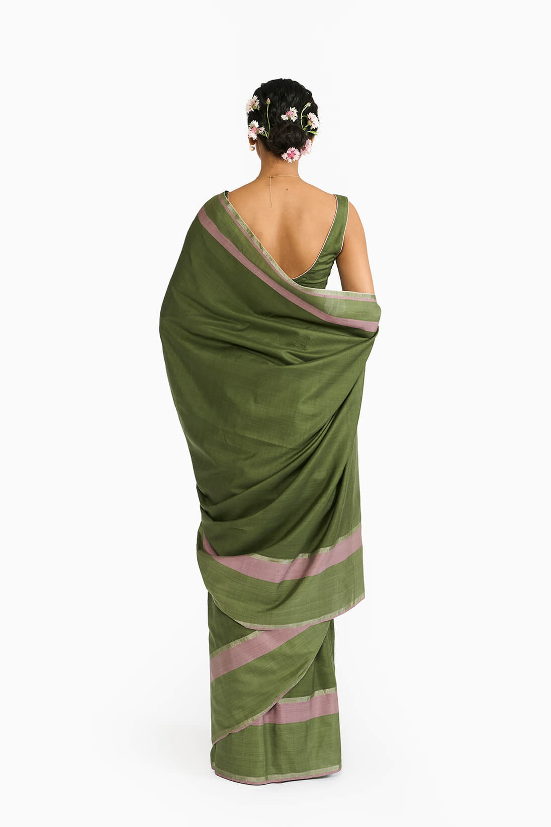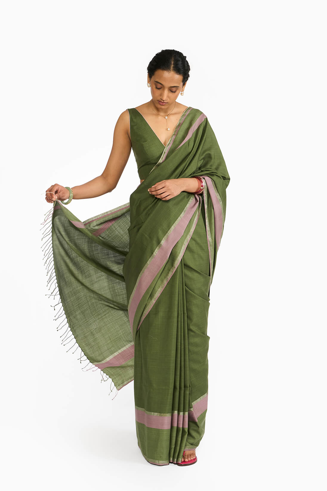 The “Basil Sari” draws inspiration from the basil plant, featuring a gradient of green, purple and earthy tones. Handspun silk enhances the texture of this sari with its natural sheen. An easy sari to be worn through the day.