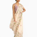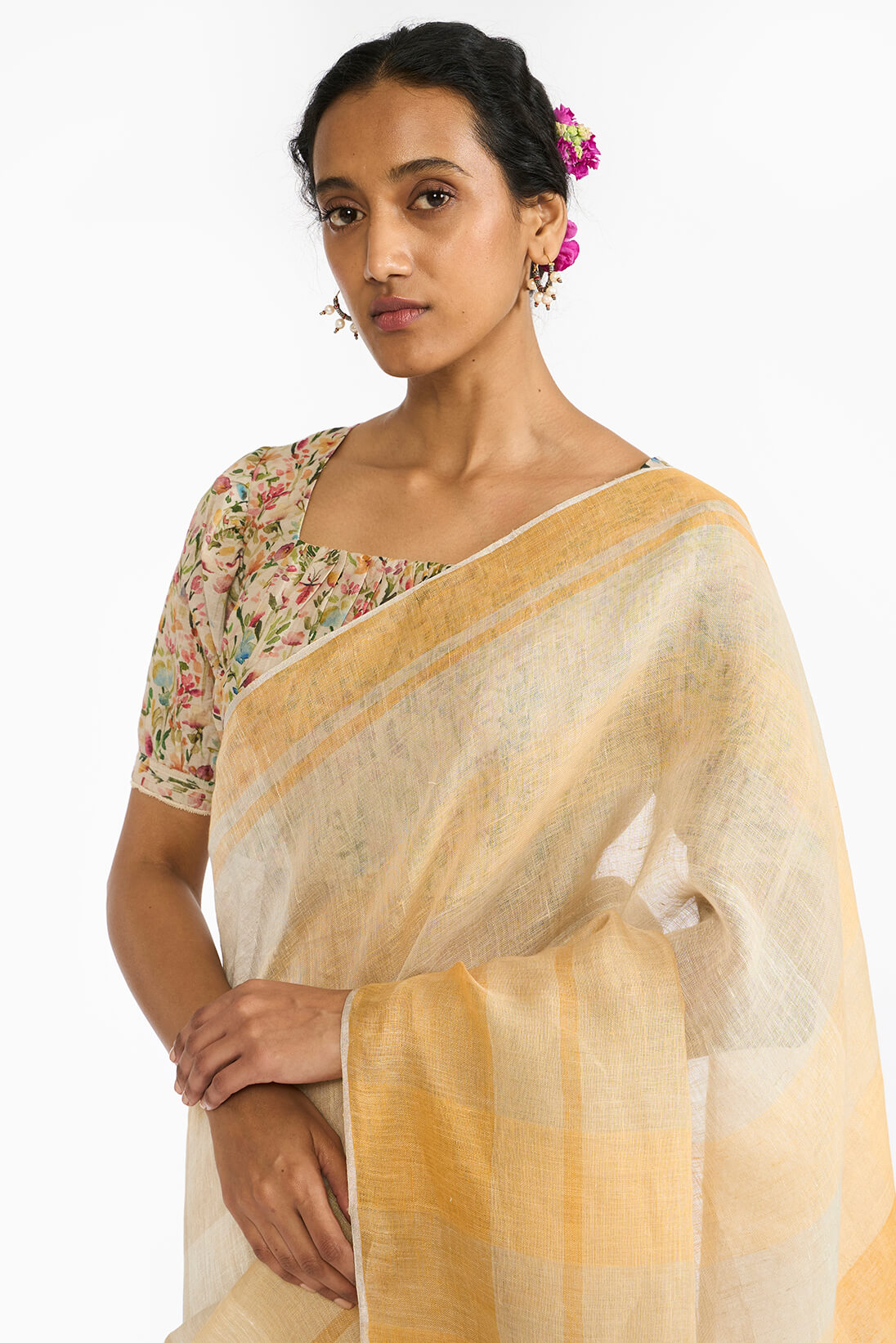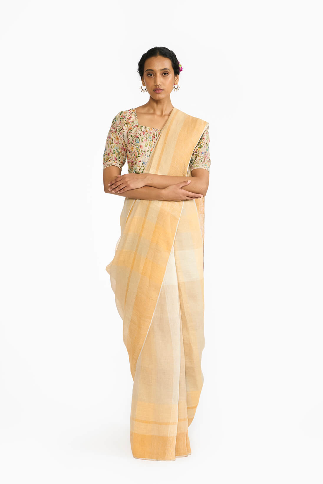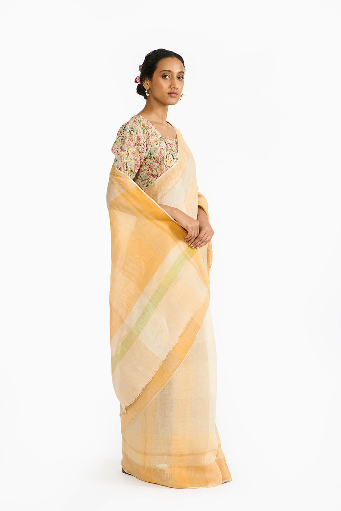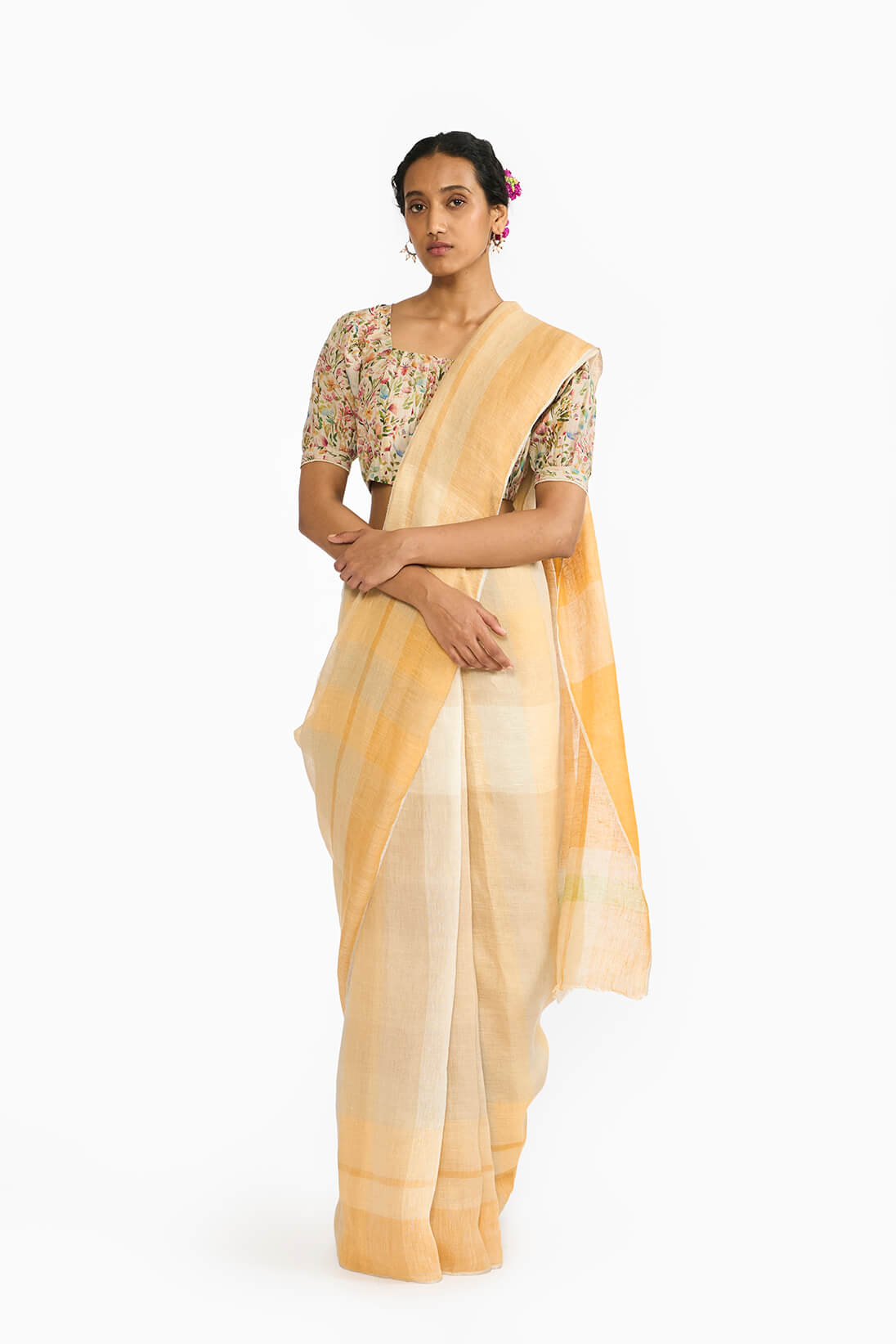 The “Calla Lily Sari” draws from the colors of the plant, featuring a gradient of ivory and beiges merging into yellow tones and highlightd with green. Handwoven linen enhances the texture of this sari with its natural fall. An easy sari to be worn through the day.