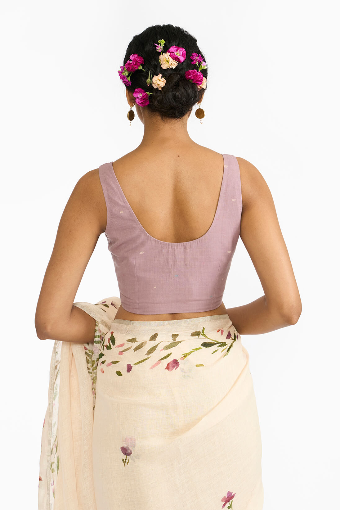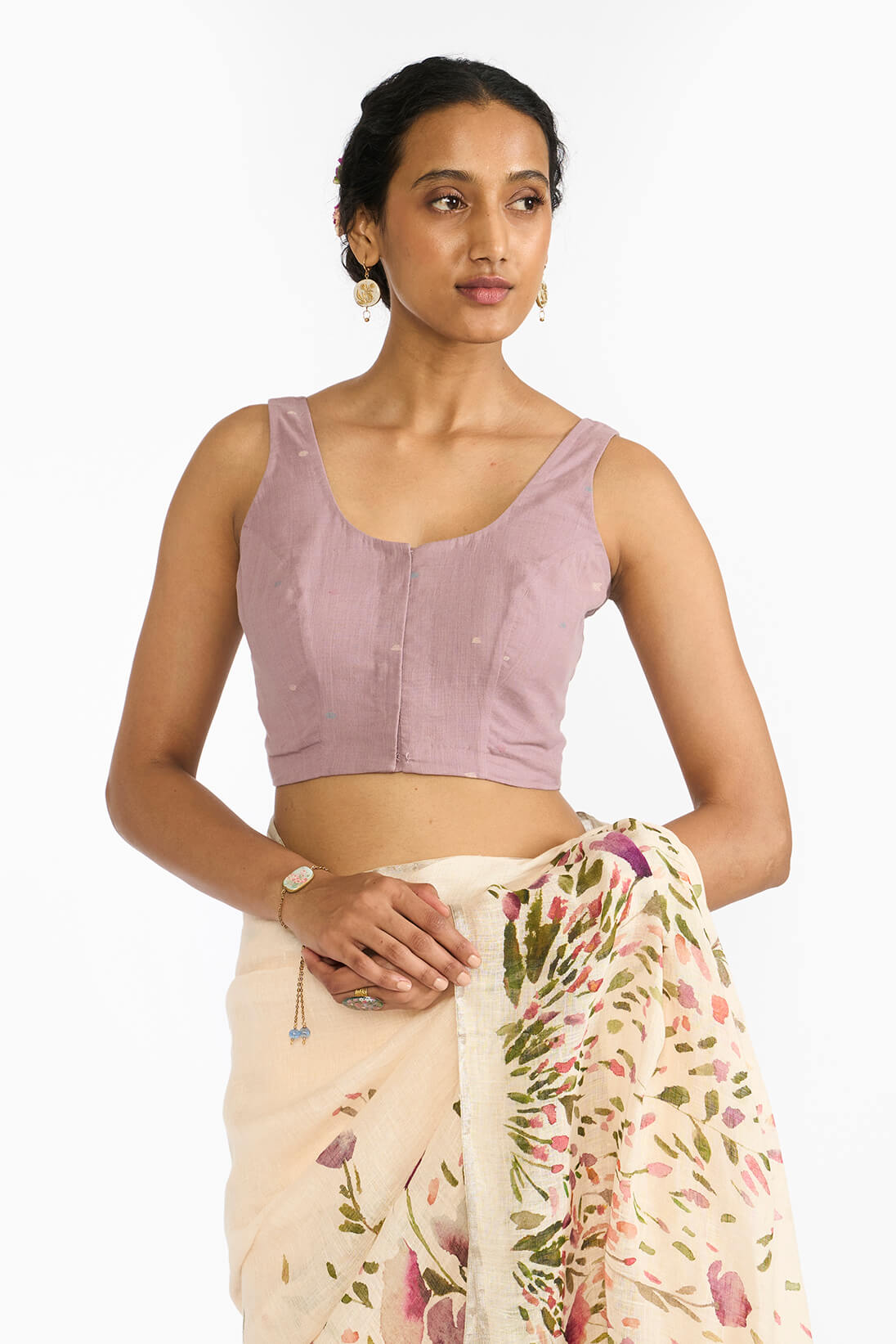 Lavender blouse showcases fitted bodice silhouette crafted in fine lavender handspun handwoven cotton with woven unique scattered jamdani motifs.