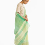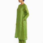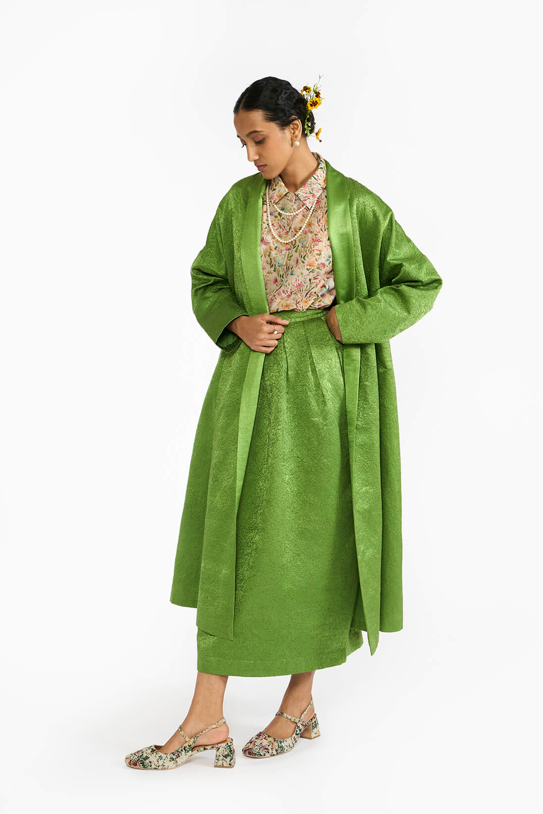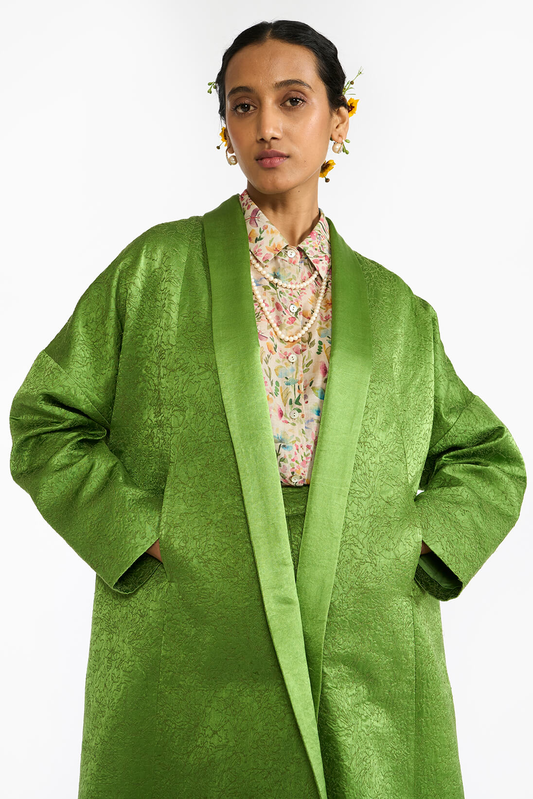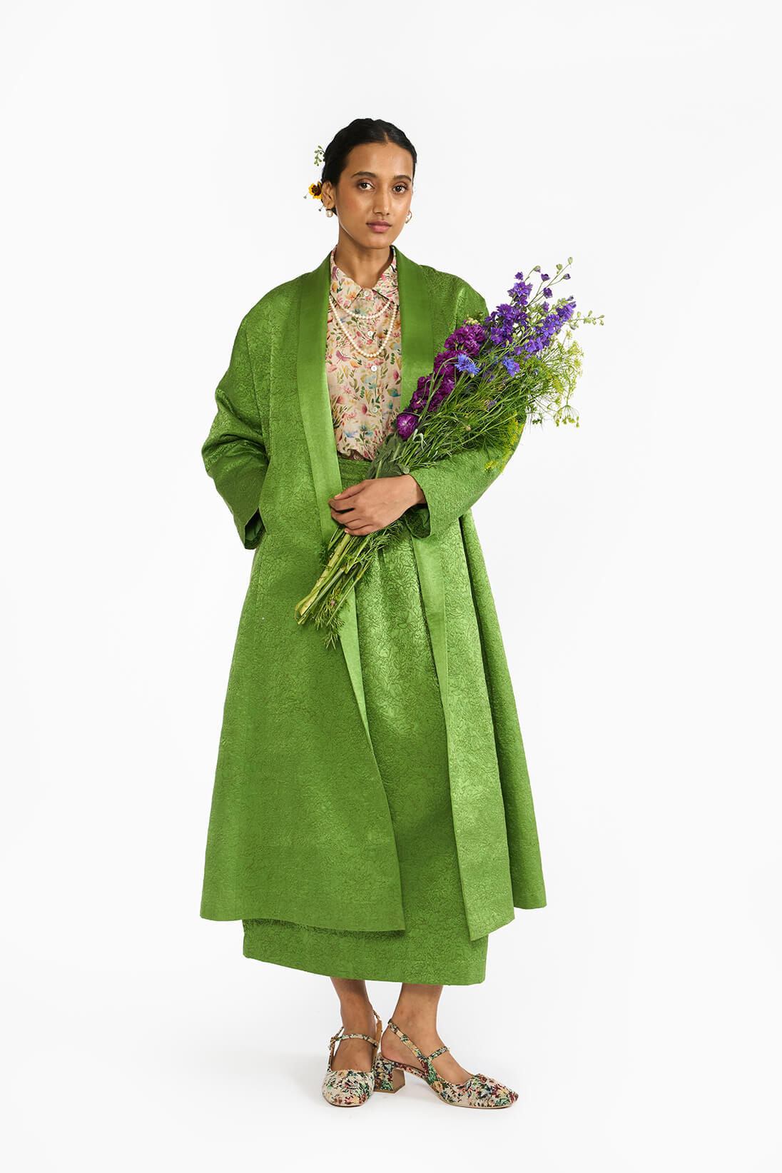 The “Lemon Leaf Jacket” features a handwoven silk satin textile in a vibrant bright green is quilted with an abstract floral pattern, creating a distinctive texture. The silhouette showcase a classic A-line cut with a shawl callor and easy fit, giving a modern twist to the timeless overcoat style.