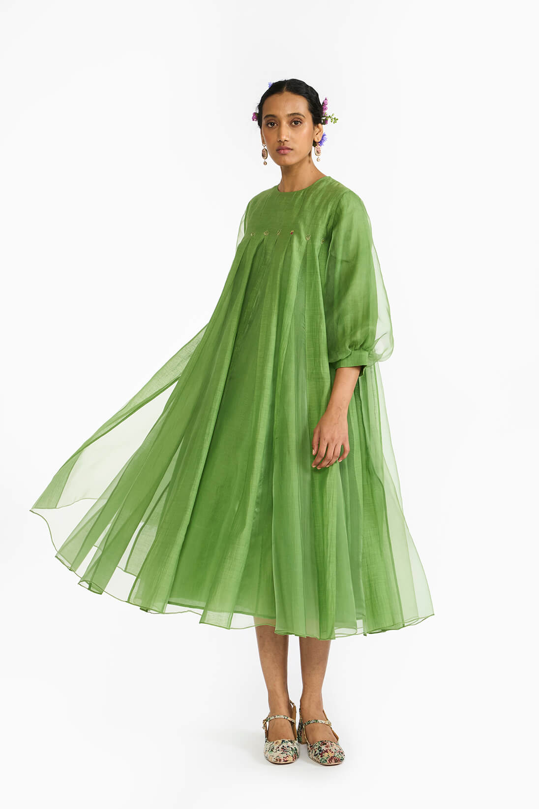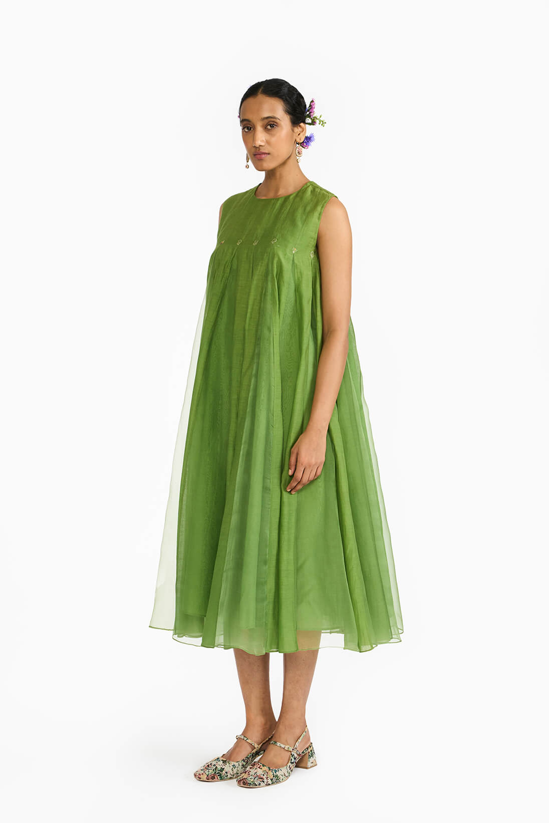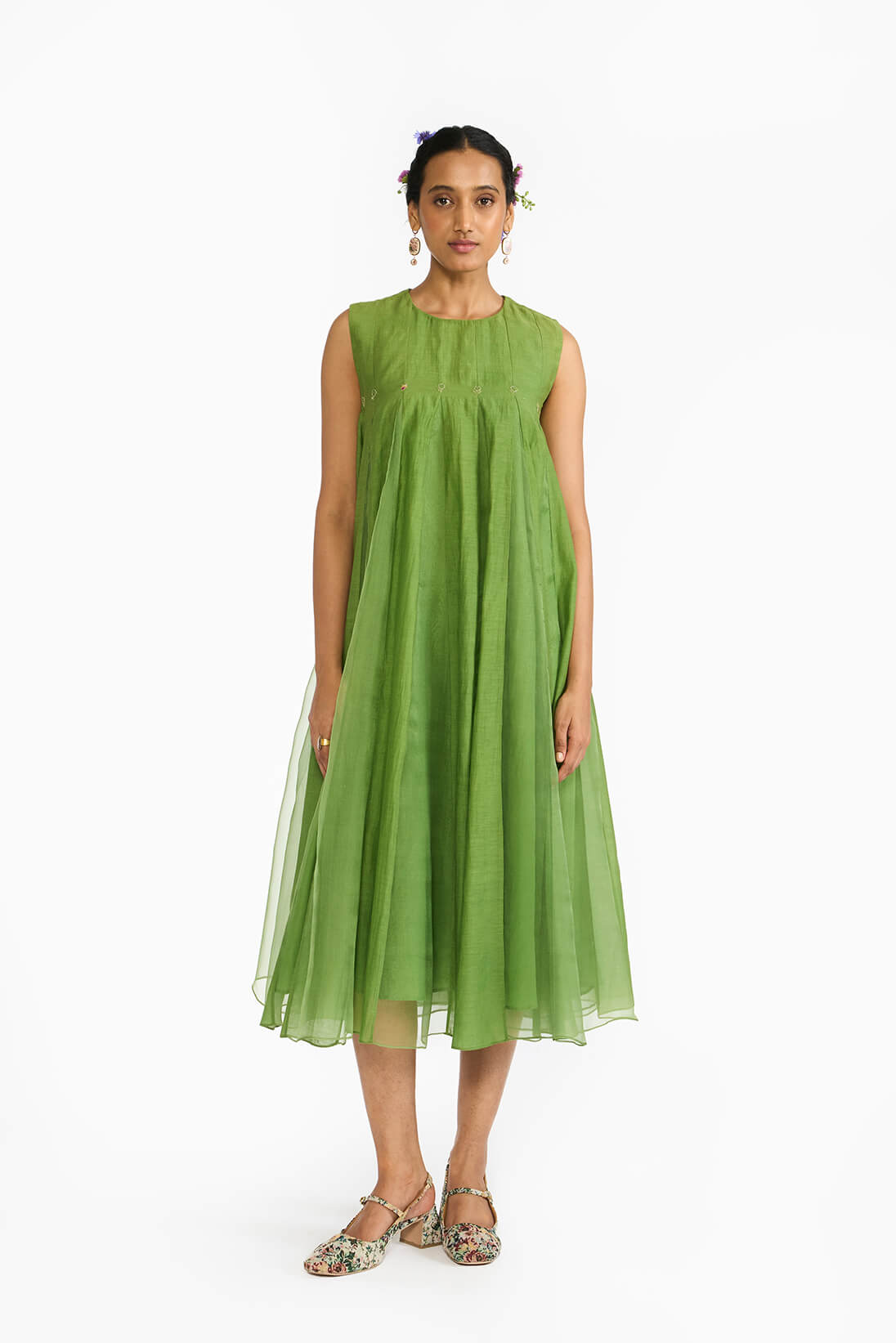Lemon Leaf Panellled Dress is a fit and flare silhouette in a Fresh green color featuring a blend of silk organza skirt with khadi silk godets. The dress is highlighted with hand embroidered details of floral and bug motifs. The dress comes with an option to choose from a clean sleeveless cut or classic elbow length bishop seeeves.