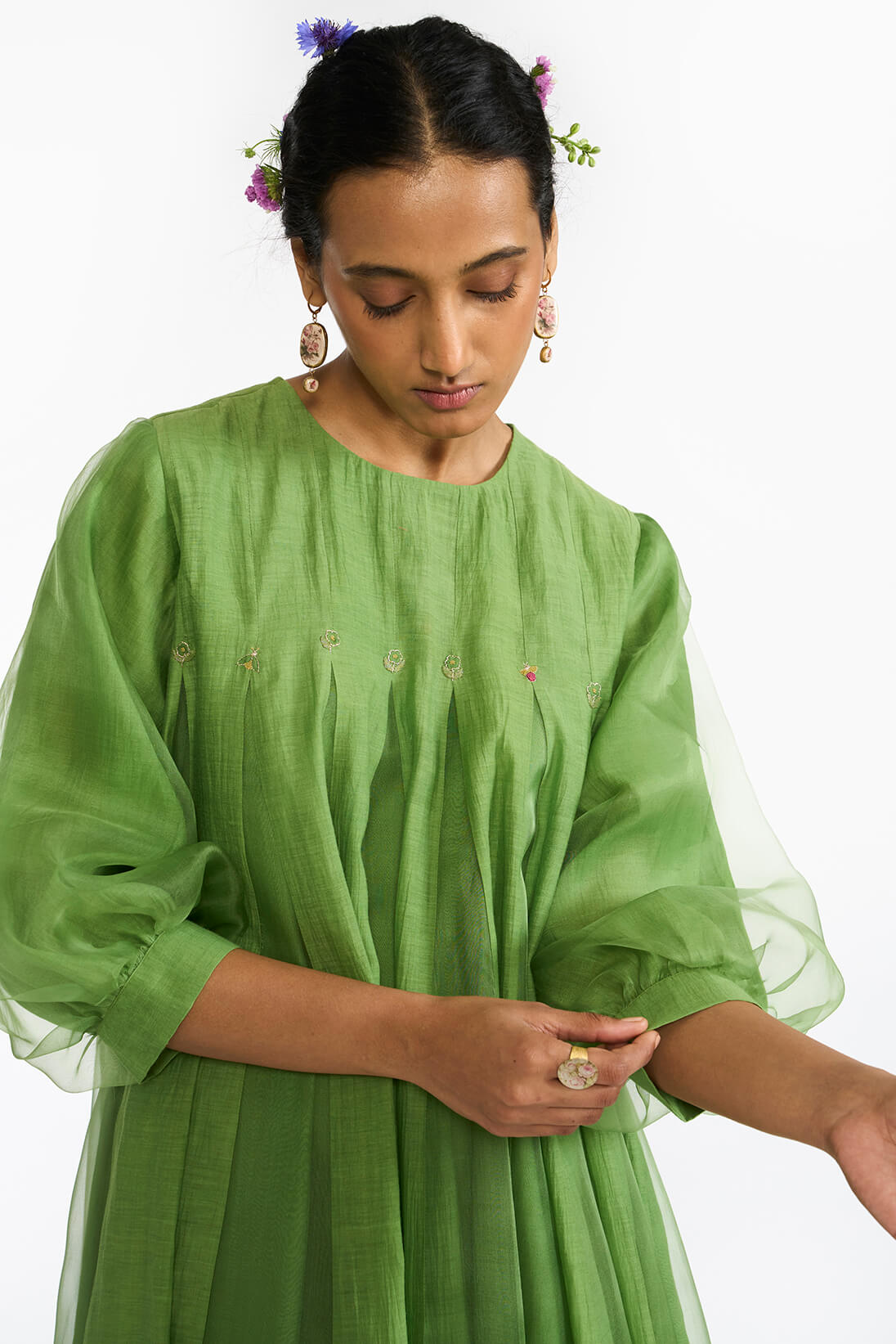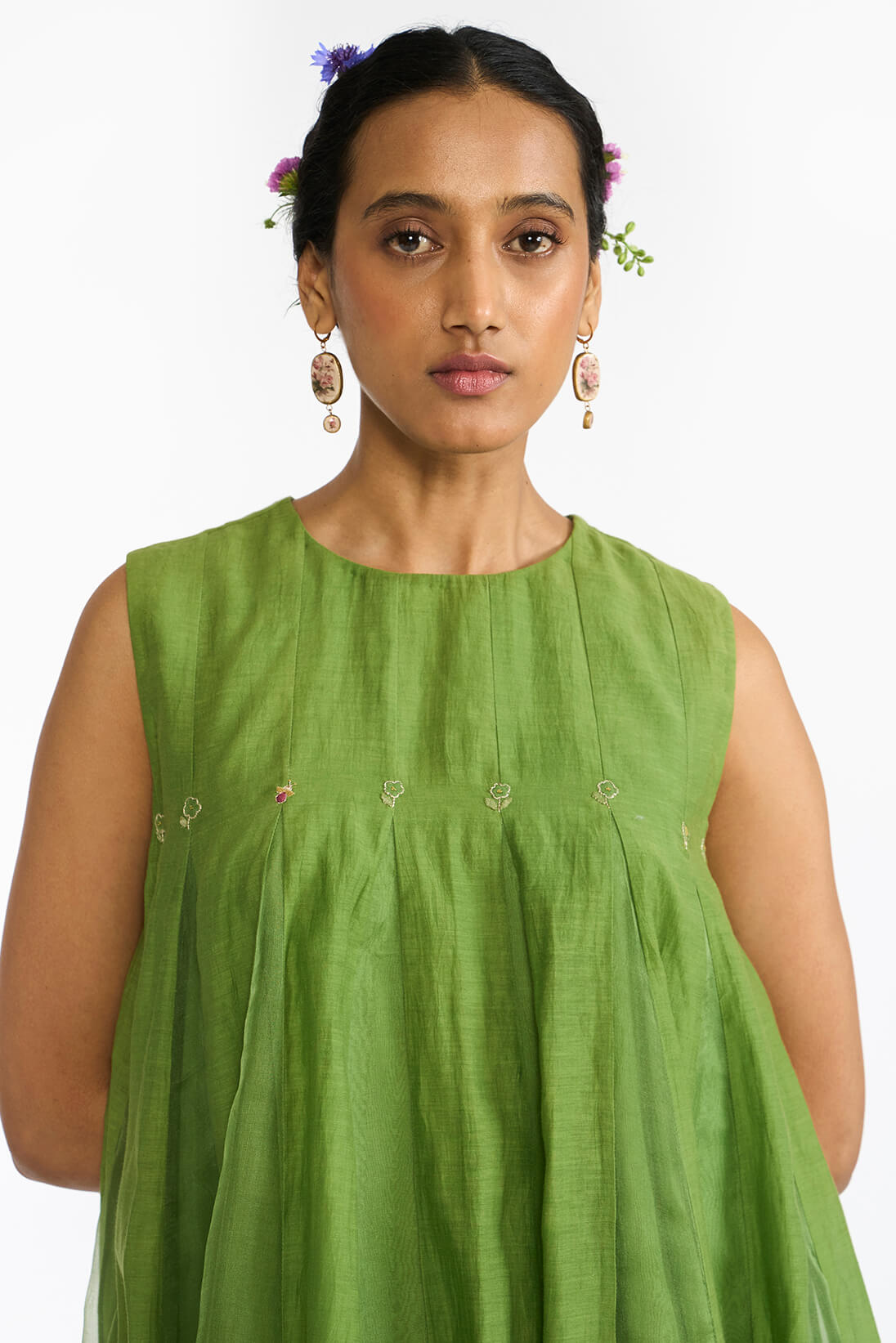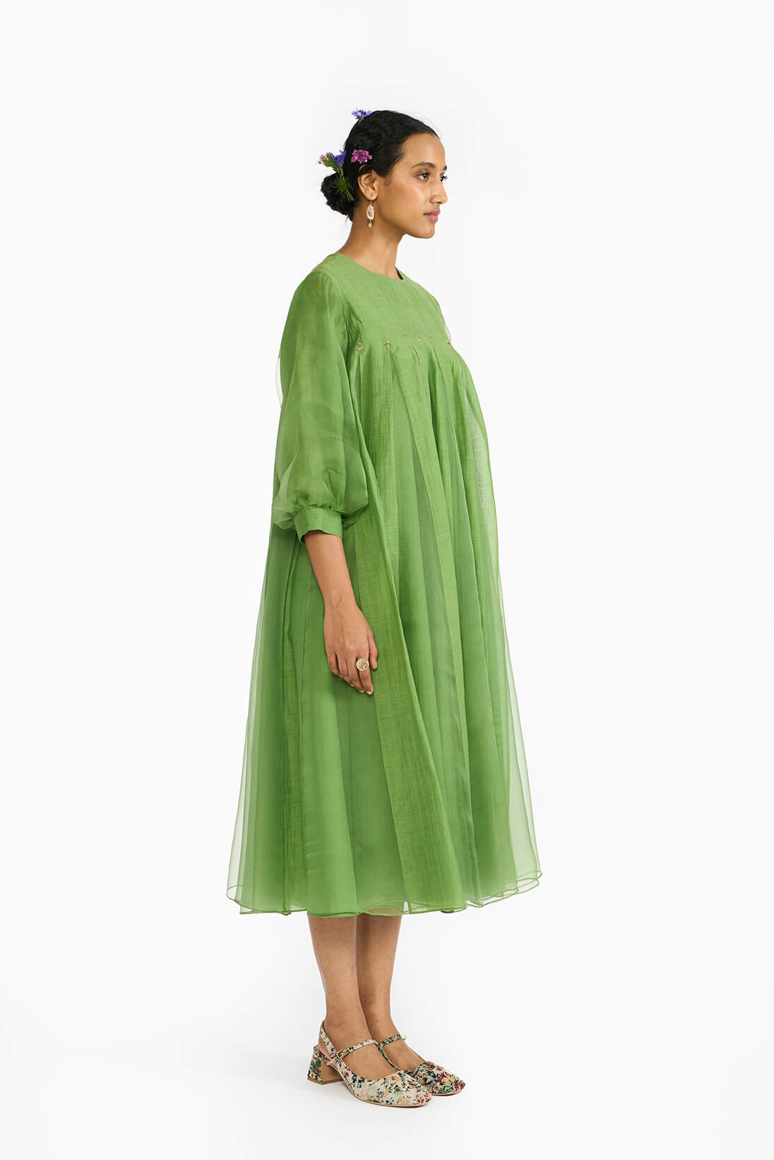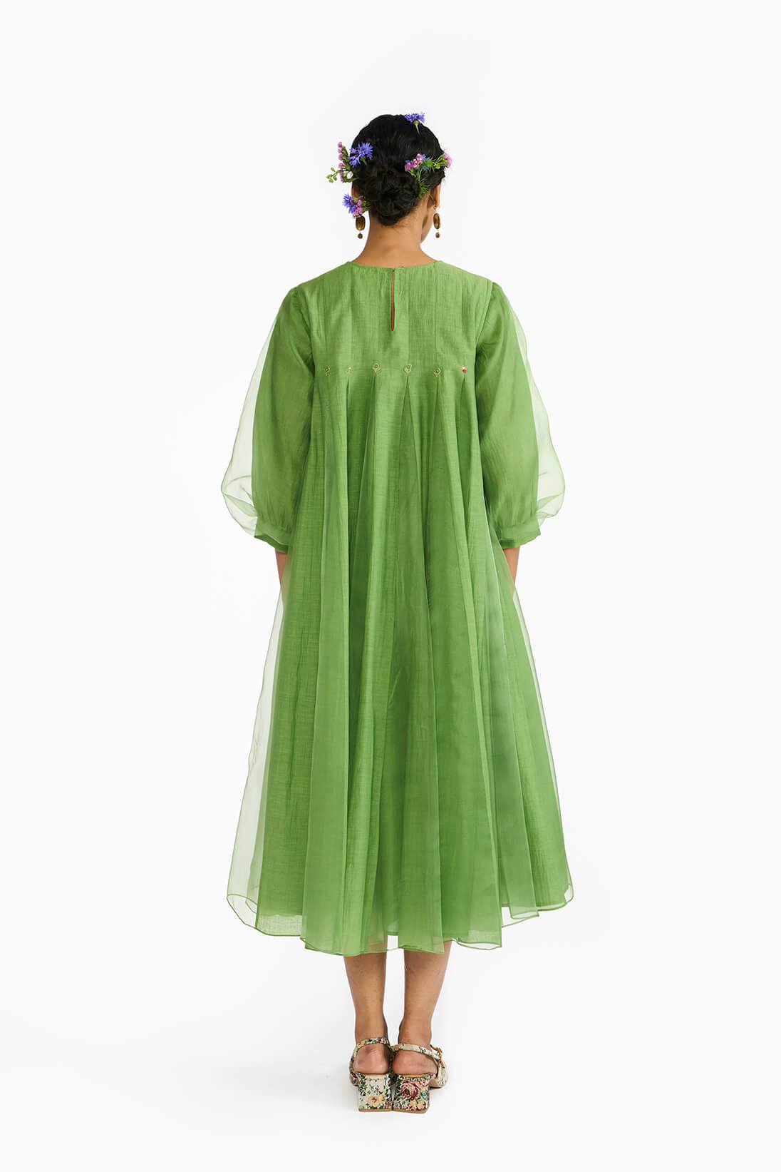 Lemon Leaf Panellled Dress is a fit and flare silhouette in a Fresh green color featuring a blend of silk organza skirt with khadi silk godets. The dress is highlighted with hand embroidered details of floral and bug motifs. The dress comes with an option to choose from a clean sleeveless cut or classic elbow length bishop seeeves.