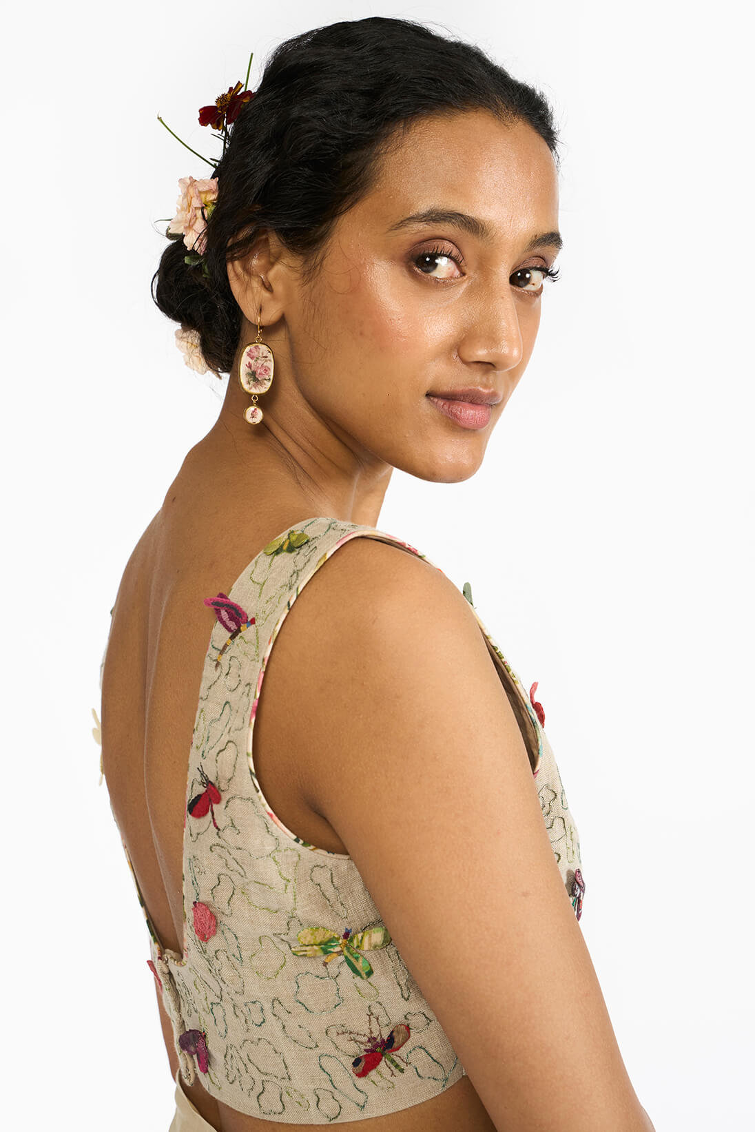 The “Spring Blouse” showcases small handcrafted bugs on hand embroidered lush patterns making it sleeveless linen blouse a spring essential.