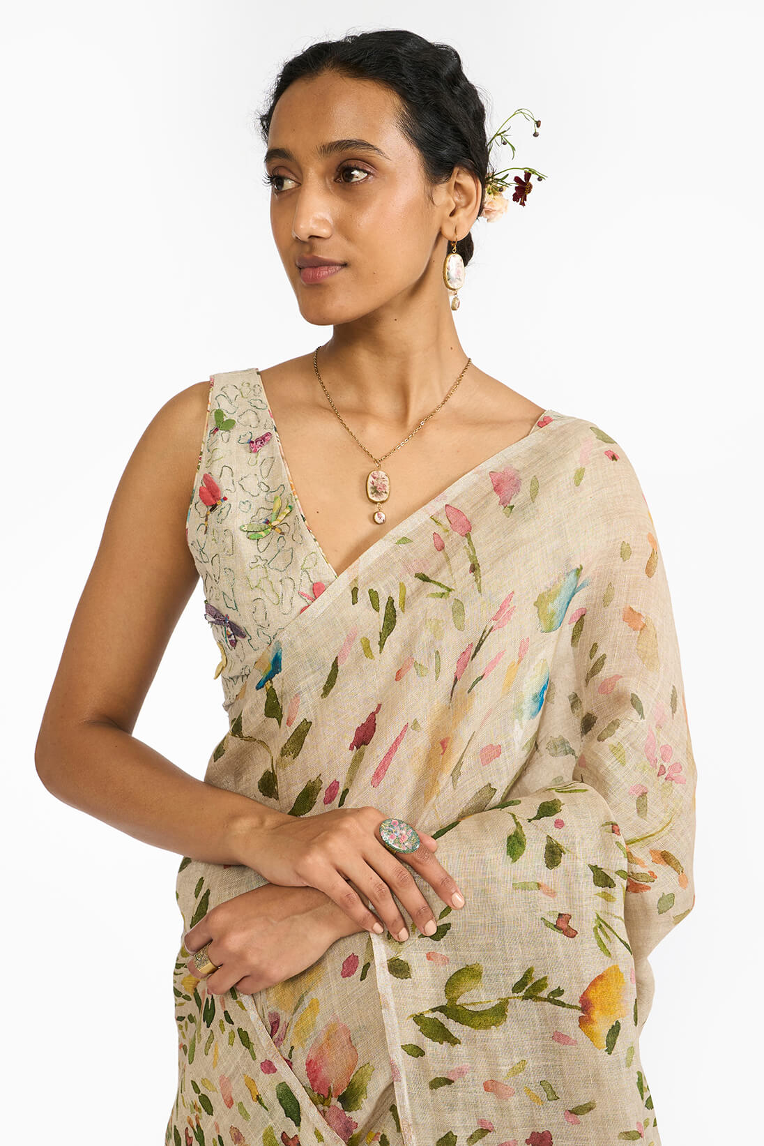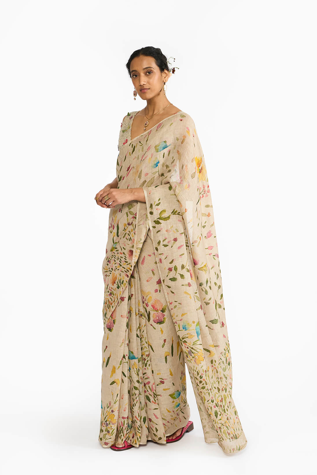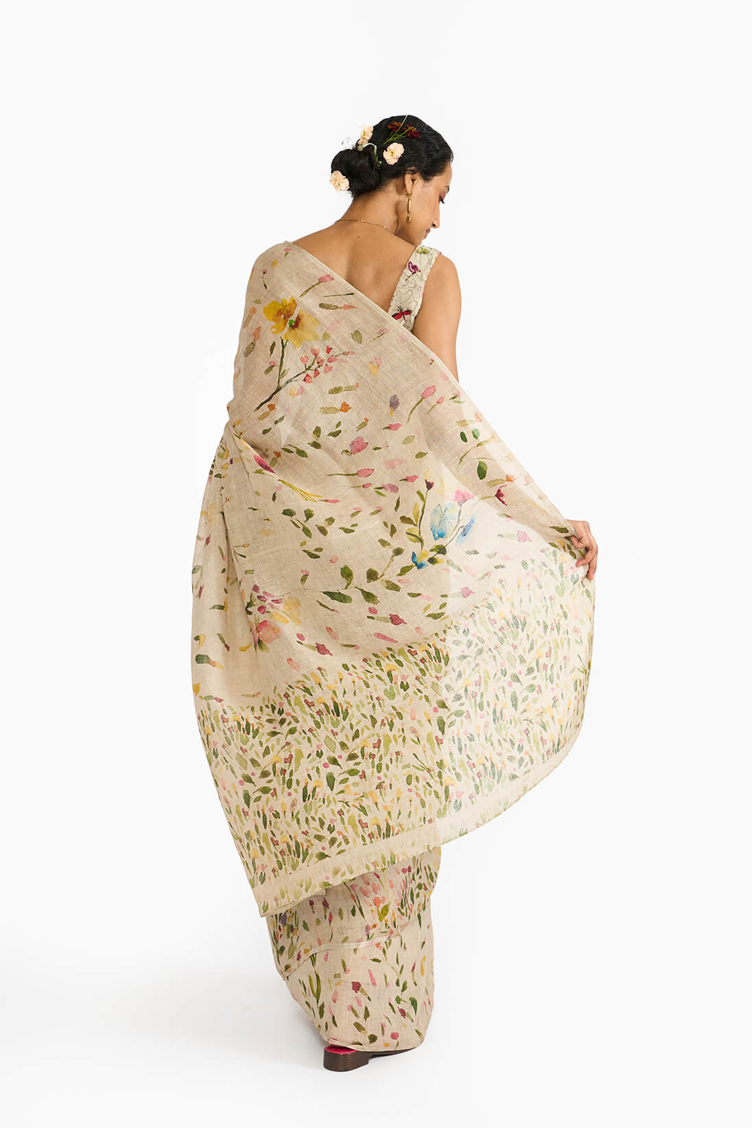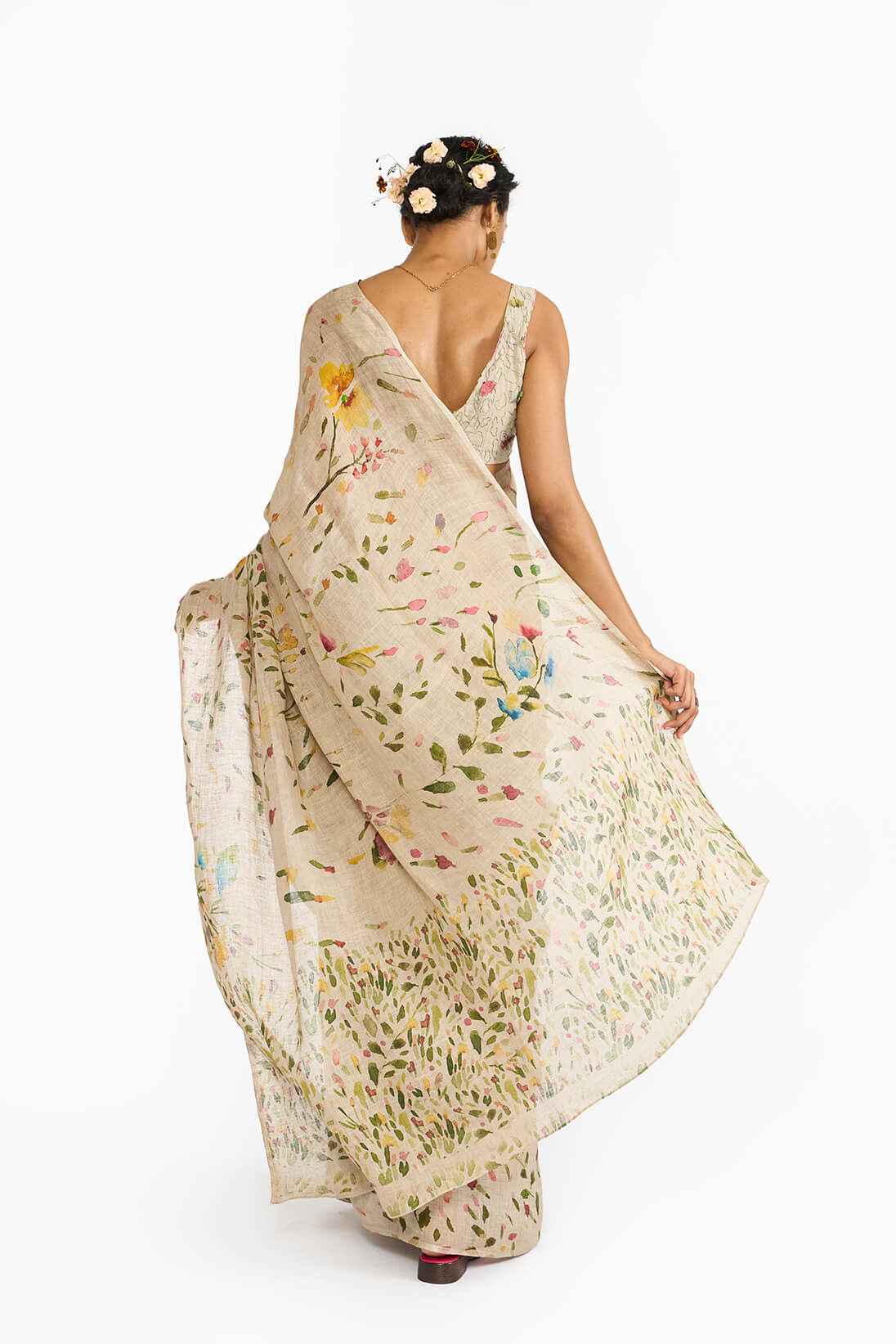 “Zinki Sari” features hand painted watercolor abstract forms of garden flowers printed on handwovenlinen sari makeing it an all day light and breezy spring attire.