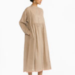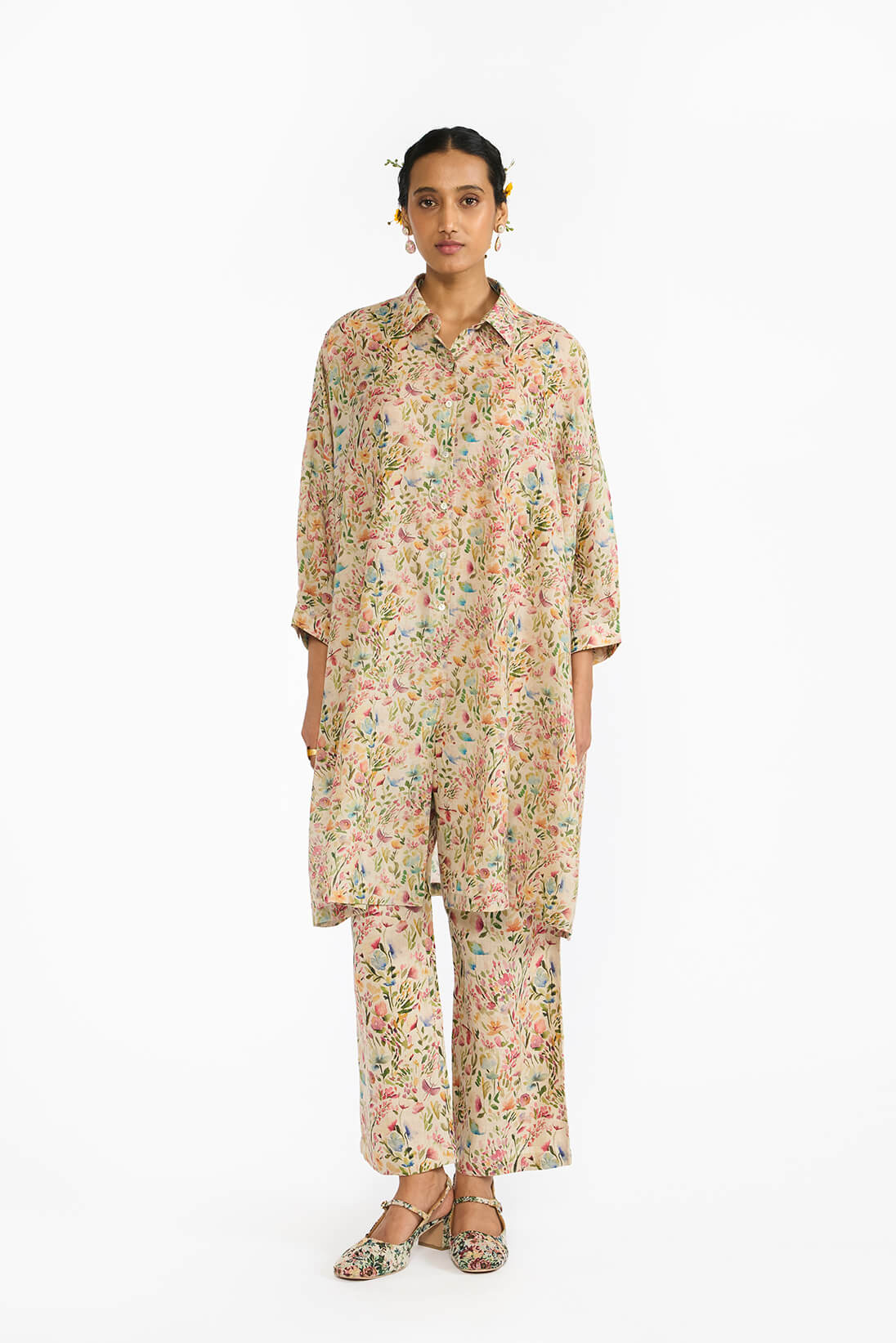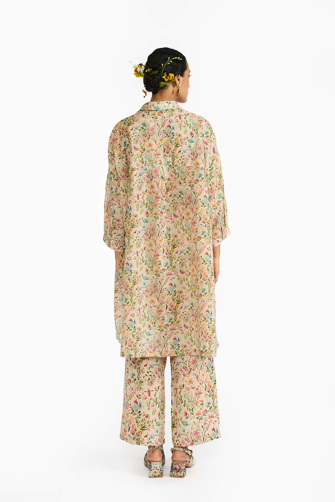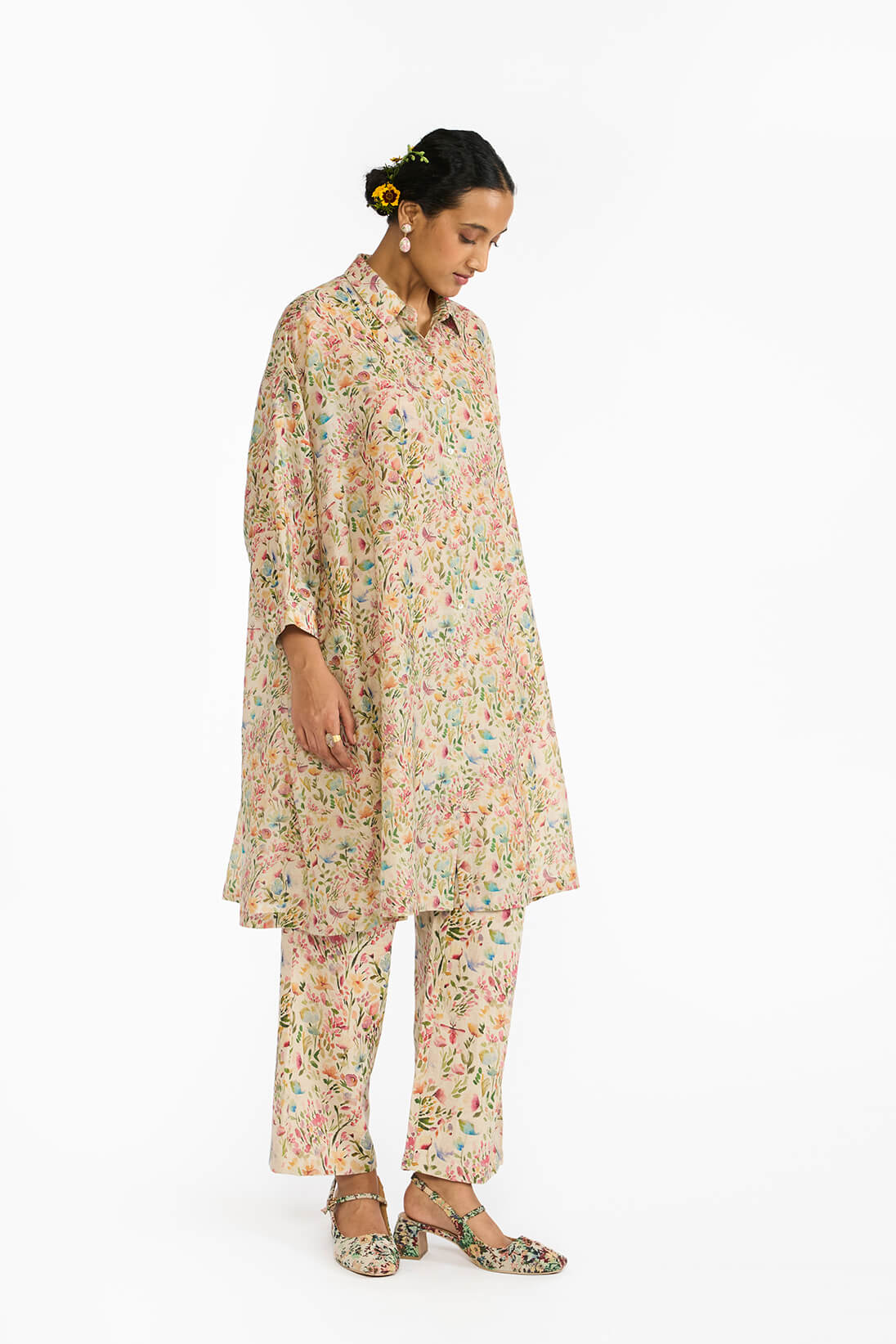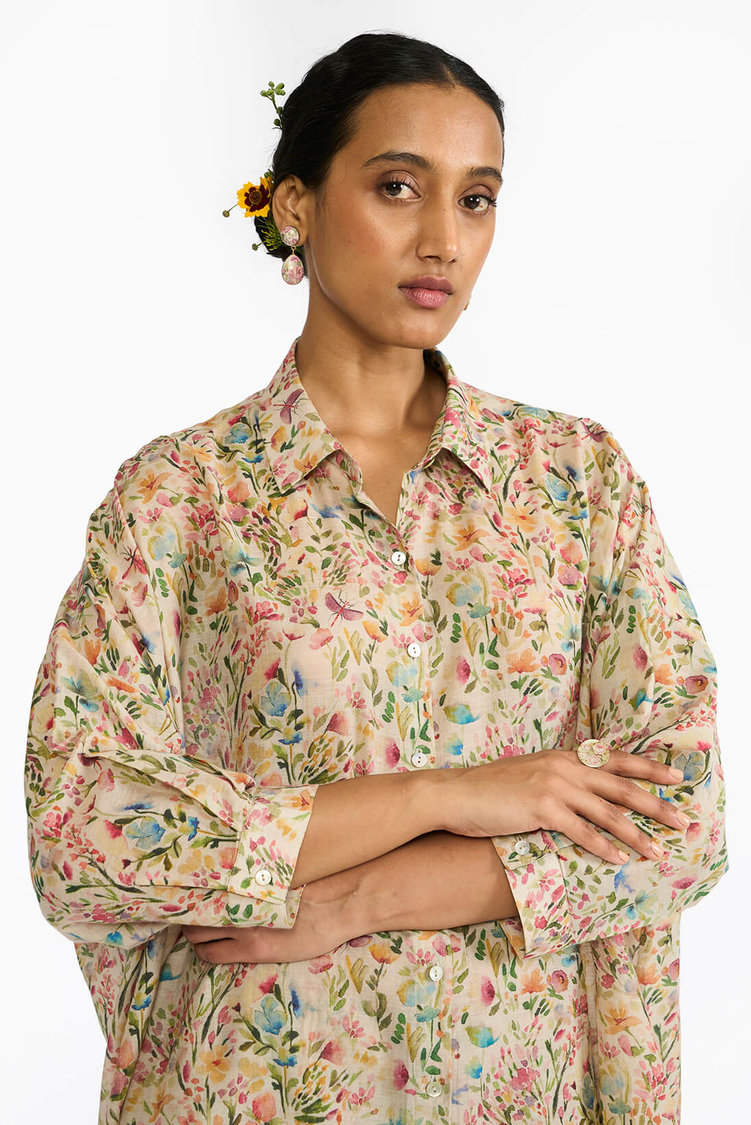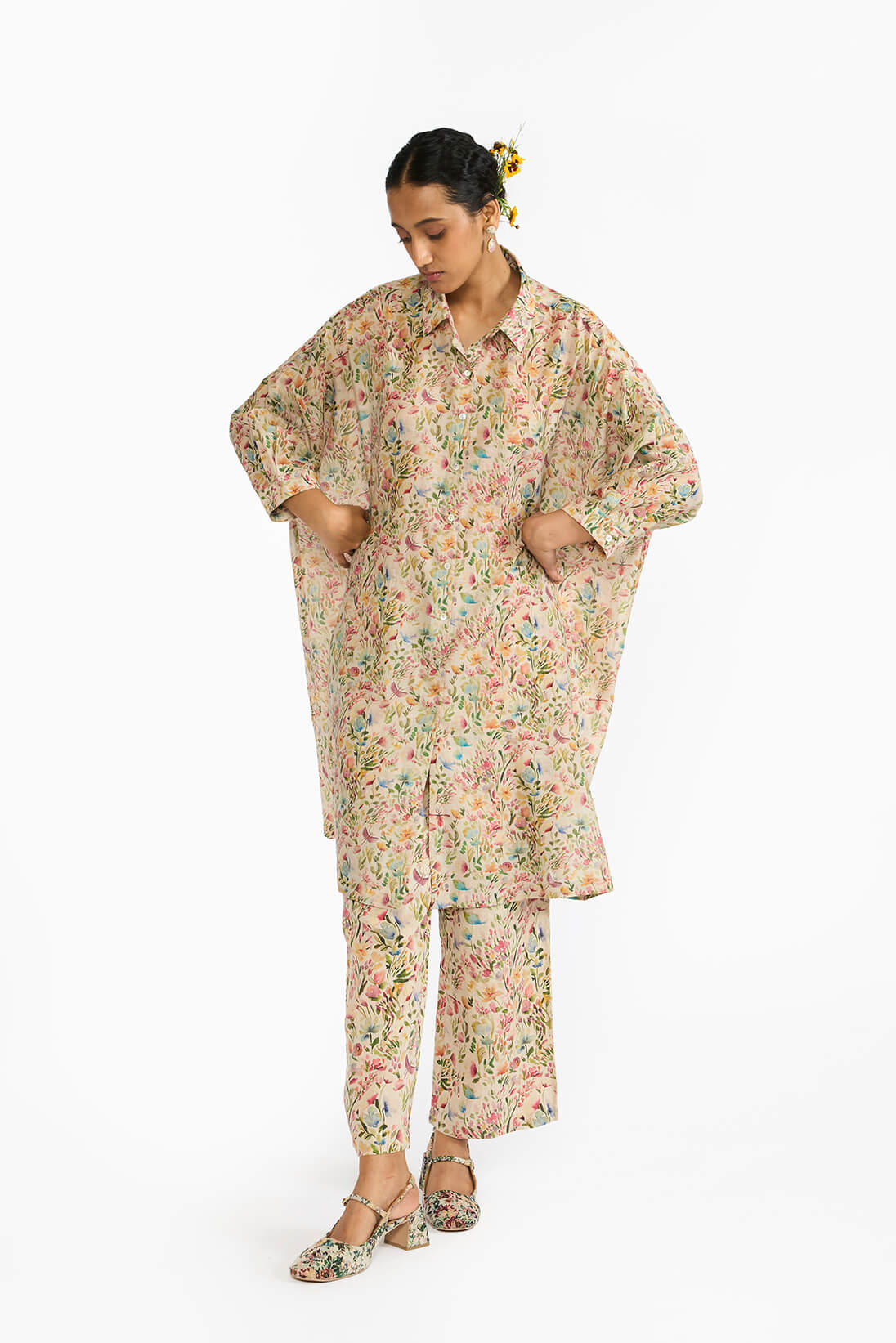 Hand painted watercolor abstract forms of garden flowers printed on handwoven khadi silk makes for an all day light and breezy spring shirt. Silhouette showcases an easy fit with flowy mid length cut.