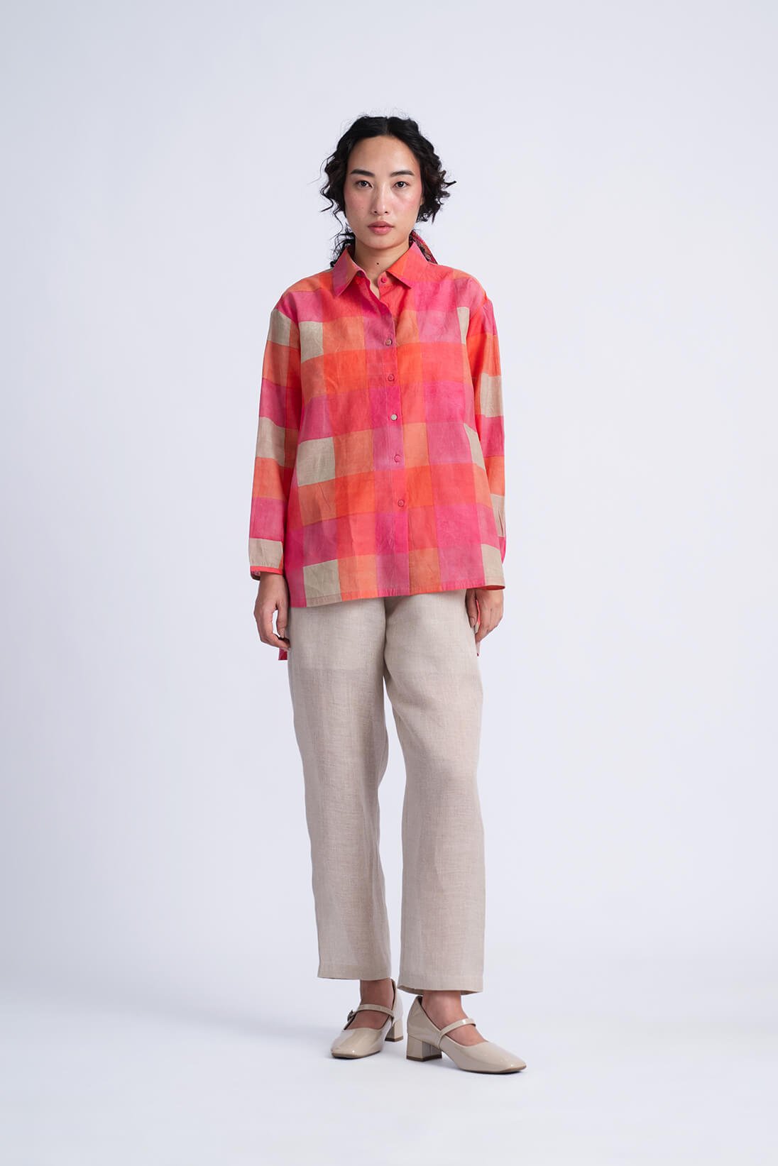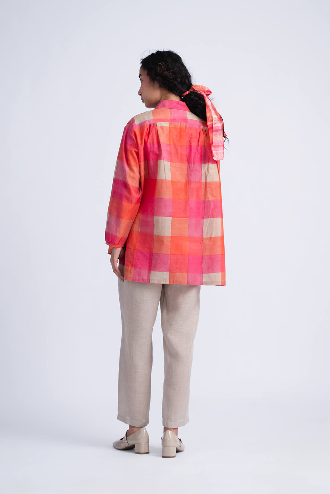 Careman Sun Shirt is block printed in hues of pink and tangerine with a touch of ecru it chanels our love for checkered patterns and adds warmth to a spring summer wardrobe.