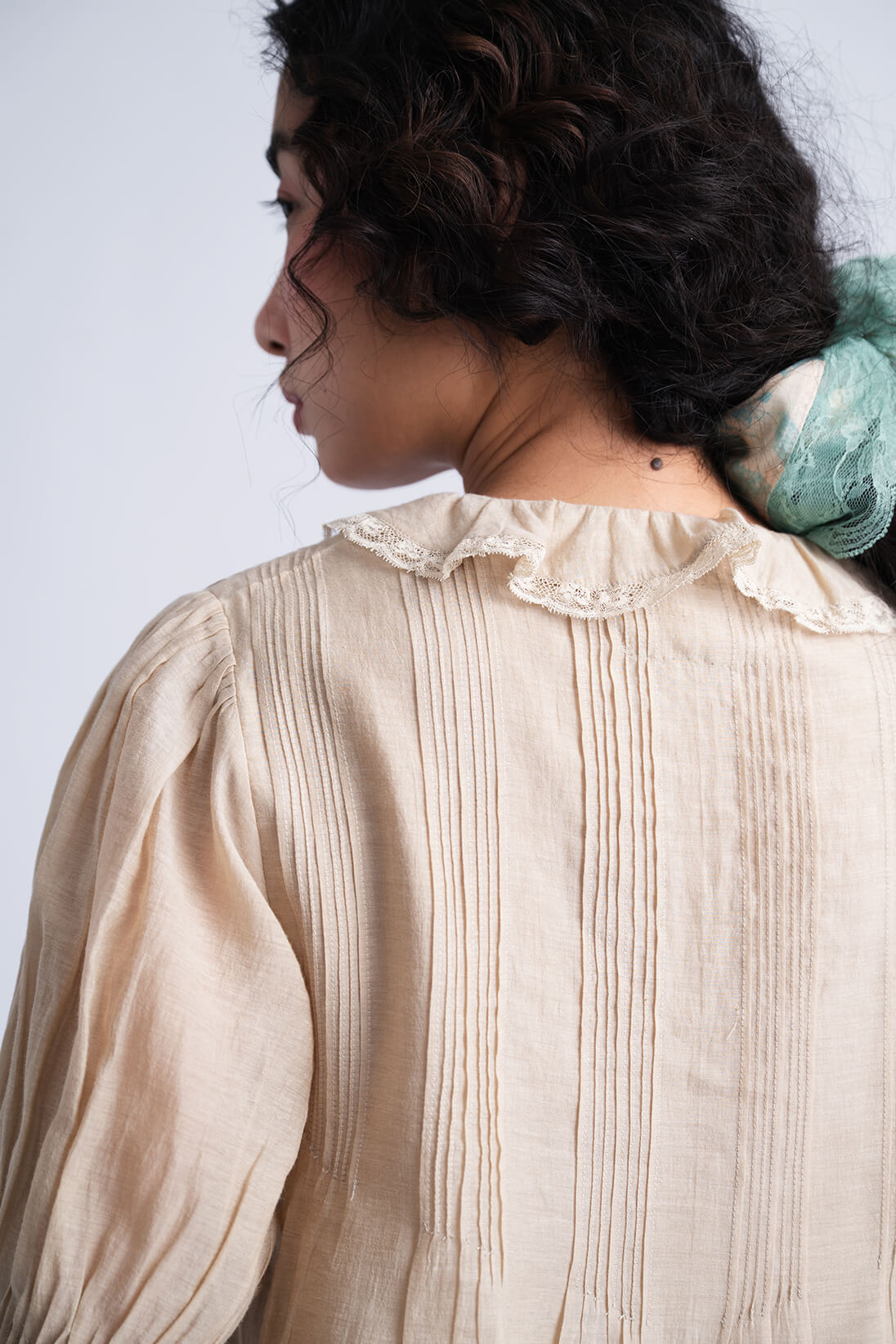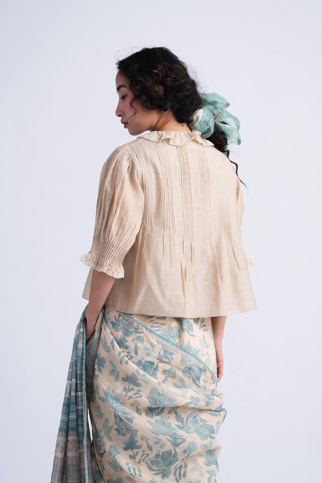 Patio Blouse showcases a soft ruffled neckline, pintuck texture on bodice and cuffs of the sleeves which add to verstalilty of the silhouette. Patio blouse can be styled with sari, jackets and trousers alike.