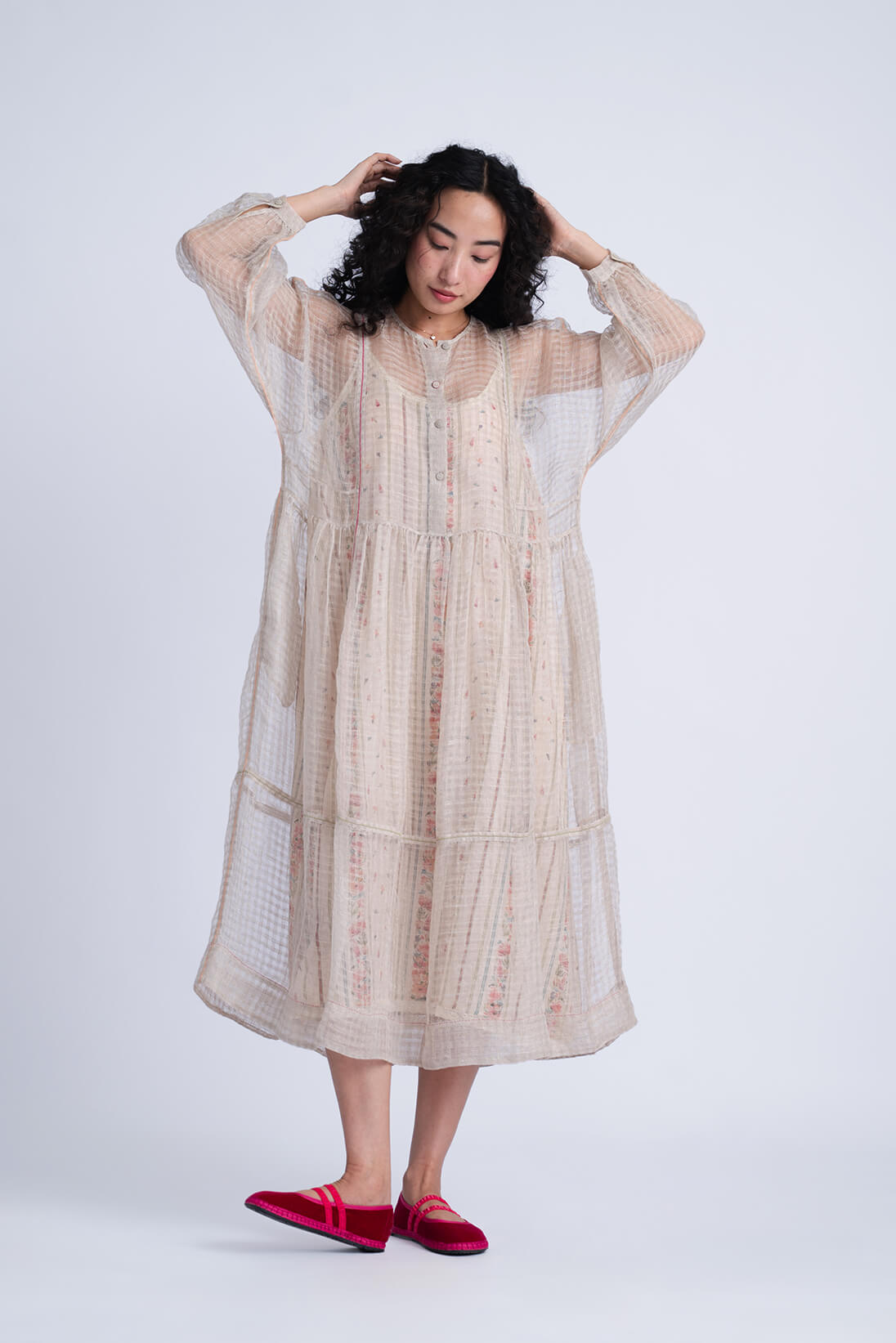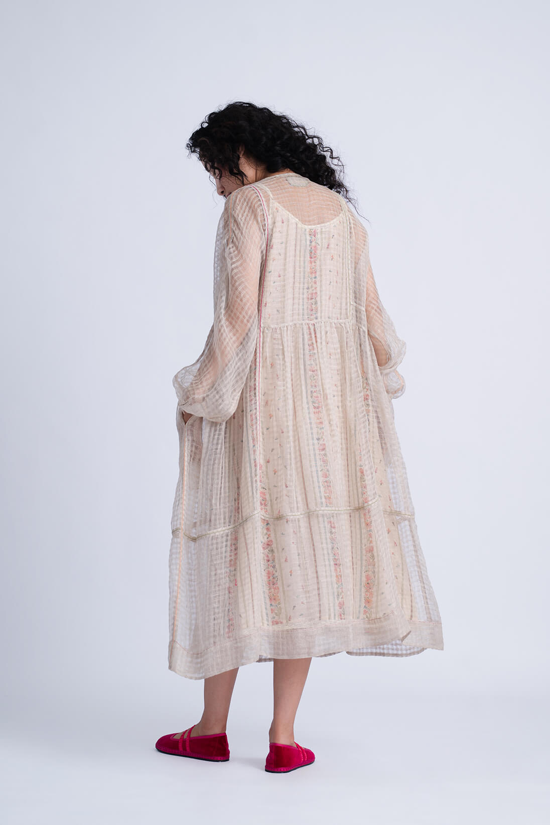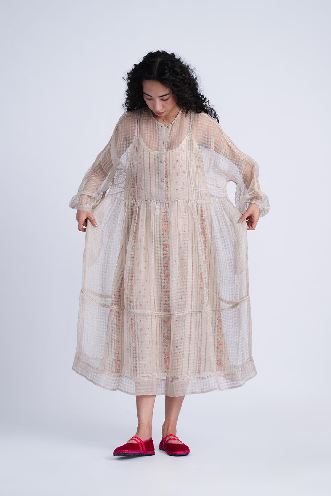 Patio Beige Dress features a panelled silhouette in soft checkered linen silk fabric detailed with beads on the seams and comes with floral printed slip which will fill you with summer nostalgia of sun and shade.