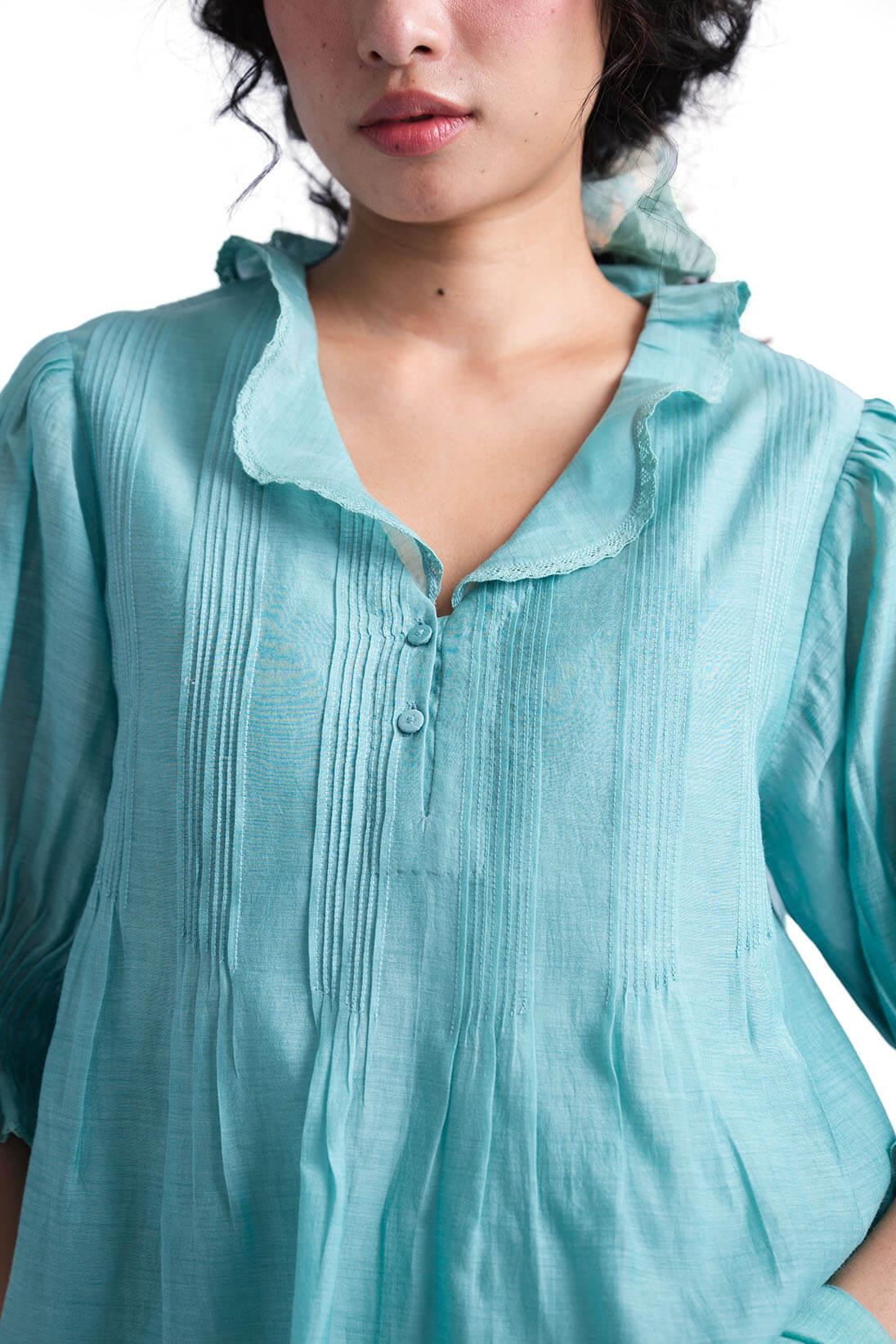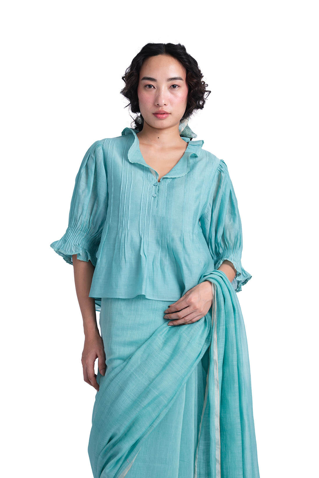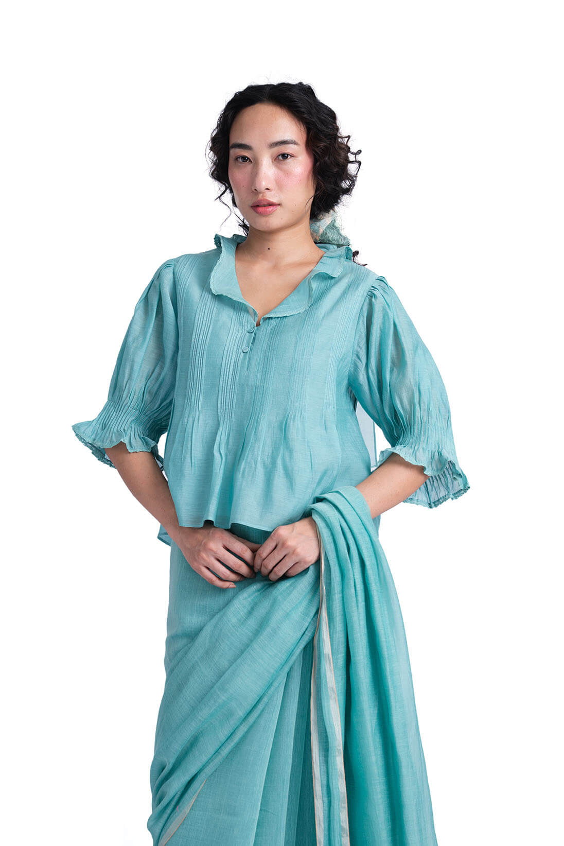 Patio Blouse showcases a soft ruffled neckline, pintuck texture on bodice and cuffs of the sleeves which add to verstalilty of the silhouette. Patio blouse can be styled with sari, jackets and trousers alike.