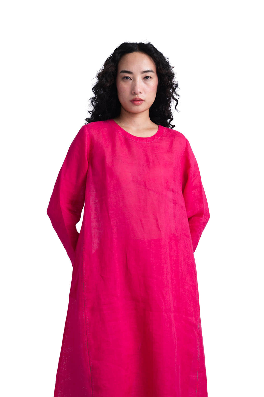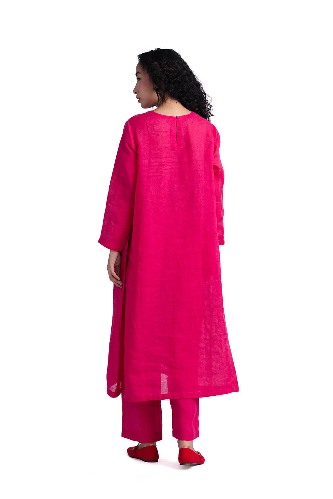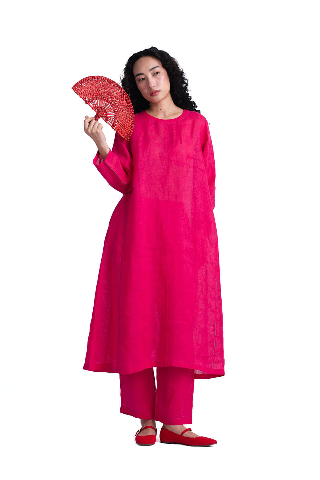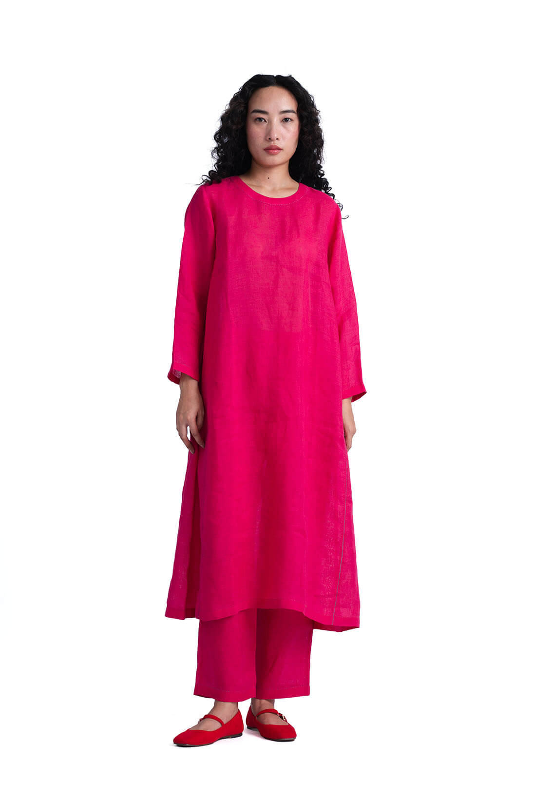 Rosita Pink Tunic Set is crafted from handwoven linen in fresh pink hues. The silhouette offers an easy, comfortable fit with a soft, flowy A-line cut, while contrast colored details on seams add a striking touch of warmth.