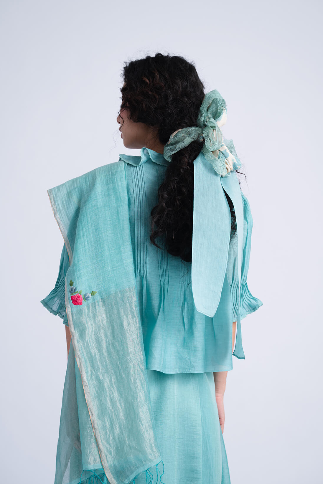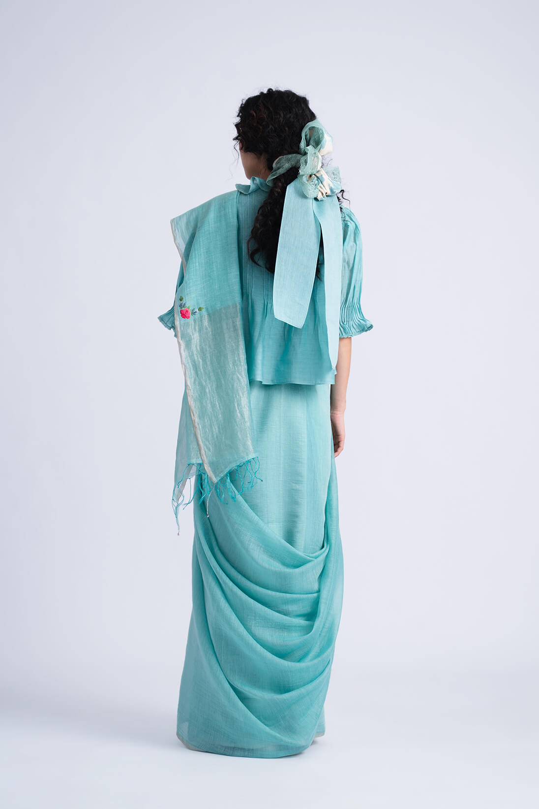Our handwoven khadi silk sari returns as Rosita Teal Sari in happy summer hue of turqouise and charming applique floral detials on the pallu. This sari can be either paired with the Solana Teal Blouse or Patio Teal Blouse.