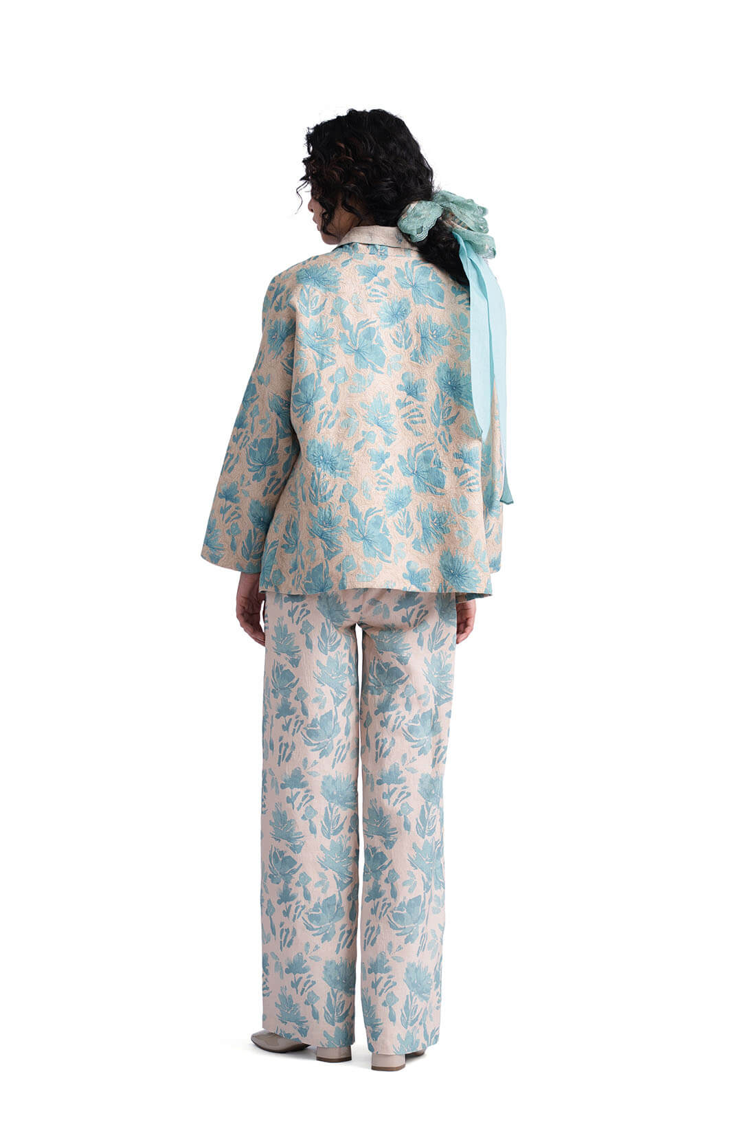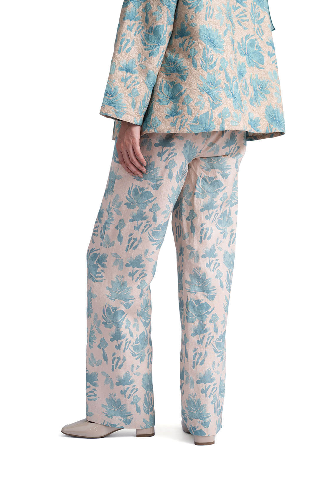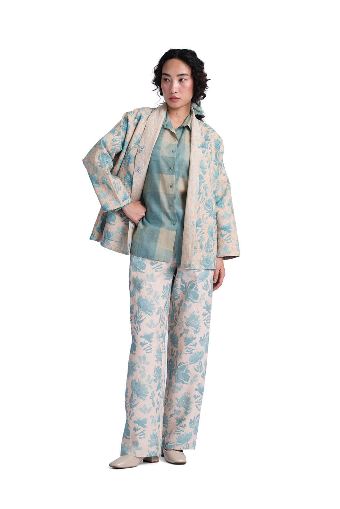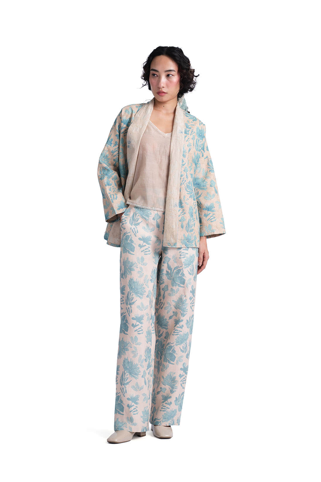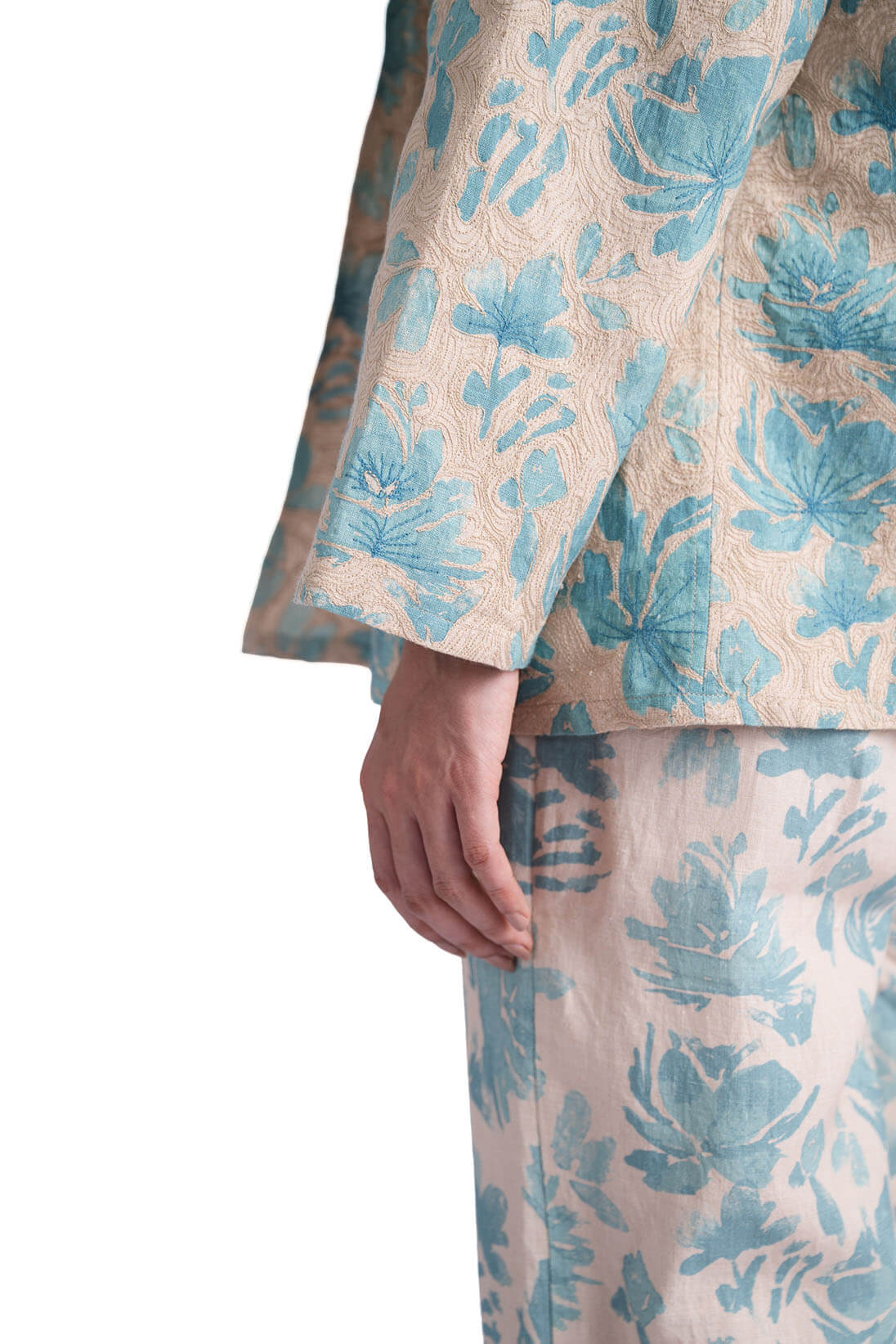 Solana Teal Jacket showcases a hand painted watercolor flower print on linen makeing it a perfect spring overlay. the embroidery highlight and reversible cut gives the silhouette a unique appeal.