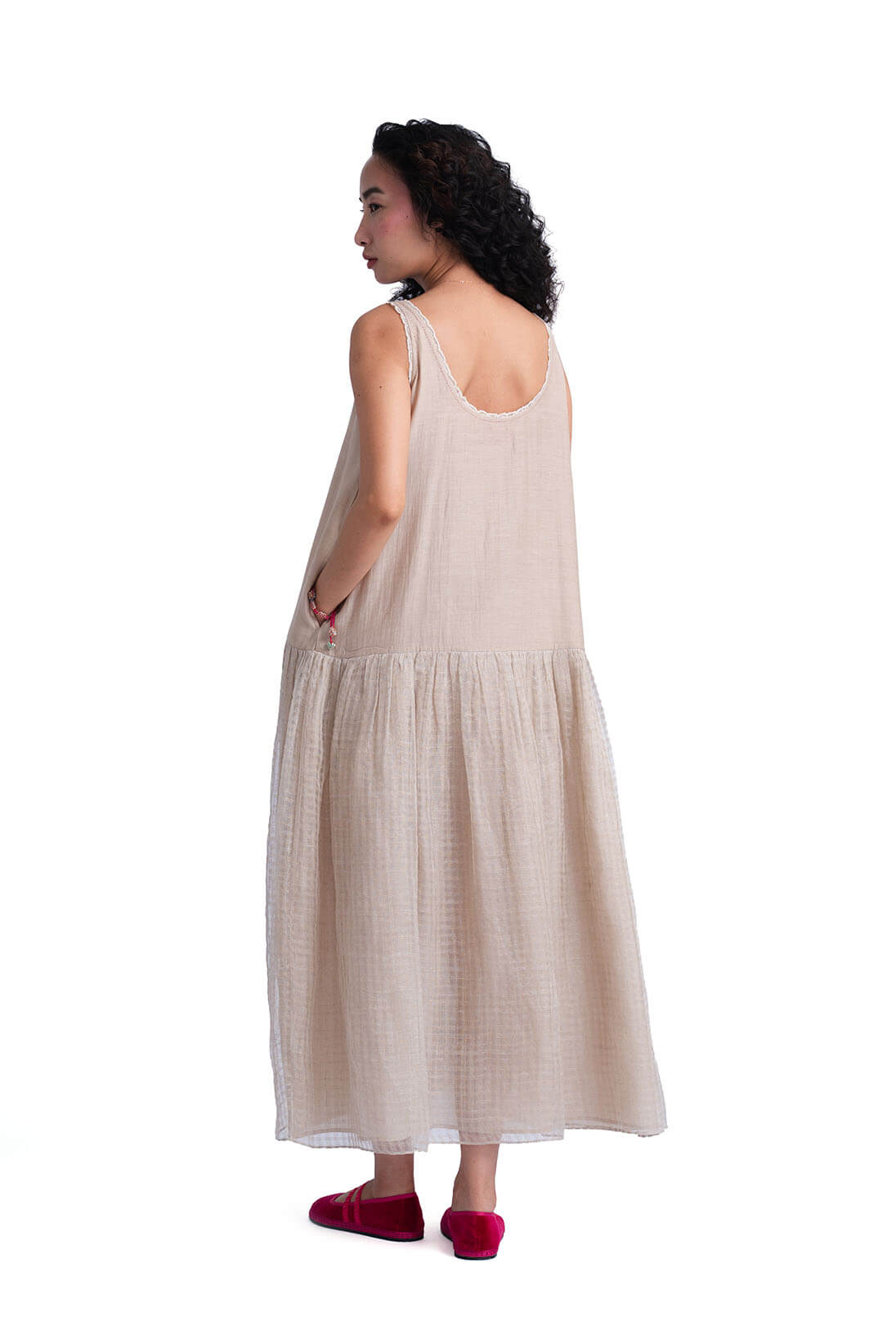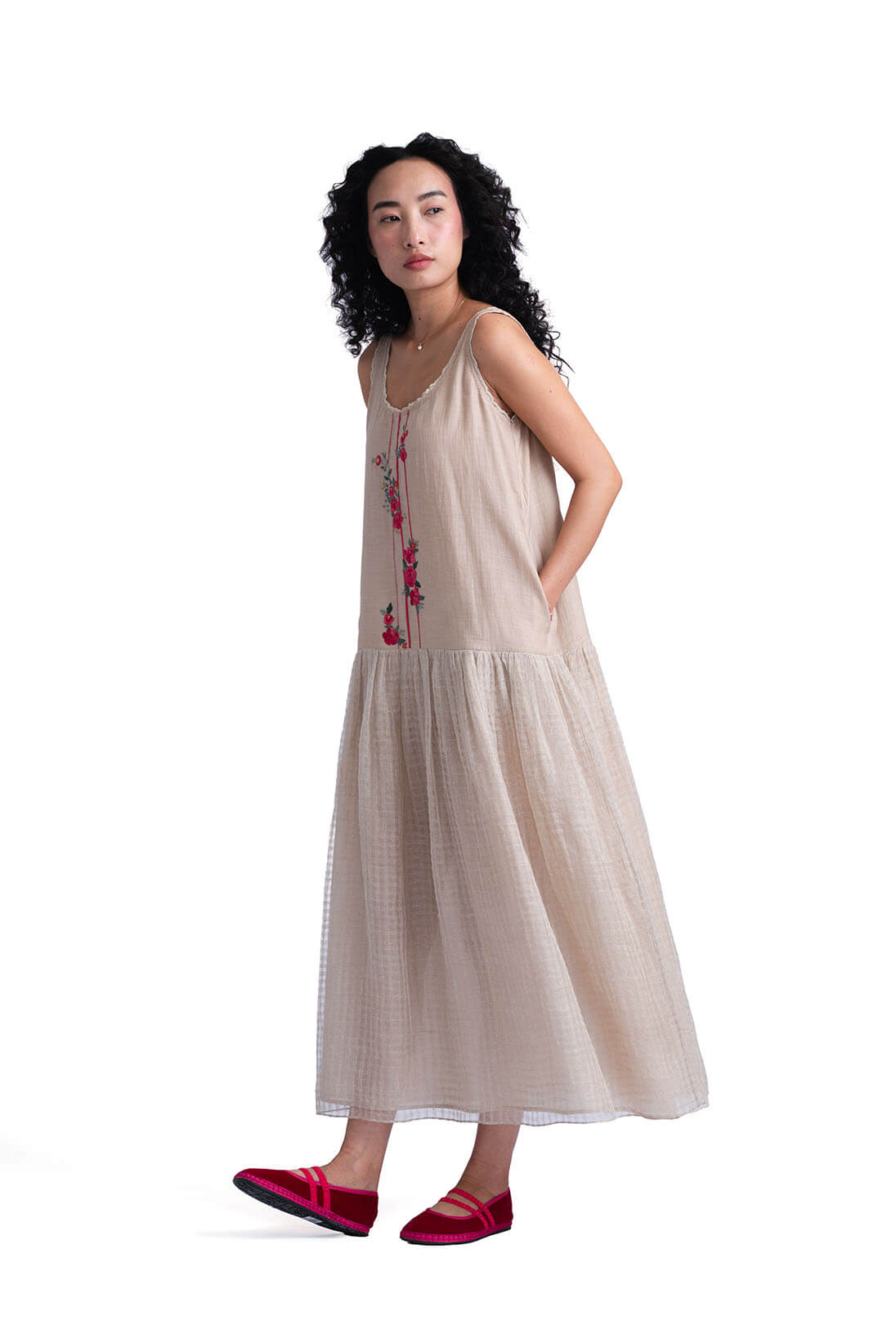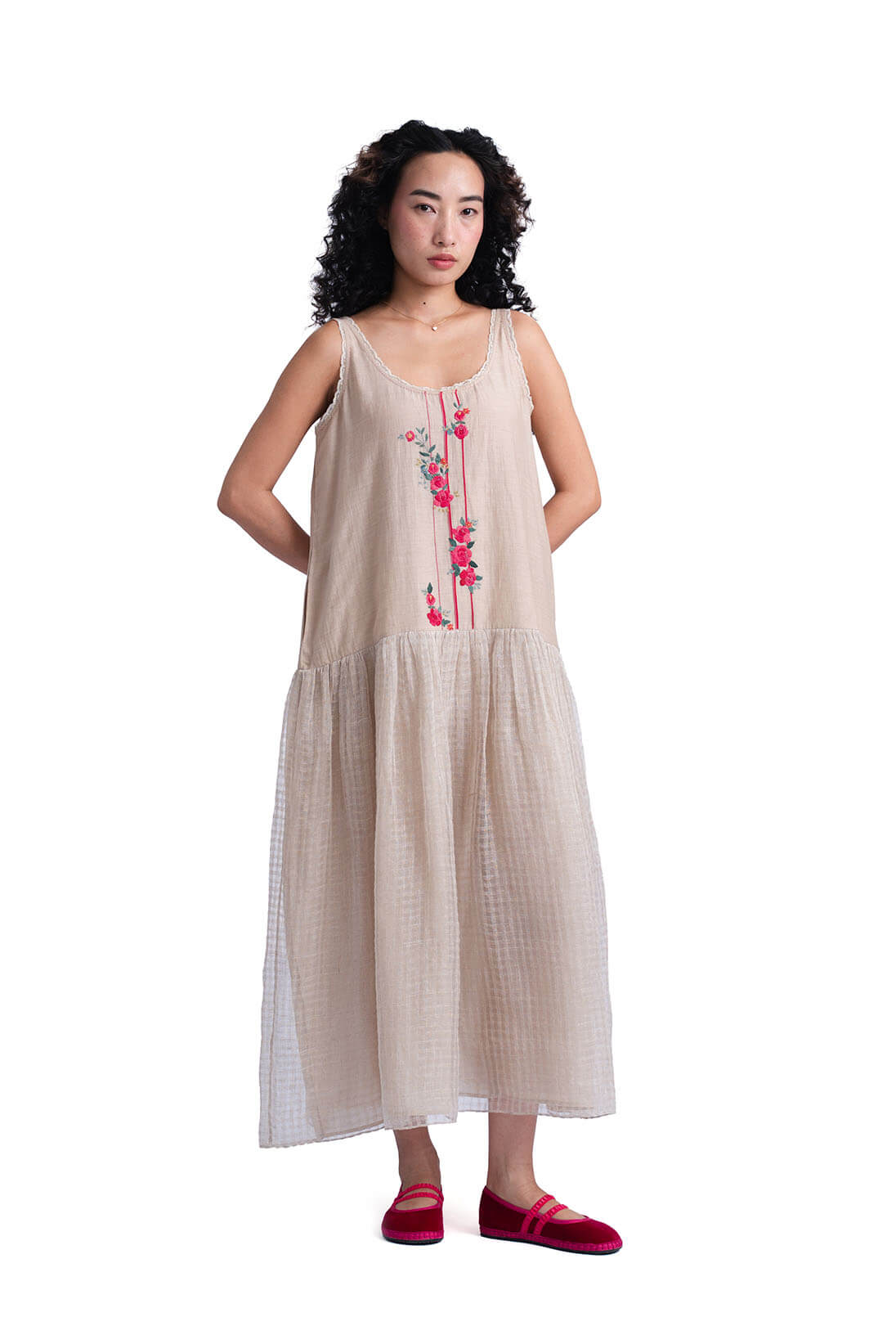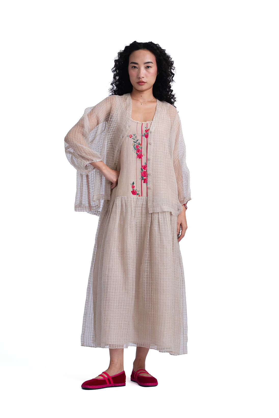 The Sombra Dress comes with khadi silk bodice with linear applque flowers and a soft checkered hand block printed skirt. It has a effortless summer charm to it and can be styled with sombra sun shirt.