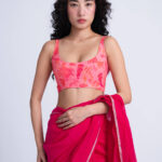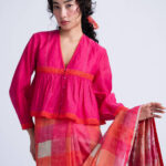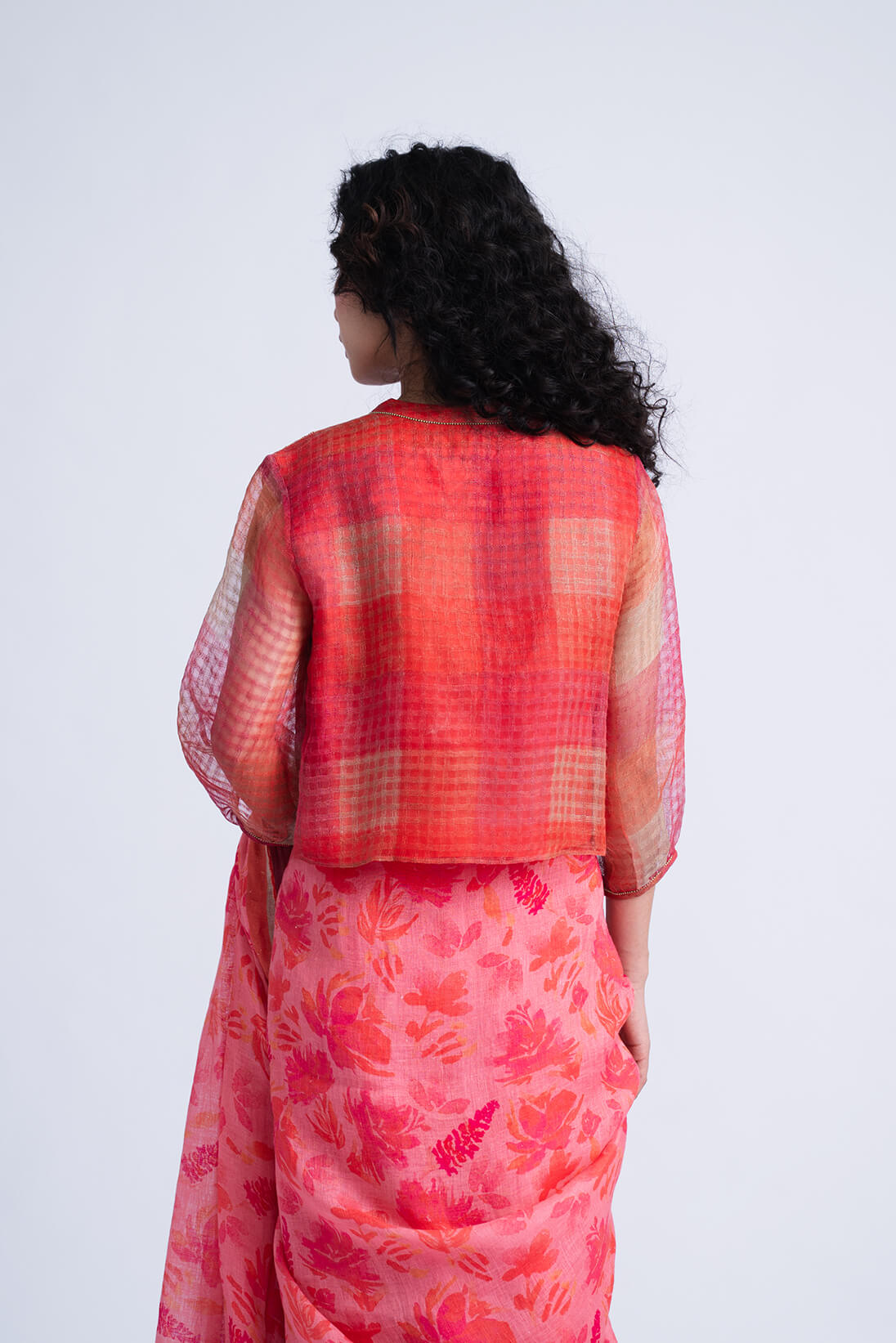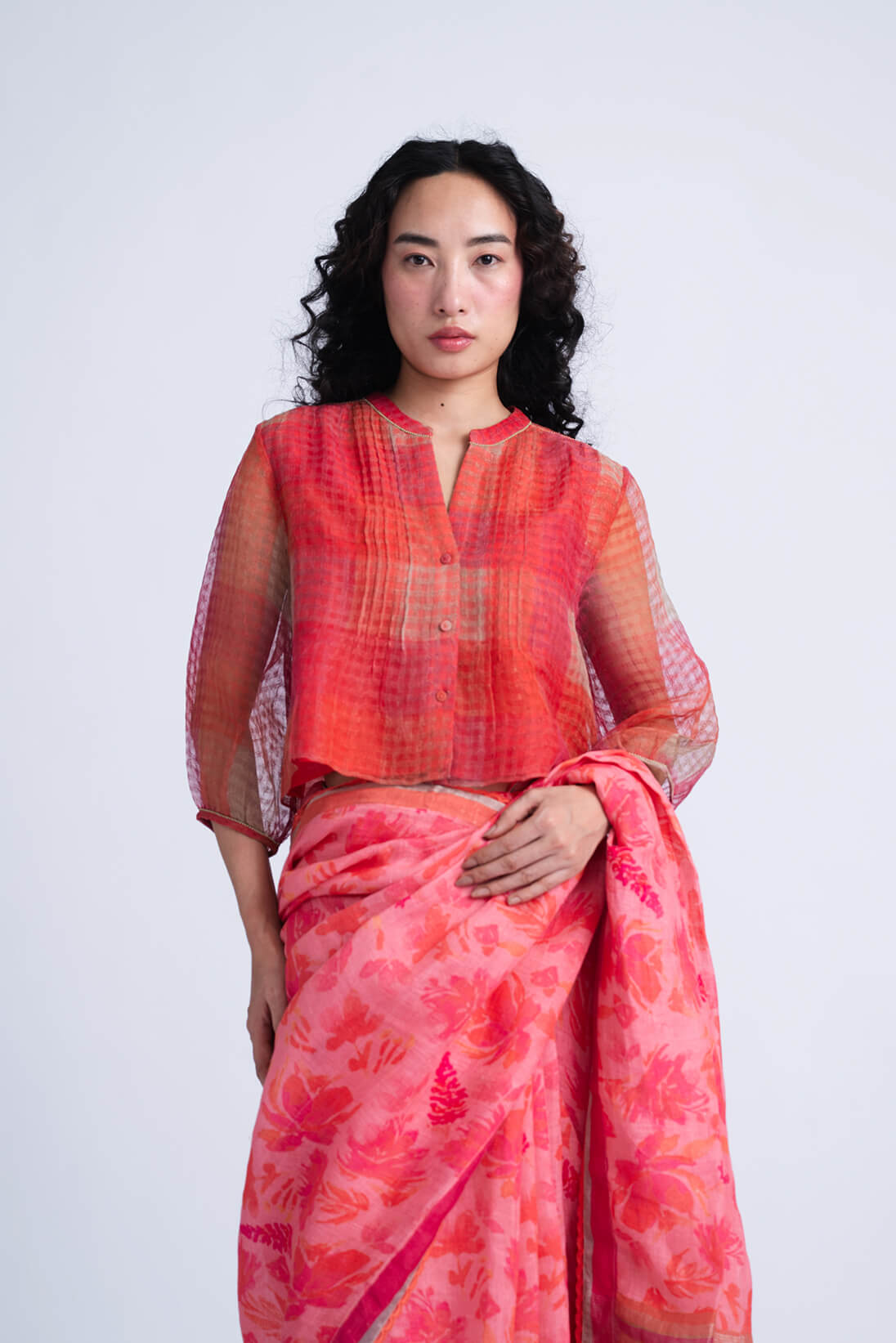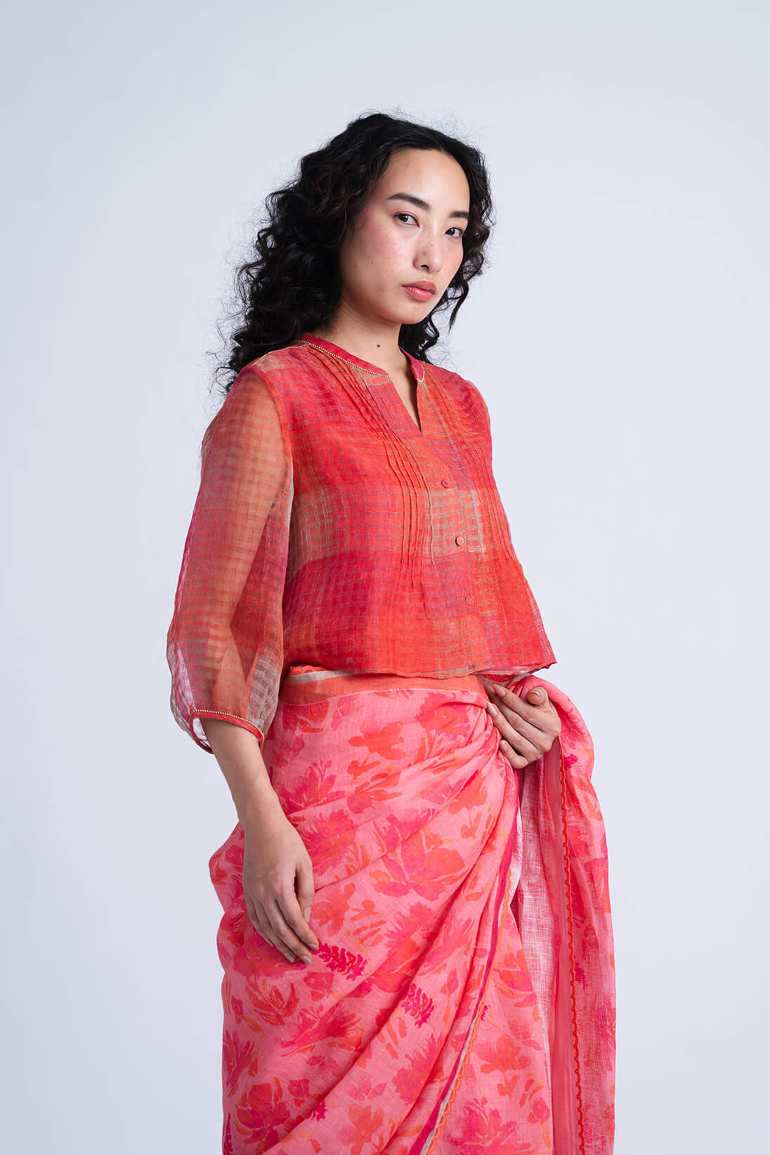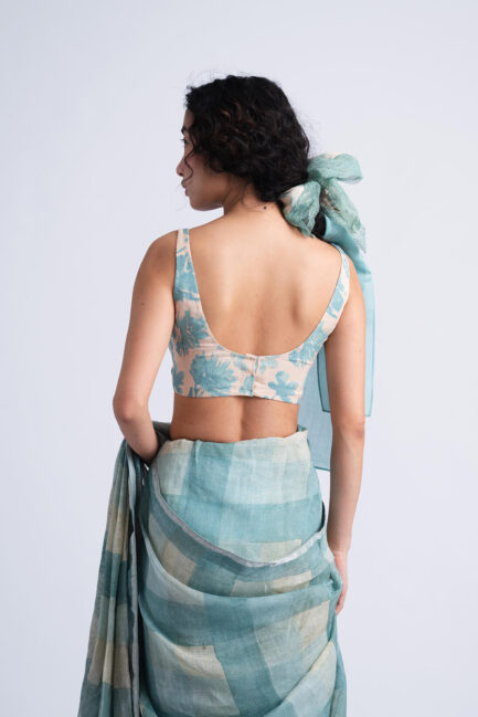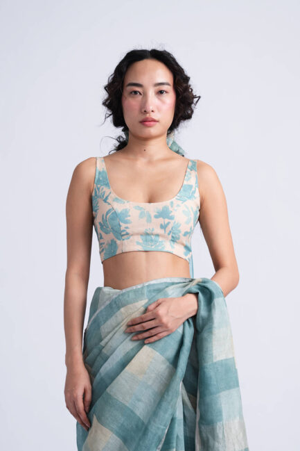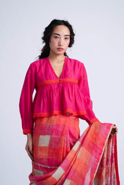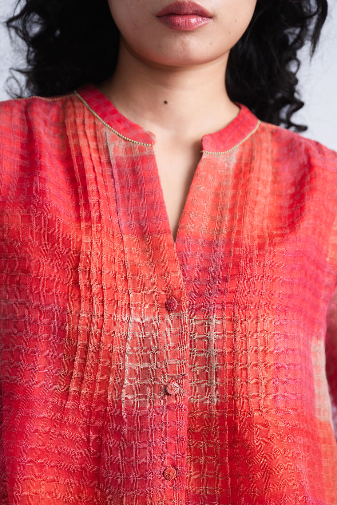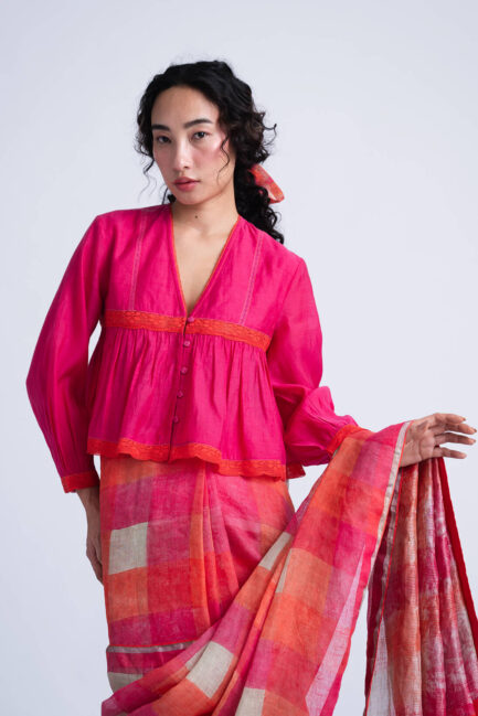 The Sombra Sun Blouse features an relaxed bodice silhouette crafted in block printed soft checkered linen silk, highlighted with delicate pintucks and hand-embroidered beaded seams.