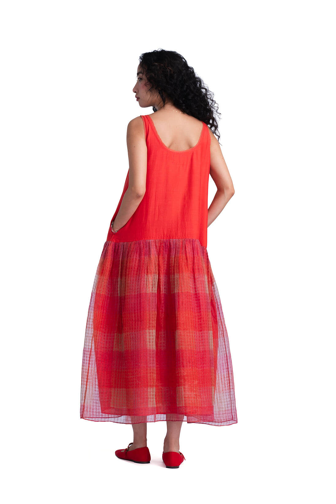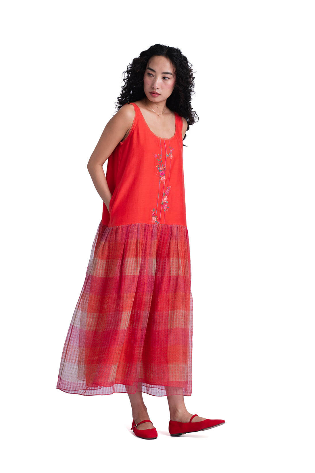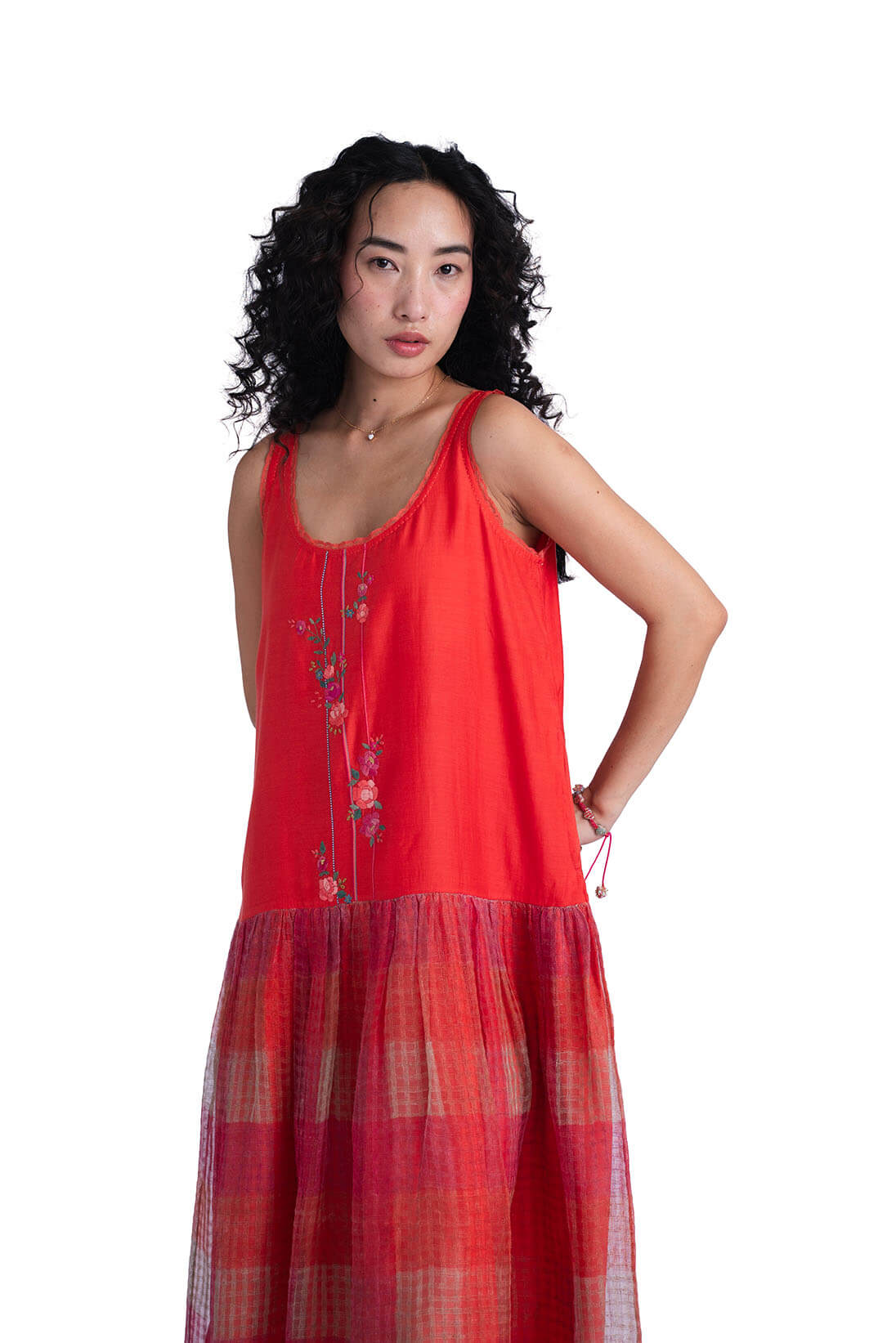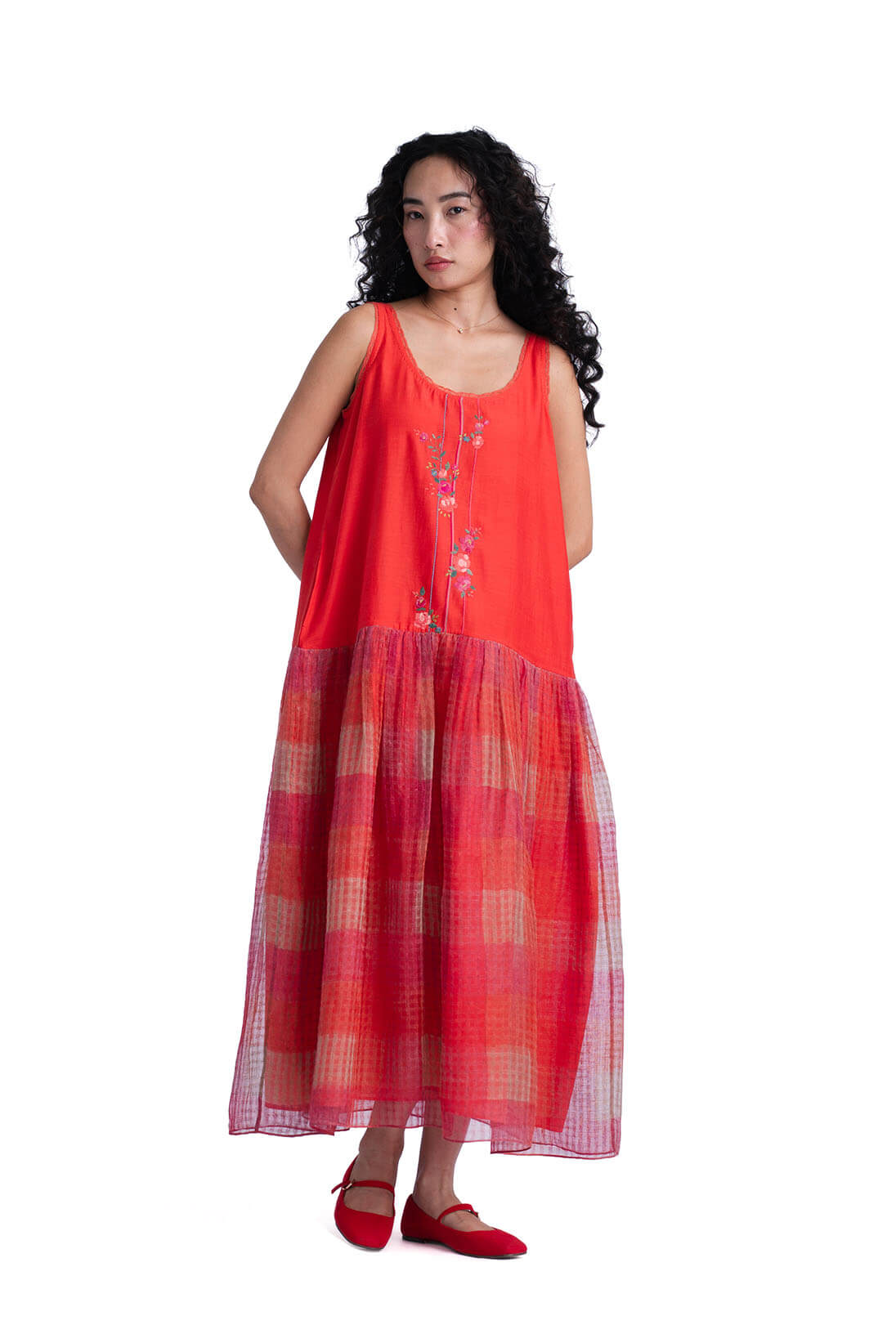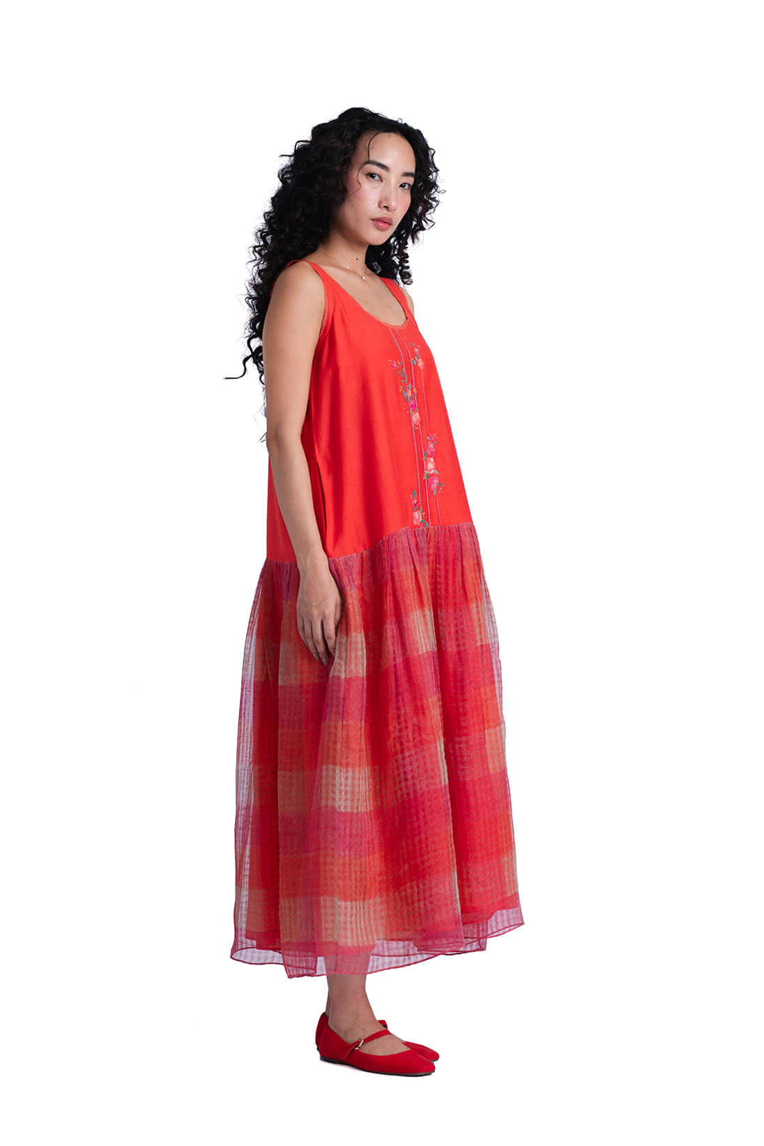 The Sombra Sun Dress comes with khadi silk bodice decorated with linear applique flowers and a soft checkered hand block printed skirt. It has a effortless summer charm to it and can be styled with sombra sun shirt.