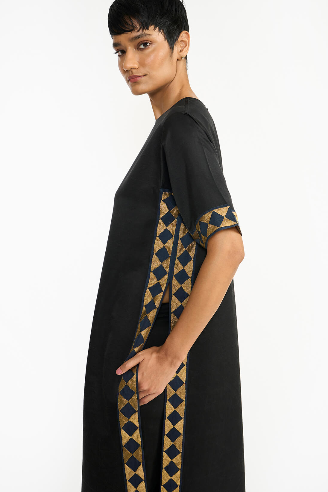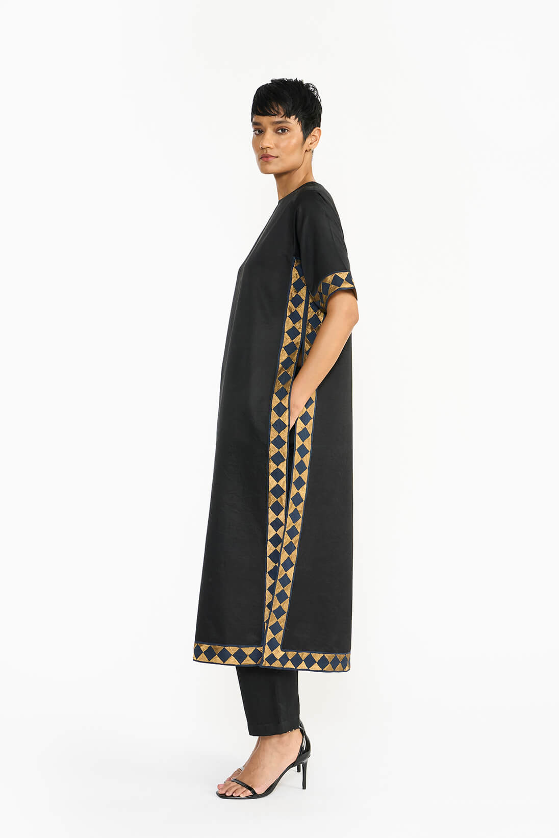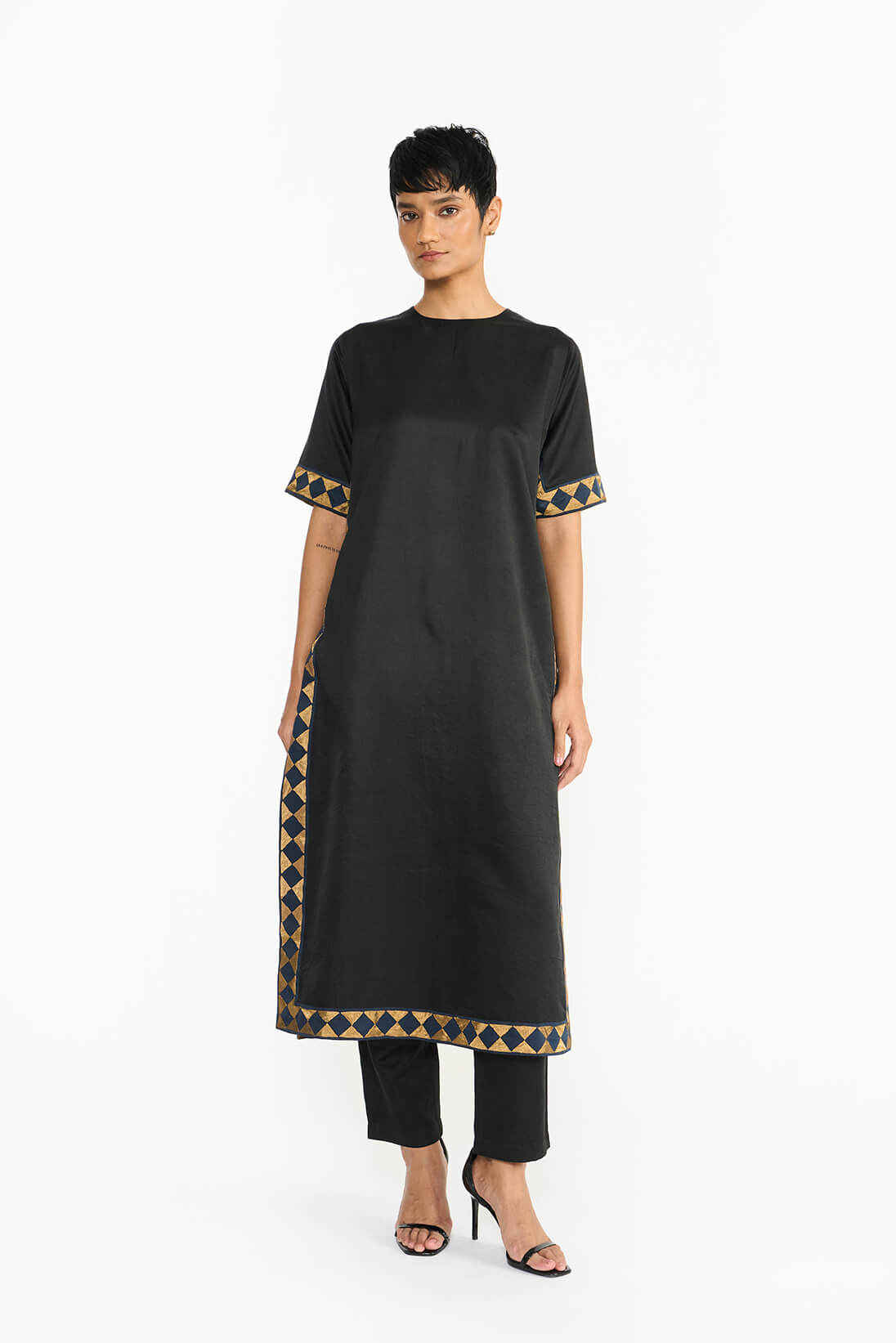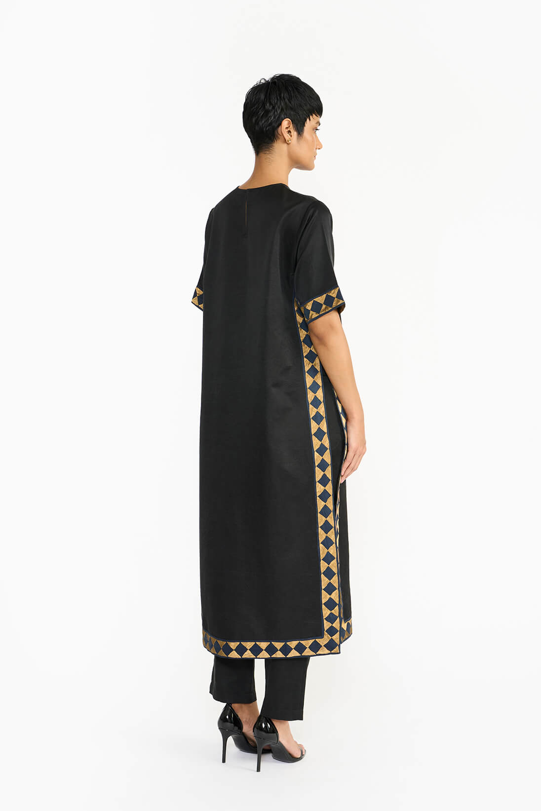 The Athangudi kurta set draws inspiration from the iconic floor tile patterns of Karaikudi. It features a hand-appliquéd border with a subtle geometric motif, enhancing its elegant aesthetic. The straight silhouette and clean lines allow the satin to drape beautifully, lending a formal appeal. The handmade Athangudi tile pattern and delicately embroidered appliqué add a unique, human touch, infusing the piece with warmth and character.