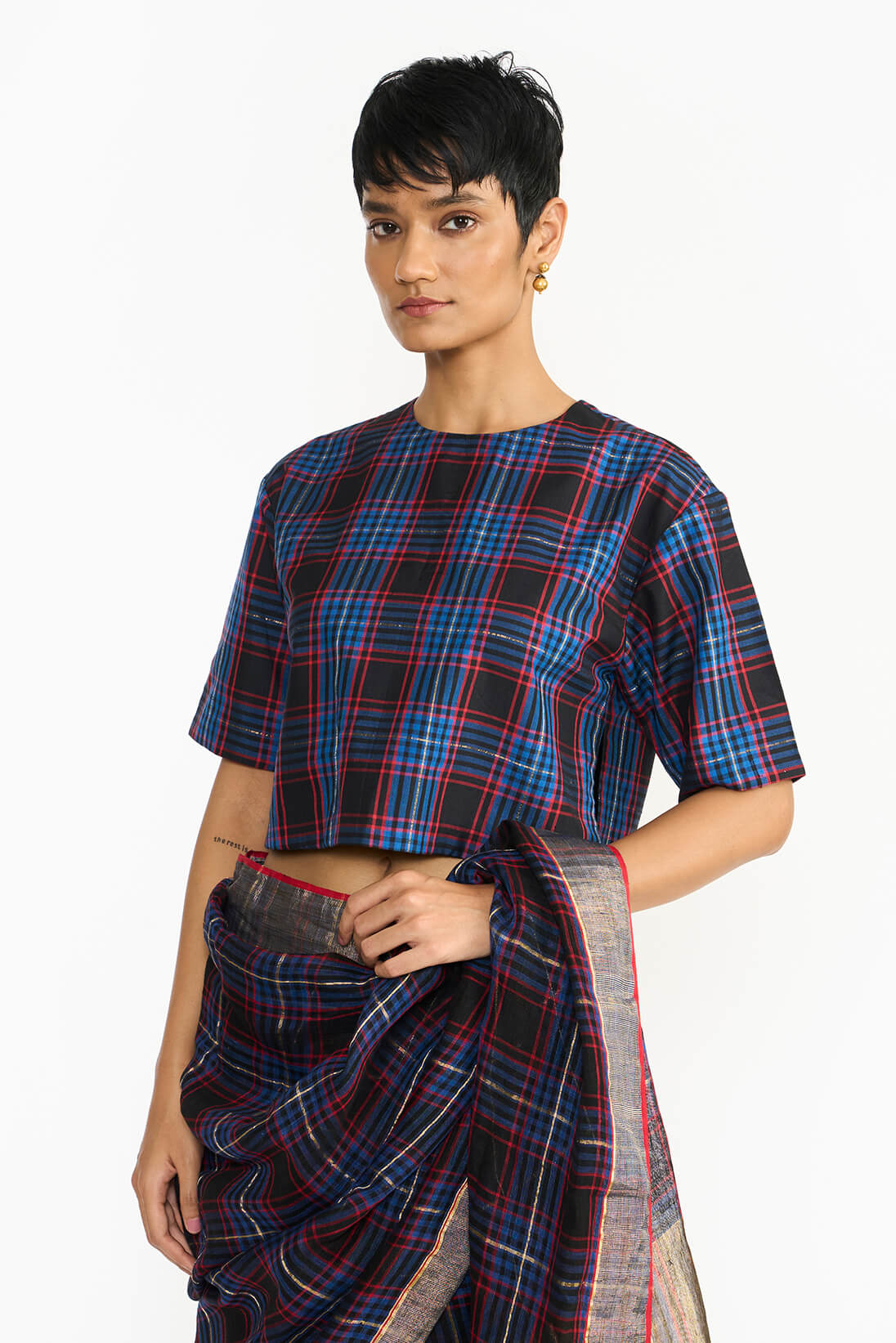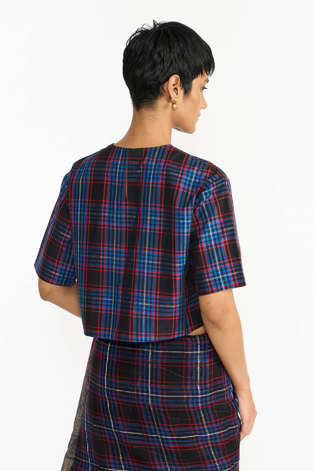 The Checkered Vanti blouse exquisitely crafted with fine hand spun silk woven on handloom checkered pattern inspired by the intricate line drawings from the blueprints of historic Chettinad mansions, features a relaxed boxy fit similar to basic indian bandi bocide.