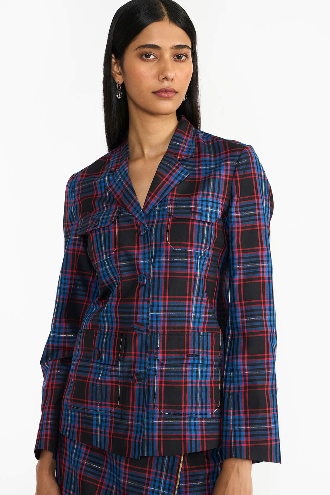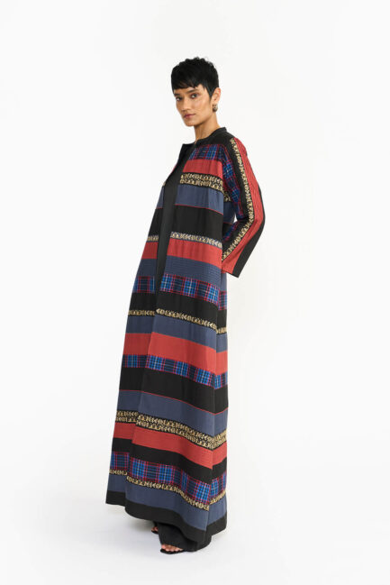 The black Kanit Jacket is exquisitely crafted with fine spun silk on handloom, featuring a bold black base with red and blue checks and subtle gold streaks, it reflects exceptional craftsmanship went into planning and mapping those beautiful mansion. Historically worn by Chettiar men, the jacket highlights their deep connection to travel as an essential aspect of their lifestyle.