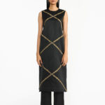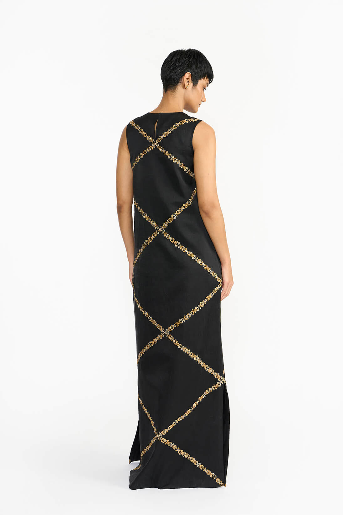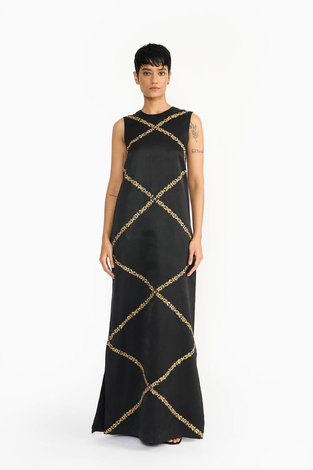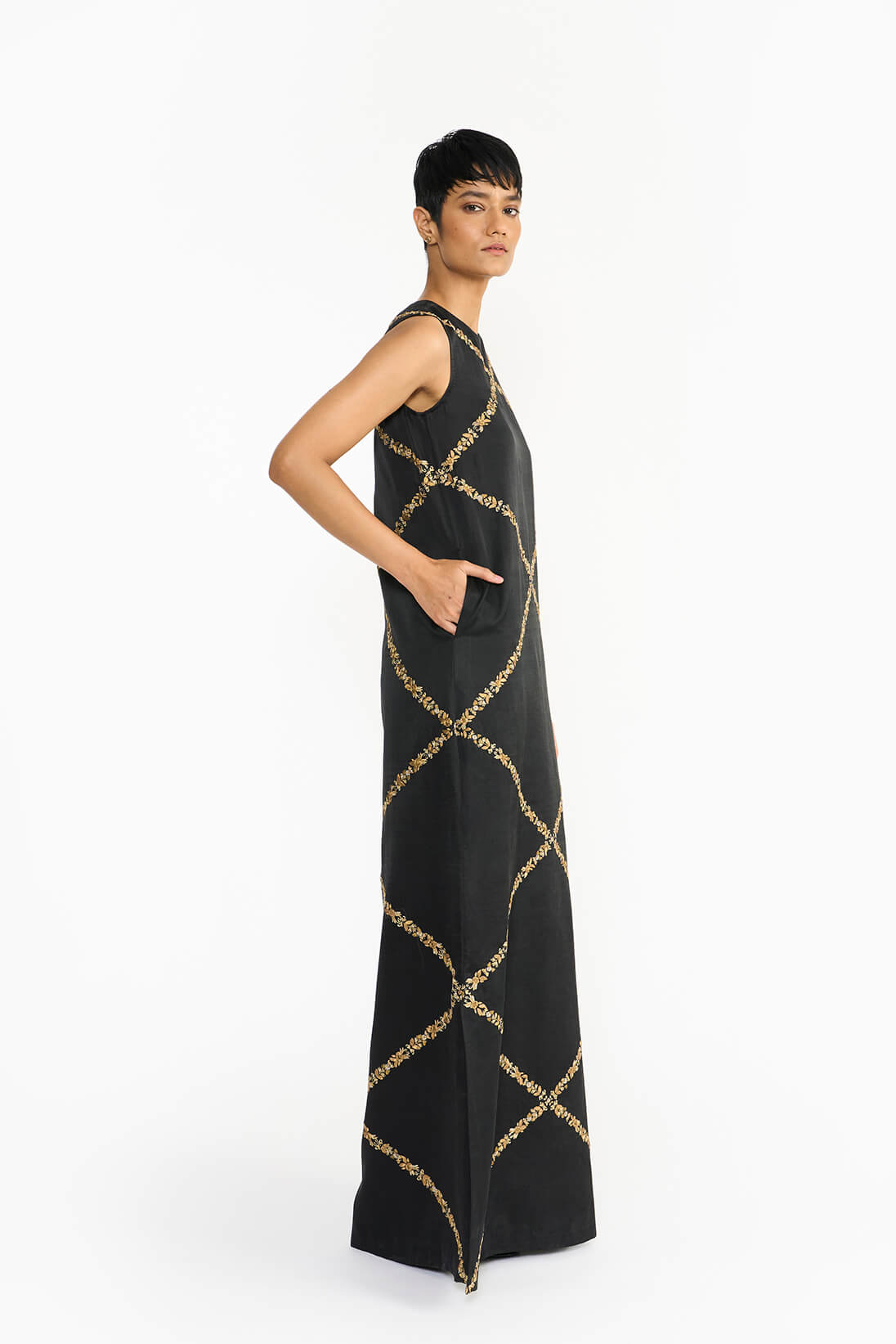 Inspired by the gold-painted doorway crafted from a single piece of wood, the Vairam dress features a diamond-patterned lattice jaal using intricate hand appliqué and embroidery in rich shades of gold on a black handwoven satin base, reflecting the elegant contrast of polished carvings, where parts are adorned in gold while others are finished with a darker wood polish.