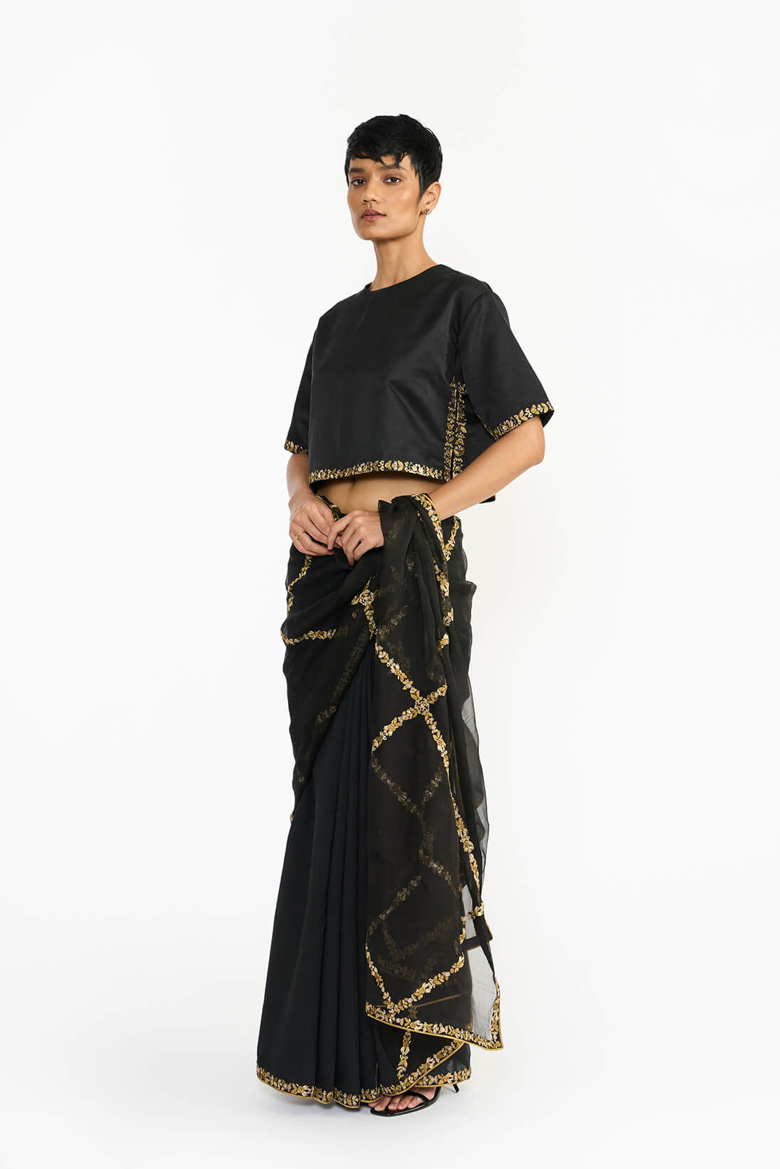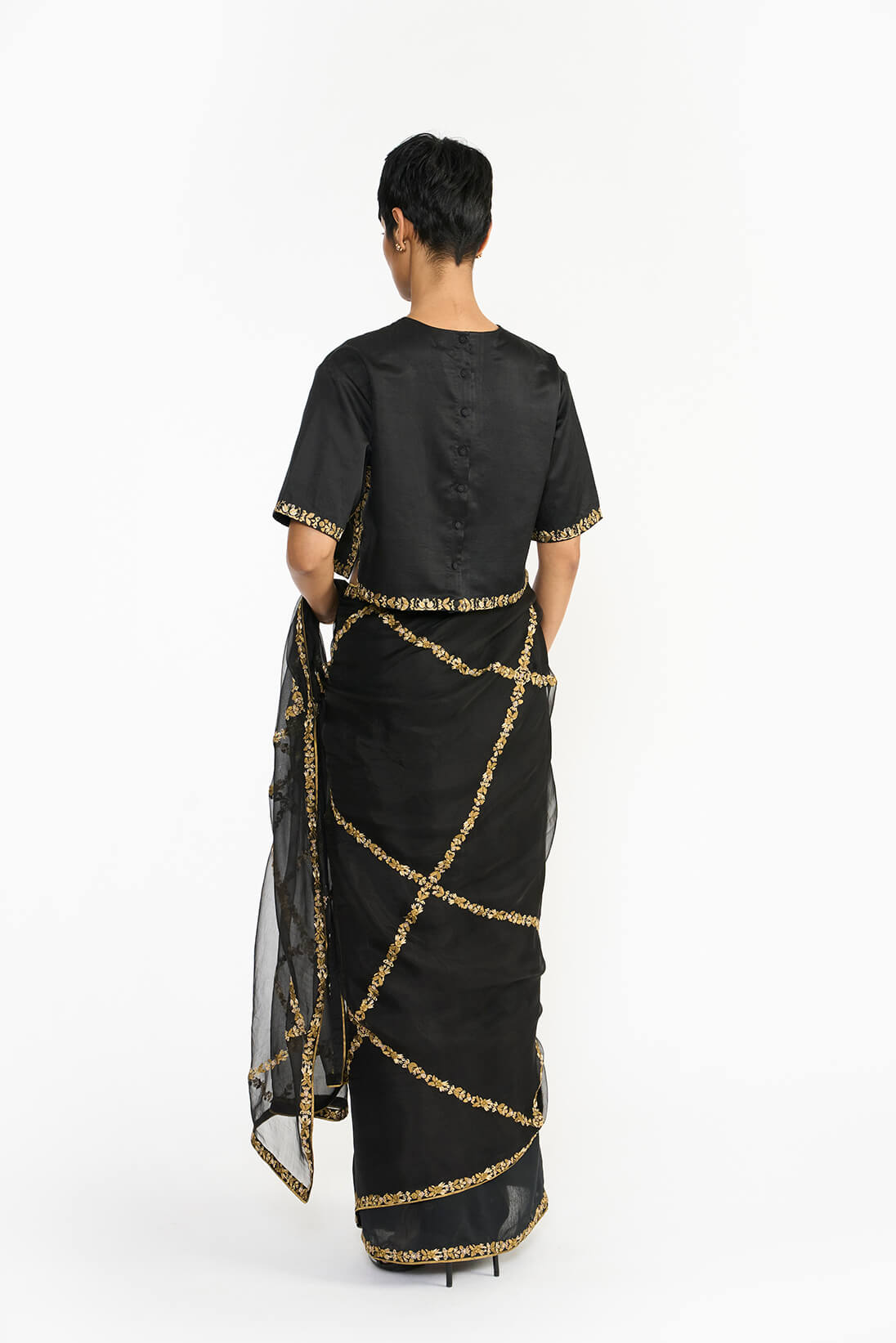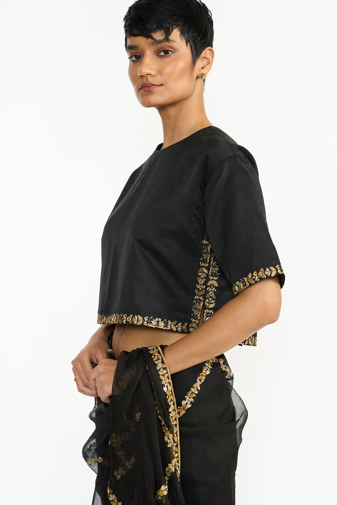 Vanti blouse, drawing from basic indian bandi bocide from tamil nadu features a relaxed boxy fit and katavu embroidery deatils on edges and sides seams framing the body.