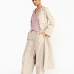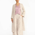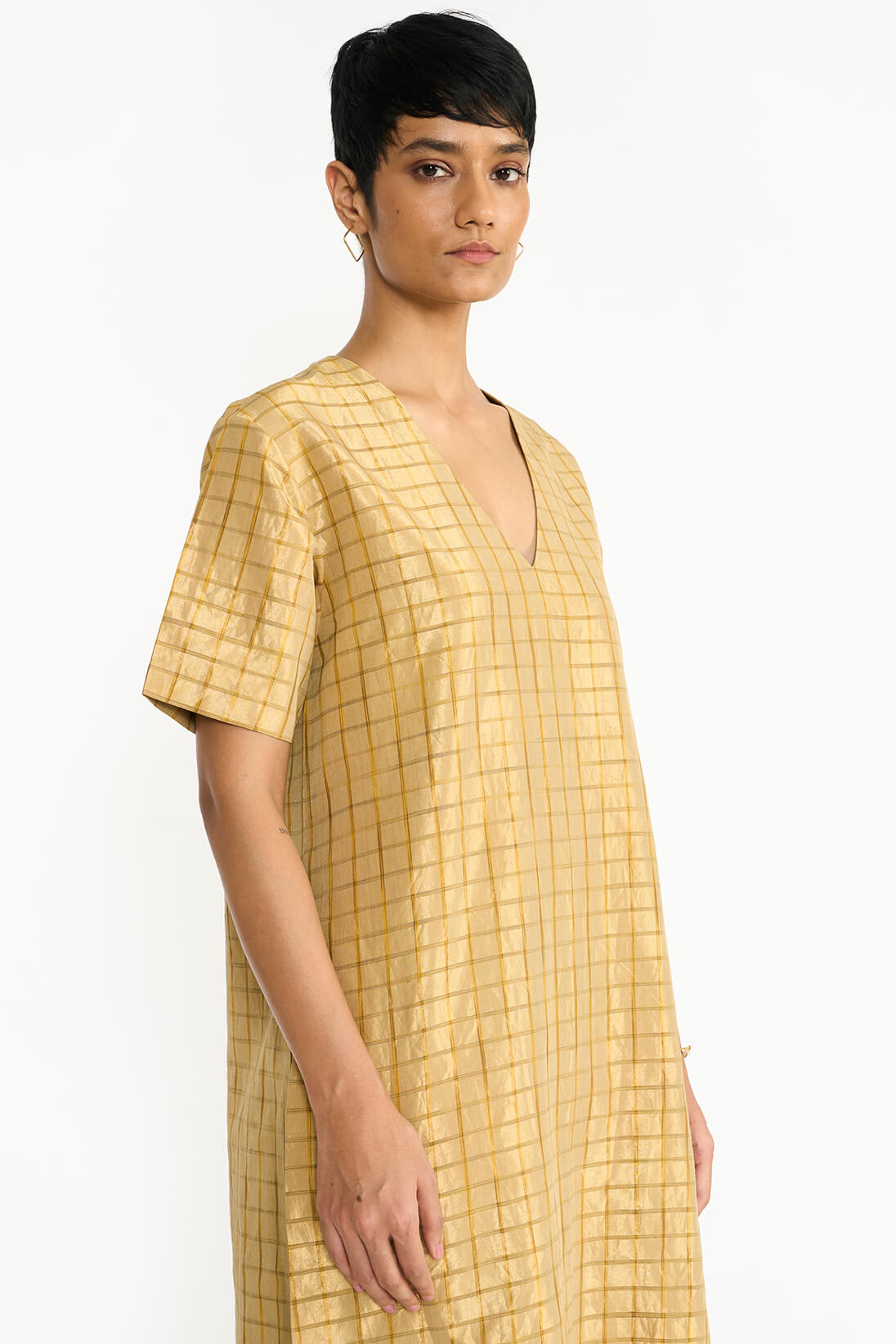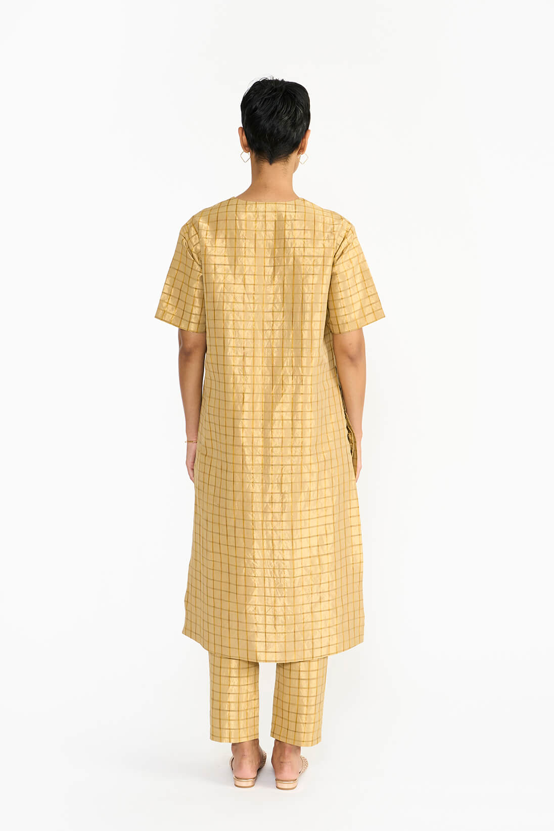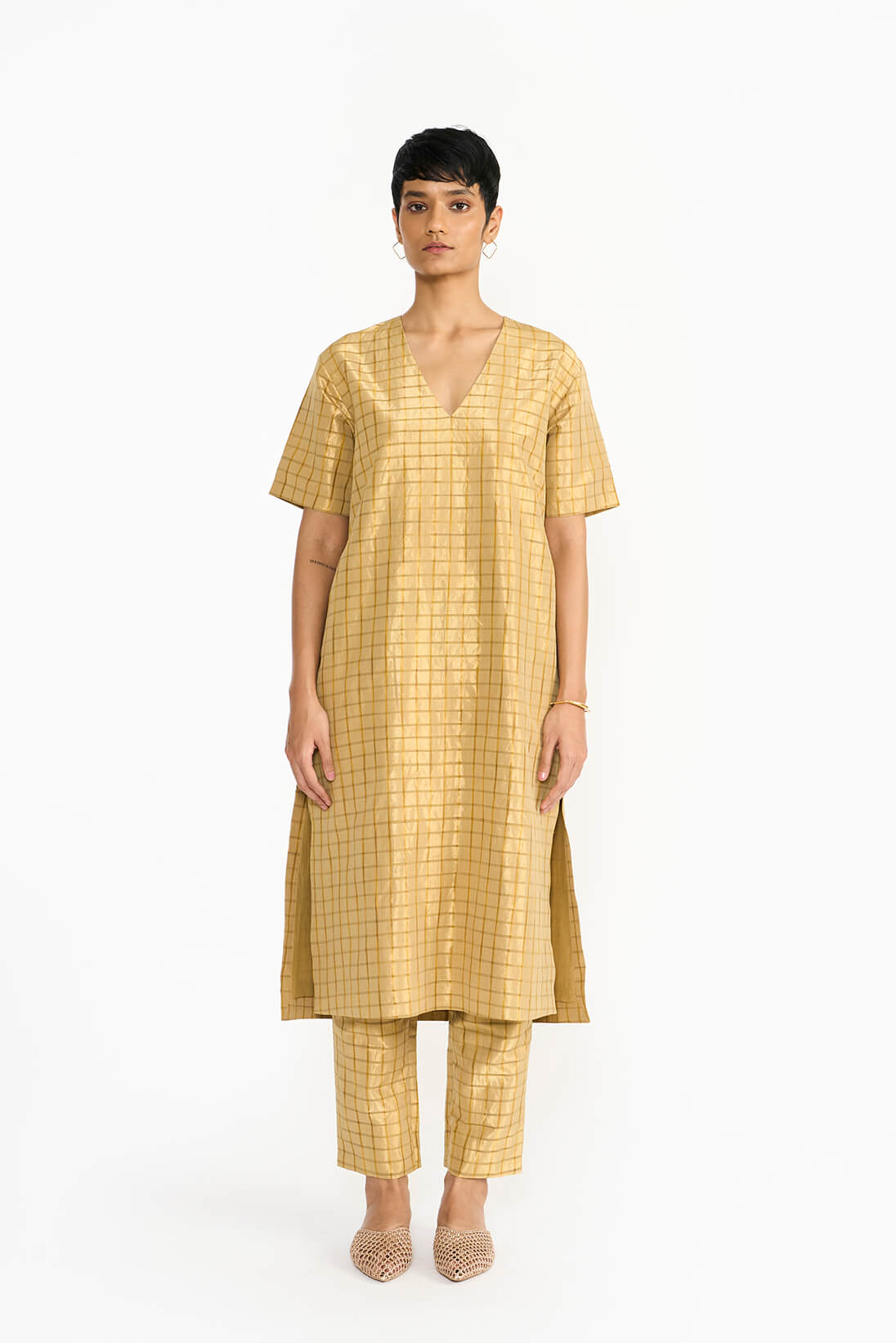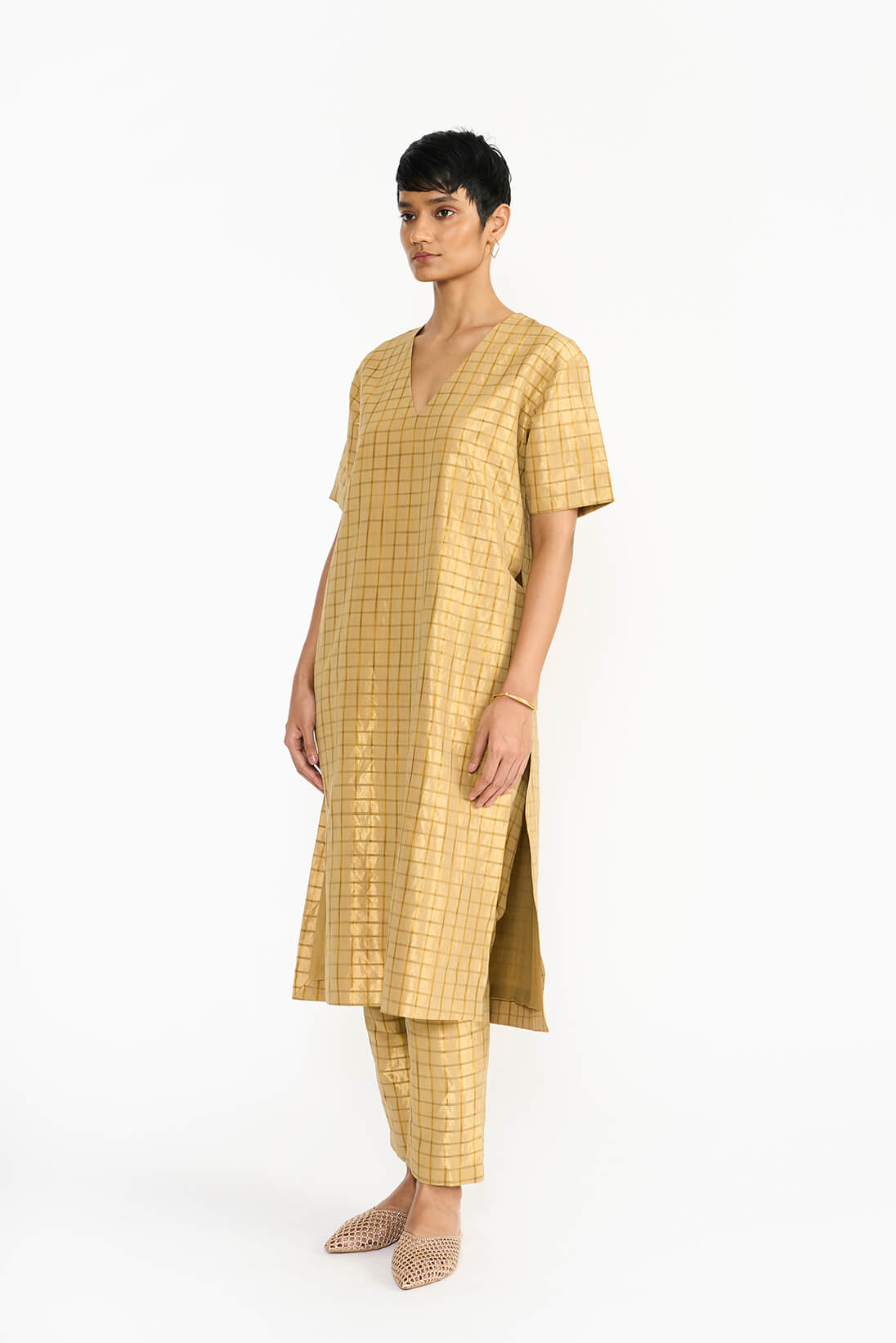 The Visiri kurta set draws inspiration from the intricate architecture of the famous Chidambara villas in Chettinad, reflecting the design of a back courtyard created specifically for women. Made from a distinctive handwoven textile, it showcases a striking checkered pattern in monochromatic ochre silk yarns on a gleaming gold metallic base. Its relaxed fit and clean silhouette with a soft V neckline embody the opulence of the Chettiar lifestyle.