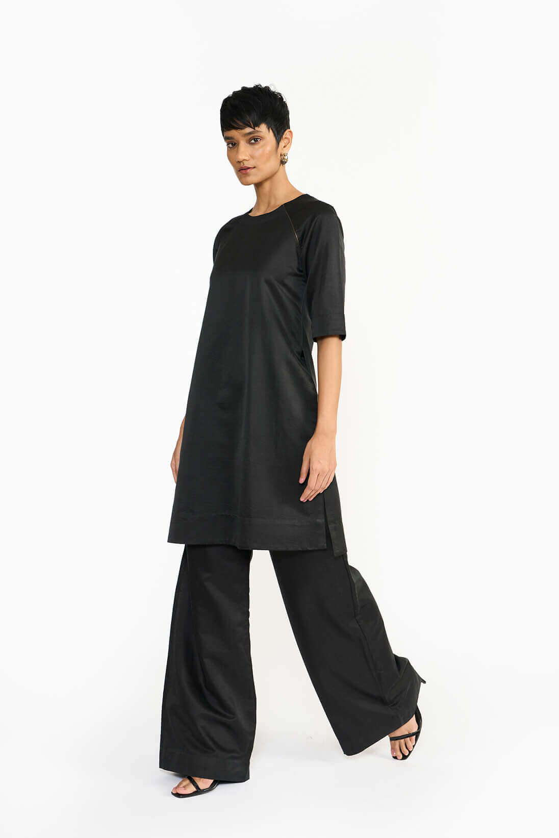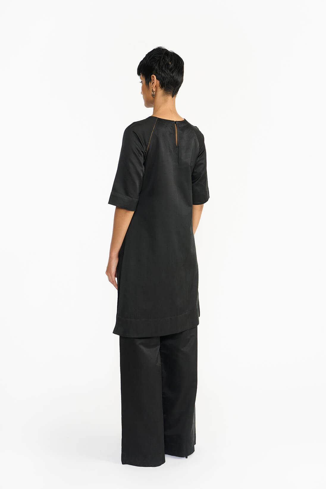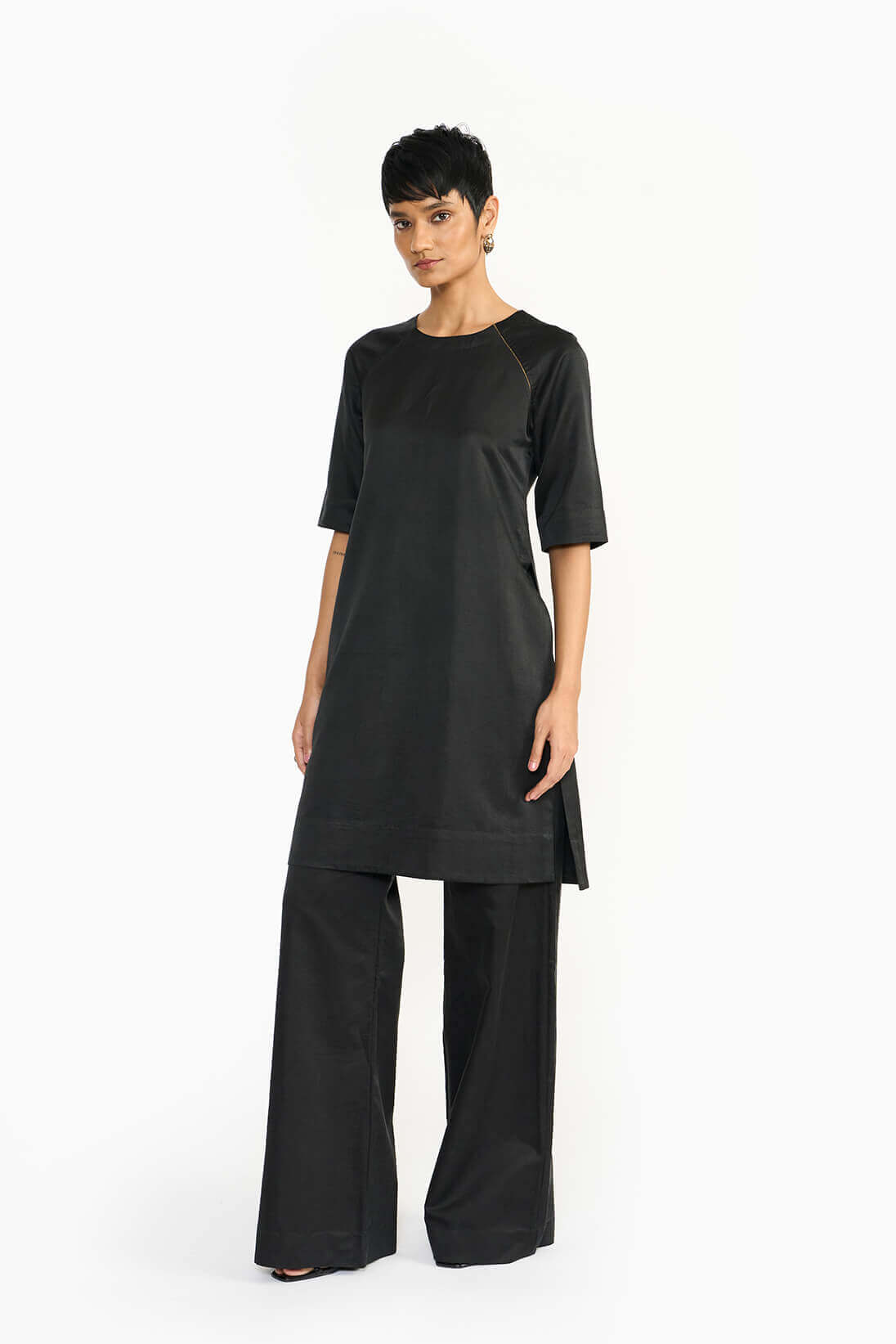 The Iravu tunic set showcases our signature raglan sleeve design in a versatile short tunic, complemented by wide-leg trousers for a stylish edge. Crafted from premium handwoven silk satin, it offers both elegance and comfort.