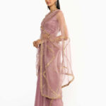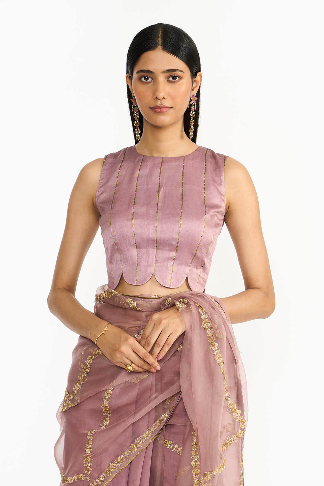 Arched windows are a key element of Chettinad architecture.Pariti blouse transforms those arched patterns through meticulous tailoring and precise joinery. The design is accentuated with gold piping.”