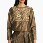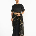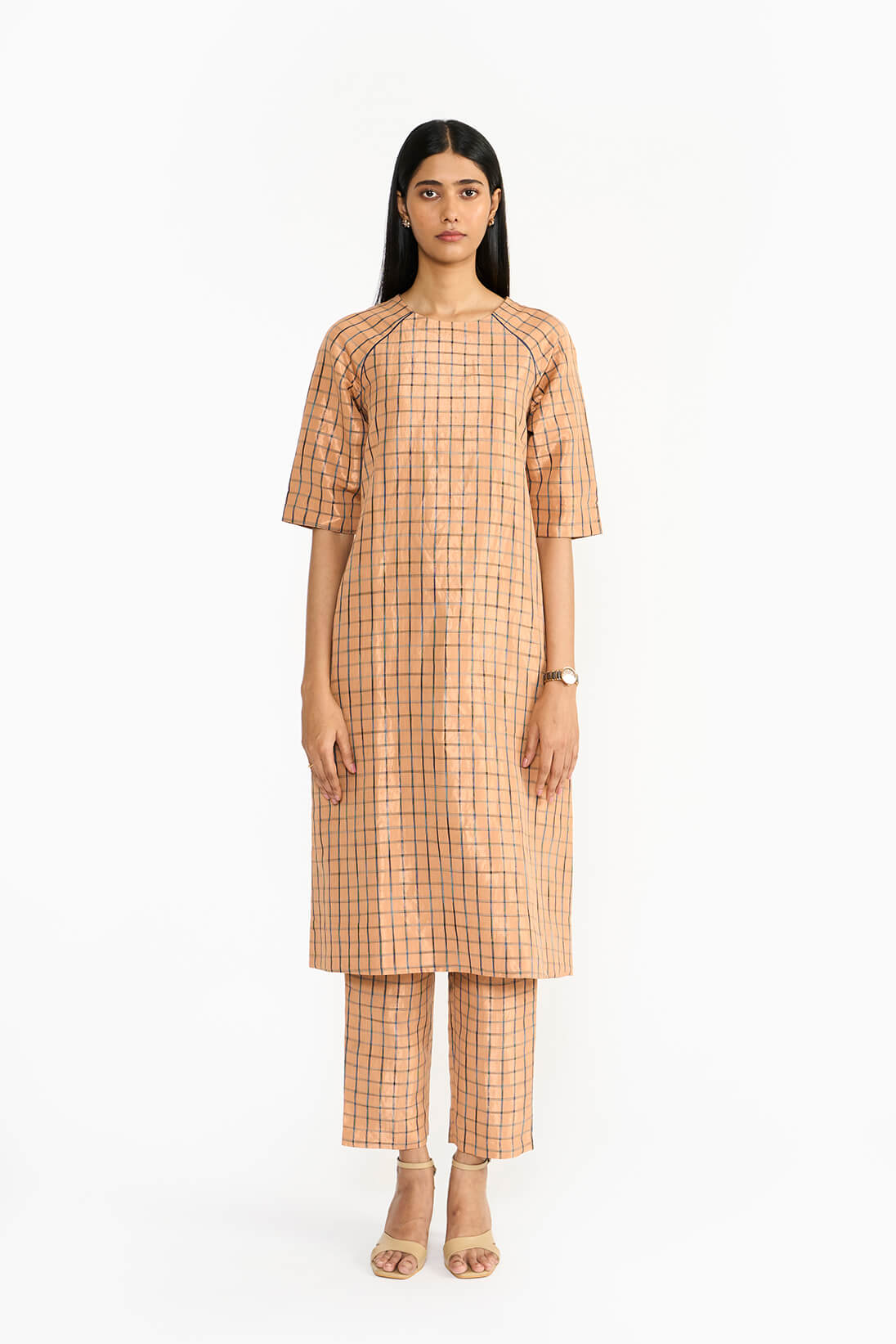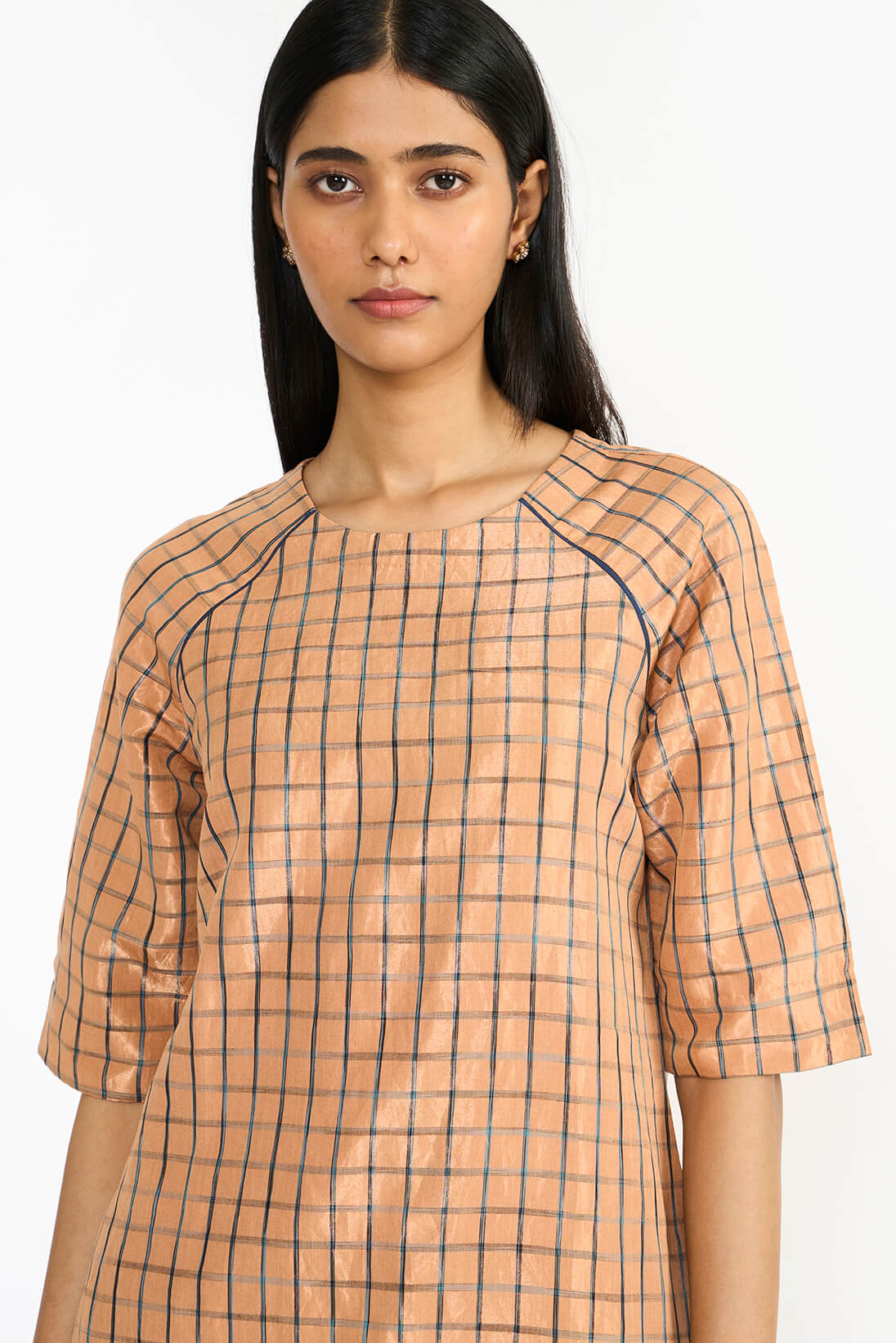 The Classic Nova set is reimagined in a new light, crafted from a distinctive handwoven textile that features a striking checkered pattern in monochromatic black to blue linen yarns on a gleaming silver metallic base. Its relaxed fit and the fabric’s festive sheen evoke a sense of refined elegance, capturing the essence of rich cultural heritage of the buildings.