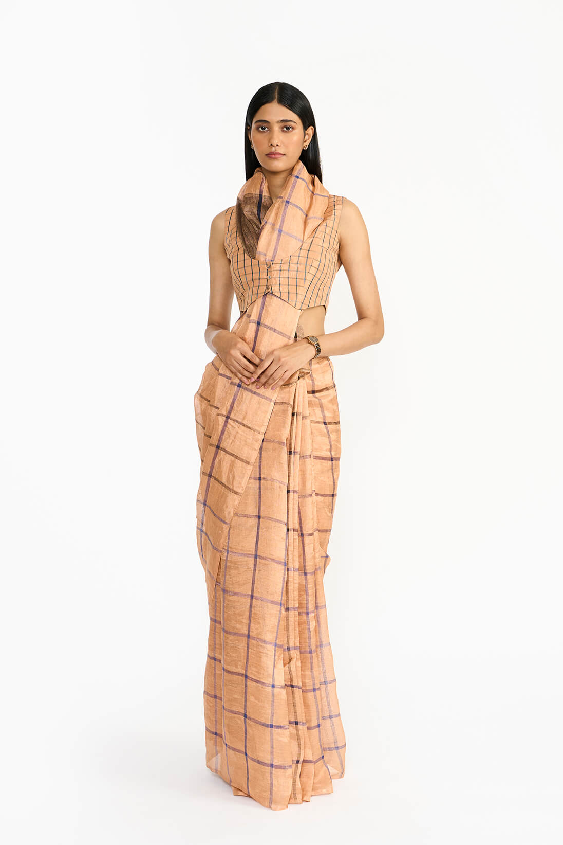 The Chidambara Waistcoat is inspired by the intricate architecture of the famous Chidambara villas in Chettinad, celebrated for its opulence and cultural heritage. Crafted from a distinctive handwoven textile, it showcases a striking checkered pattern in monochromatic black to blue silk yarns in a bold checkered pattern, set against a rose gold metallic base. The silhouette pays homage to the travel jackets worn by old Chettiar men, reflecting their deep connection to travel as a vital aspect of their lifestyle.