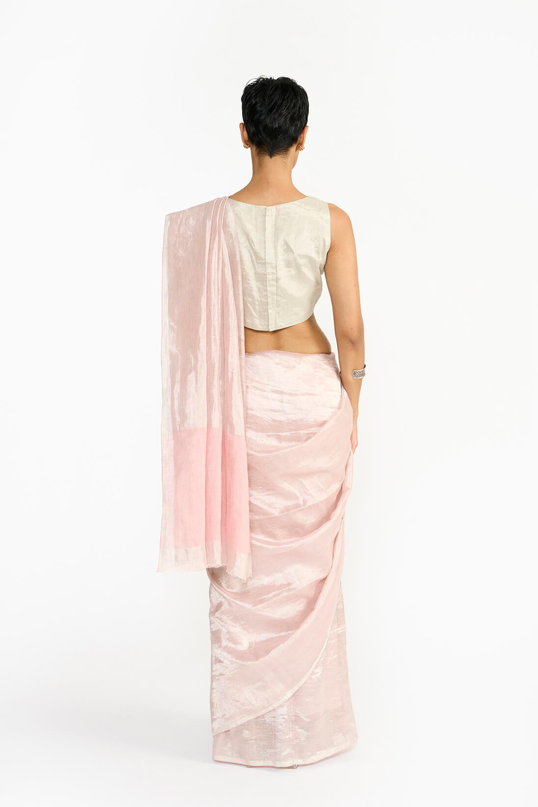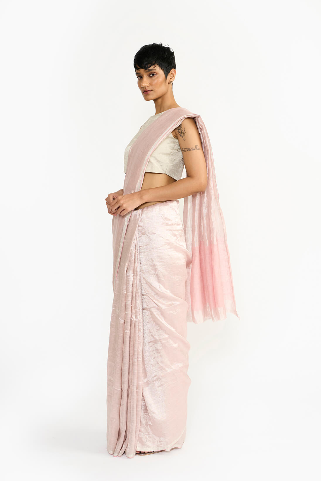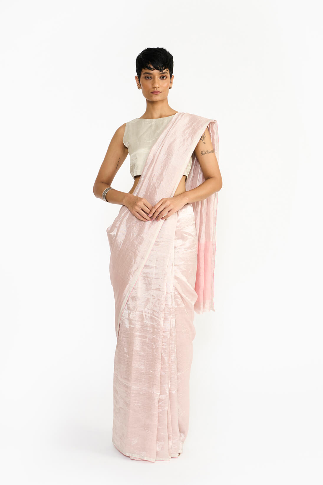 The Karai sari draws inspiration from sunlight hitting the waves at the seashore, capturing the glittering effect that dances across the water’s surface. This classic linen zari sari is reimagined with a fresh perspective, featuring pastel-hued selvedges that beautifully complement the shimmering body, creating a harmonious blend of minimalism and elegance.