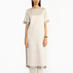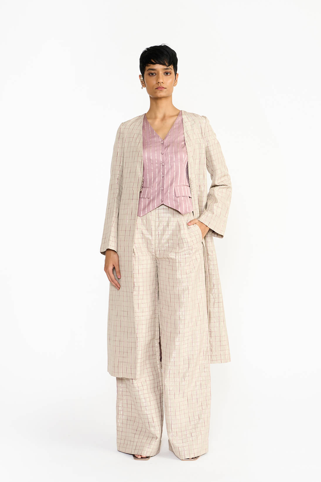 The Chidambara jacket is reflects upon the architecture of the renowned Chidambara villas in Chettinad, celebrated for their opulence and cultural heritage. Crafted from a distinctive handwoven textile, it features a striking checkered pattern in monochromatic pink silk tie dyed yarns, contrasted by a shimmering silver metallic base. The silhouette pays homage to the travel jackets worn by old Chettiar men, reflecting their deep connection to travel as a vital aspect of their lifestyle.