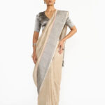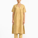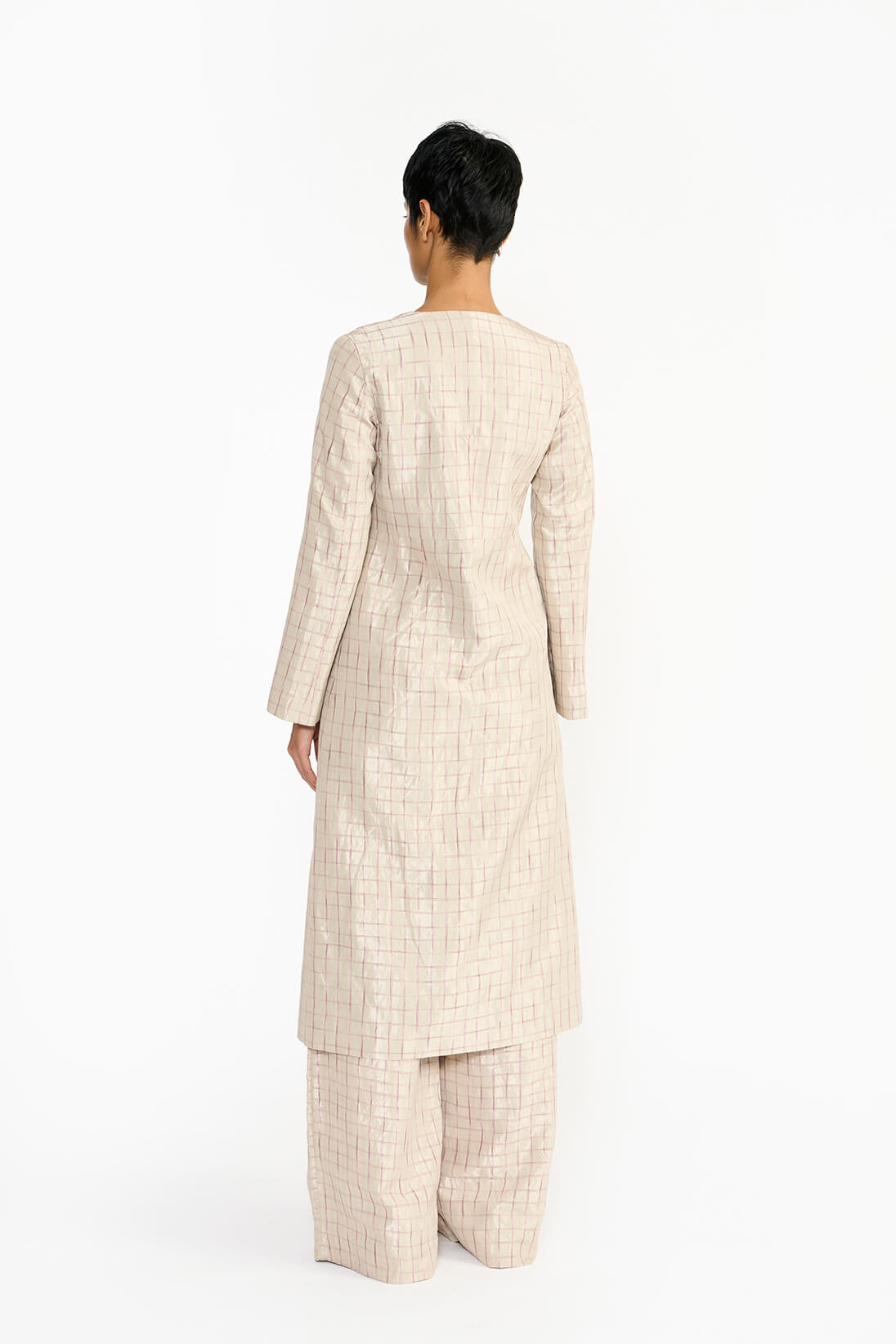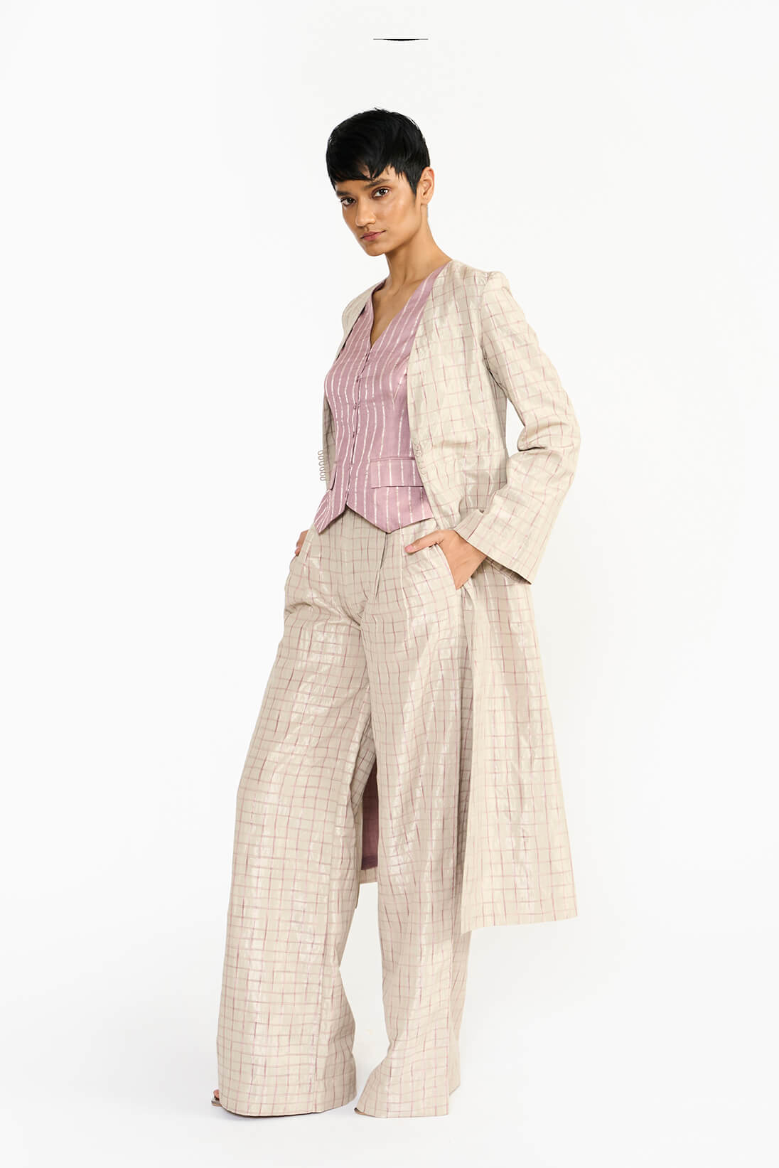 The beautiful interplay of tie dyed soft pink checks makes this silver trouser unique and exquisite.