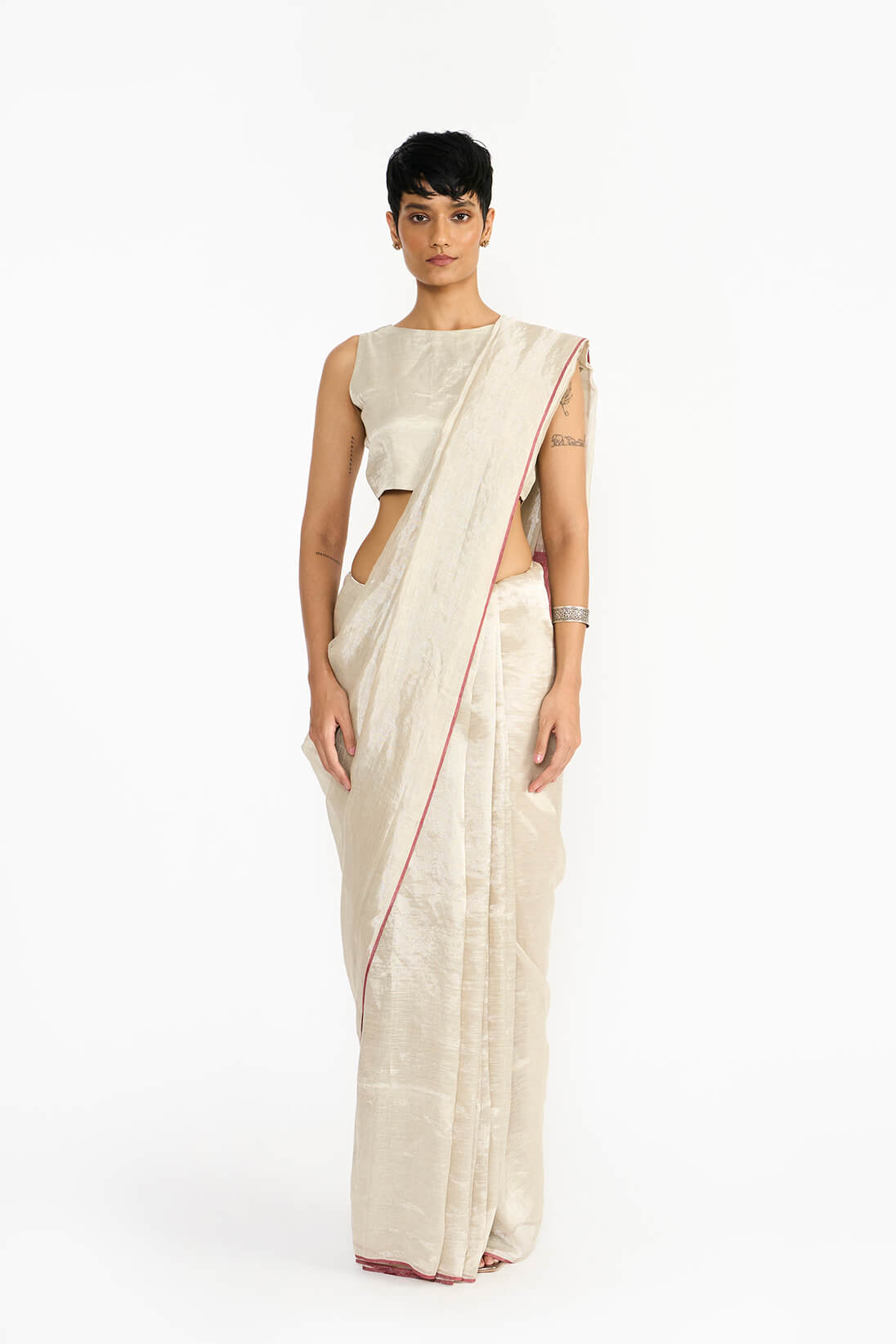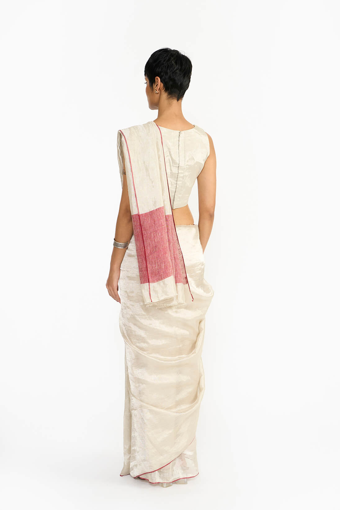 The Karai sari draws inspiration from sunlight hitting the waves at the seashore, capturing the glittering effect that dances across the water’s surface. This classic linen zari sari is reimagined with a fresh perspective, featuring deep colored pallu & selvedges that beautifully complement the shimmering body, creating a harmonious blend of minimalism and elegance.