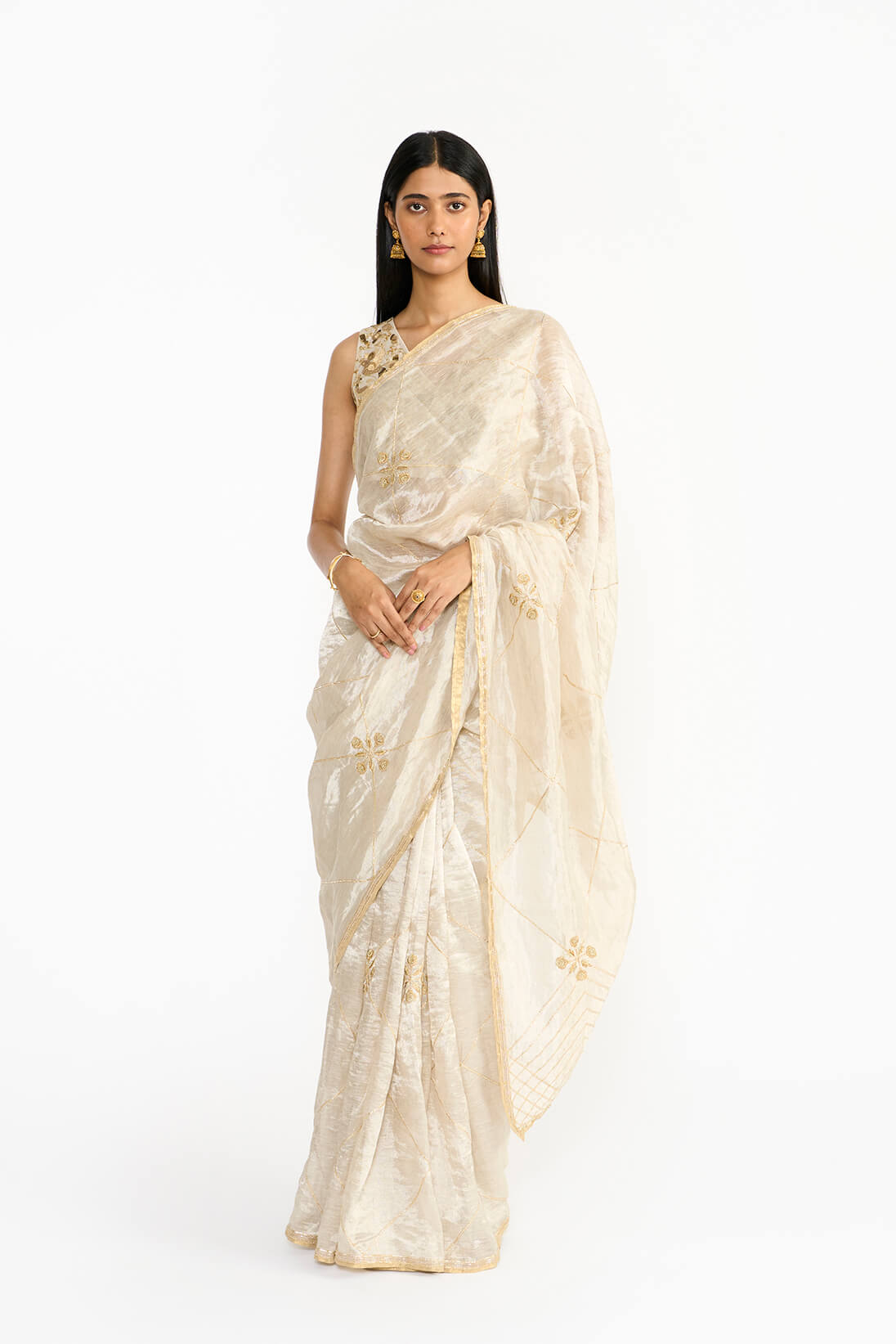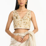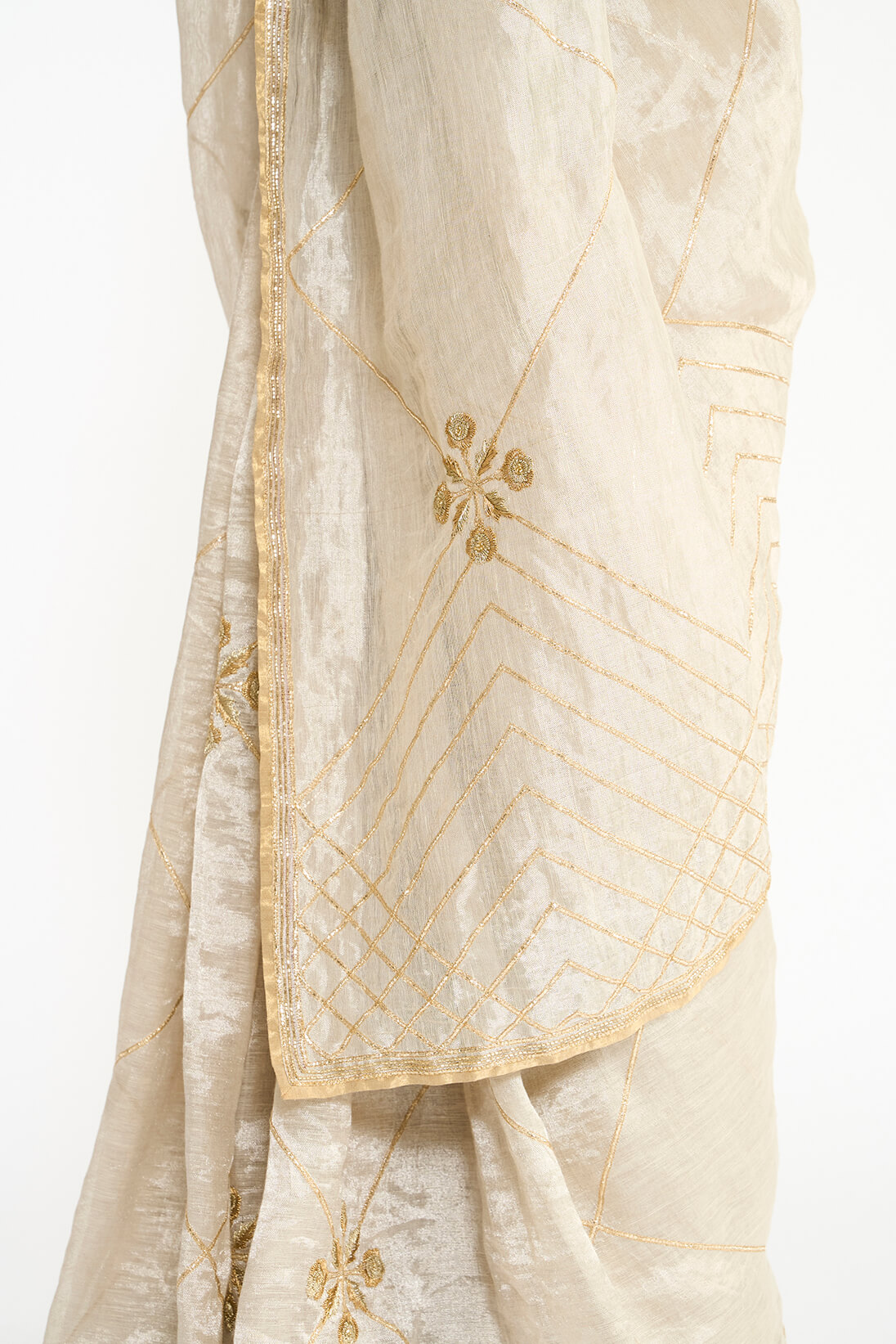 Malar, meaning “flower” in Tamil, is inspired by classic Athangudi tiles. It is embroidered with materials such as zari, dabka, and beads, creating a distinct tile pattern where each intersection of tiled corners is adorned with a delicate floral bouquet, enhancing its visual appeal. The sari is made from the brand’s signature silver zari linen, emphasizing the intricate craftsmanship of handwoven textiles.