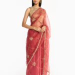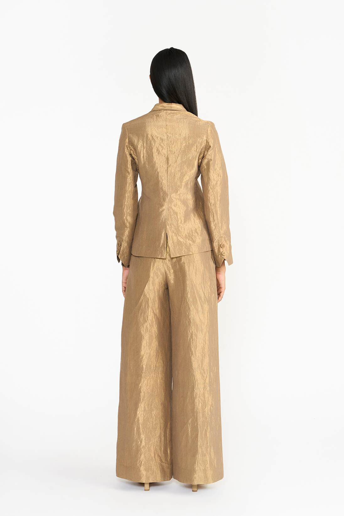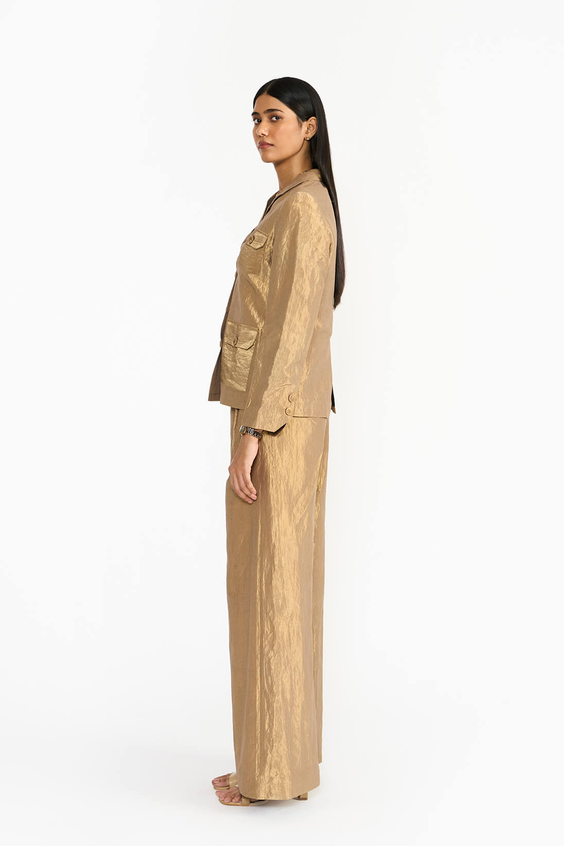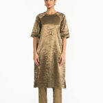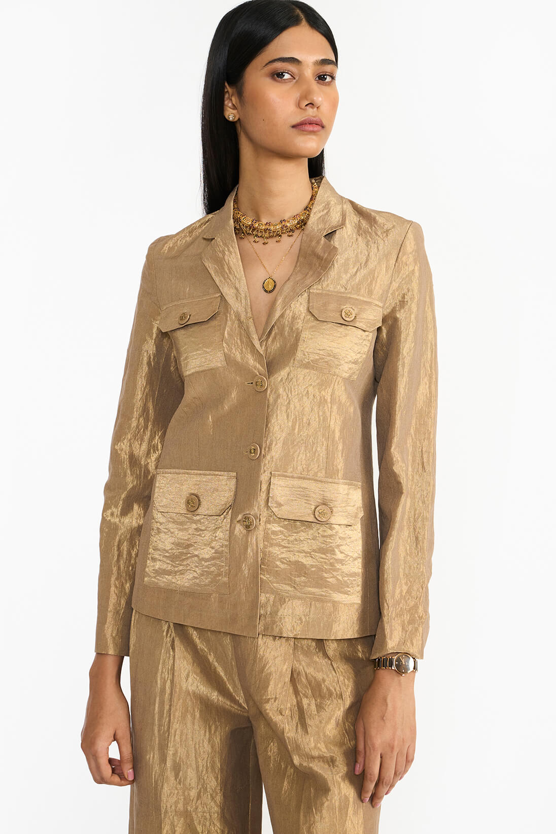 Drawing inspiration from early 1900s safari travel jacket, the Tankam jacket showcases four patch pockets placements. Its sleek, short-collared silhouette is crafted from metallic fabric which captures light beautifully. Historically worn by Chettiar men, the jacket highlights their deep connection to travel as an essential aspect of their lifestyle.
