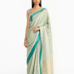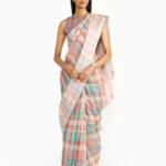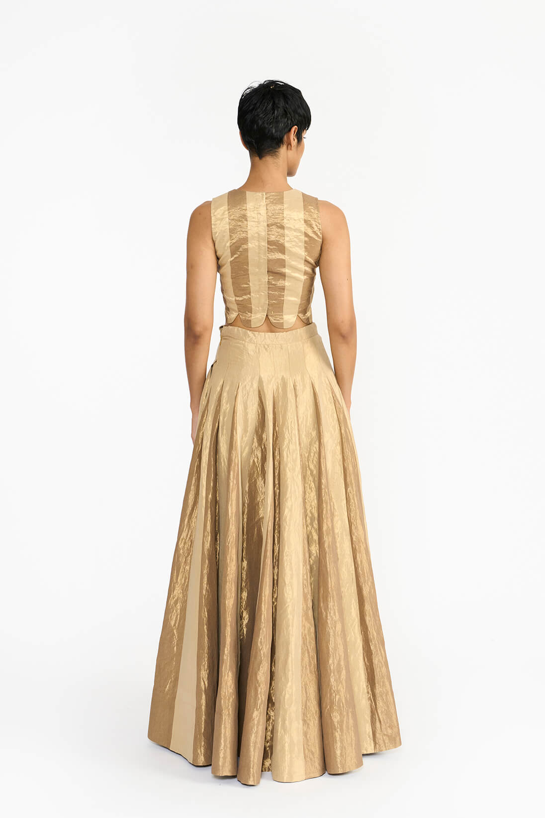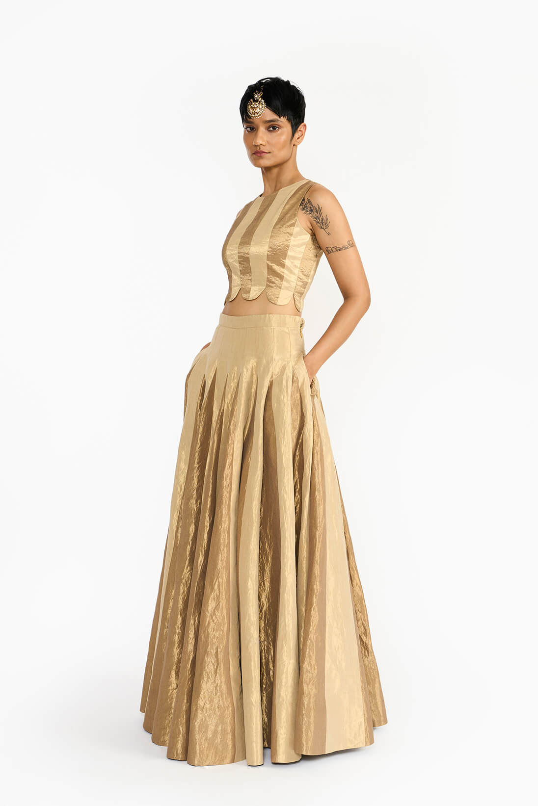 Tankam lehenga & blouse set showcases alternating panels of dull gold and charcoal gold zari, combining old-world charm with a contemporary twist. Drawing inspiration from Chettinad’s architectural and textile heritage, it features a new fabric woven with metallic yarns for a sophisticated aged gold effect. Versatile in style, it can be paired with a dupatta for festive occasions or worn alone for a chic cocktail evening.