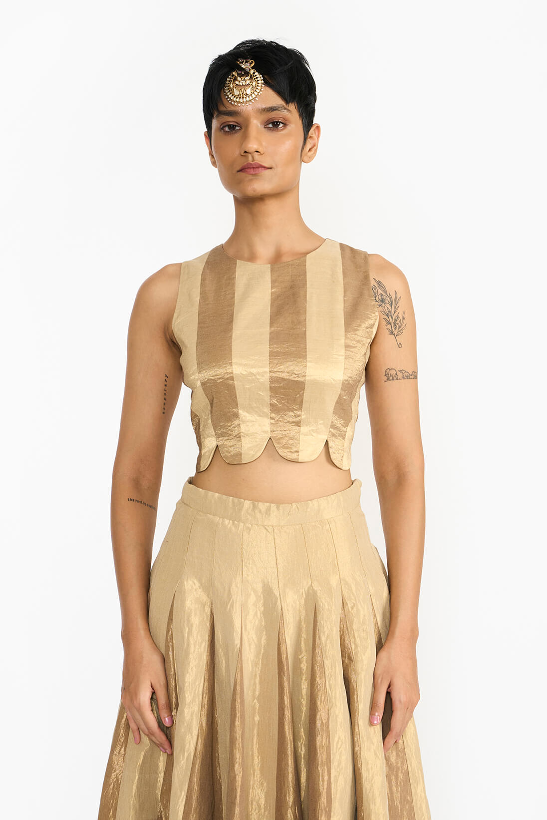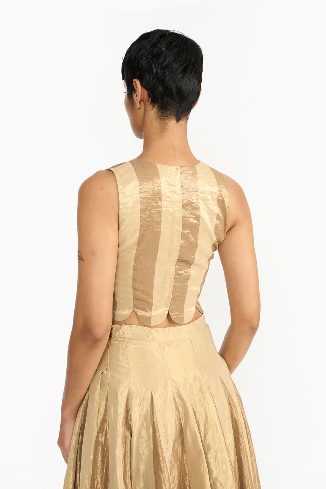 Arched windows are a key element of Chettinad architecture. Pariti blouse transforms those arched patterns through meticulous tailoring and precise joinery. The design is accentuated with gold piping in a different tone, translating the architectural inspiration into a sophisticated product that reflects the heritage and craftsmanship in a clean bodice silhouette.