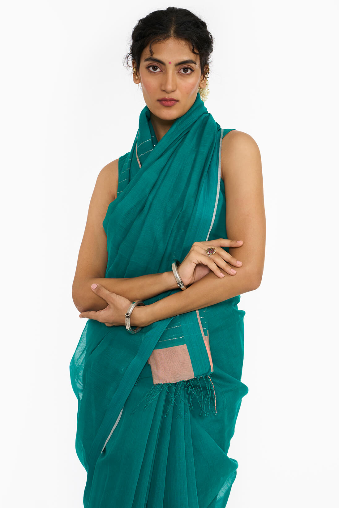 This fine handwoven khadi silk sari showcases textured self colored borders and vibrant contrast selvedges, ensuring it becomes a timeless staple in any wardrobe.